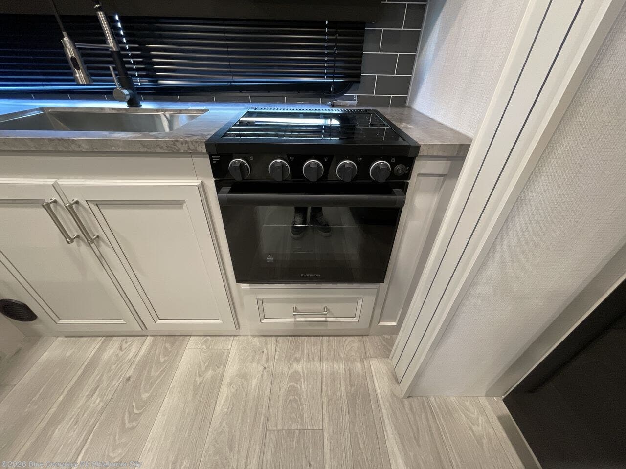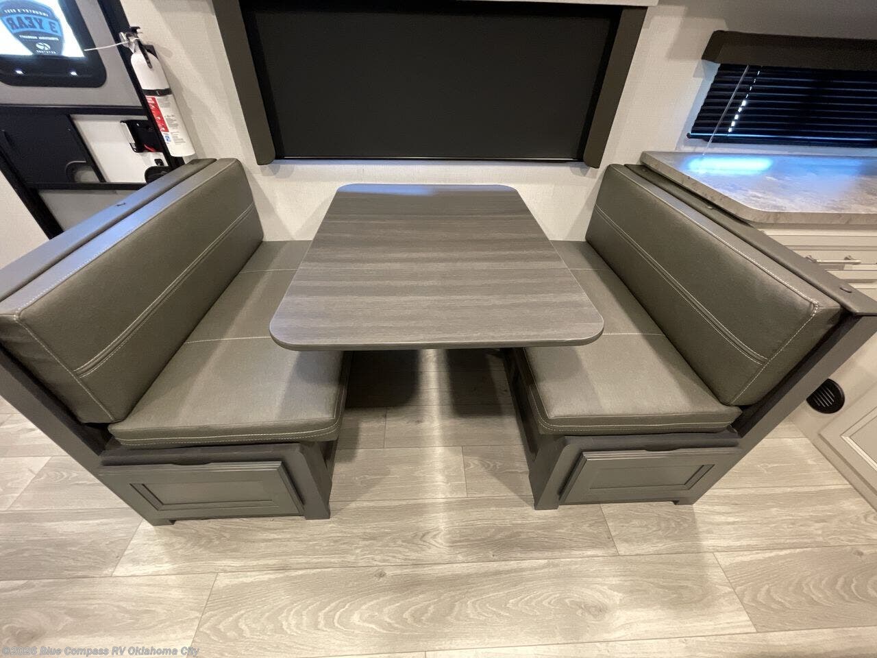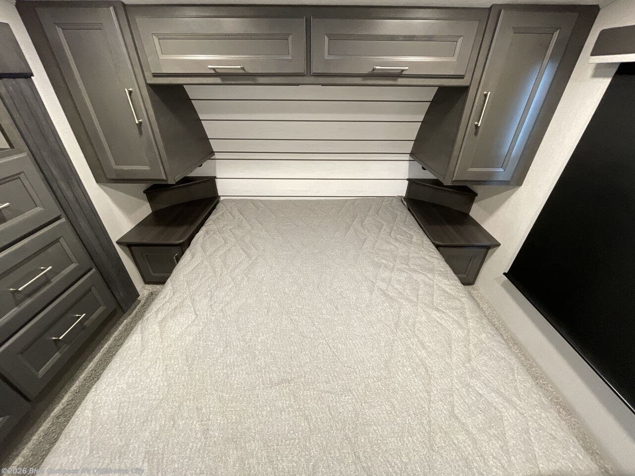 If you are looking for a fifth wheel that sleeps four to six with inside and outside cooking then check this unit out! This unit offers a short, mid-living layout with a bedroom wardrobe slide and combined 12 volt refrigerator and 68" tri-fold sofa sleeper slide for added floorspace to move about. Up front, you will enjoy a private bedroom with a queen bed and bedside wardrobe/nightstands as well as a larger wardrobe that slides out along the curbside wall. A complete bath provides a large shower, toilet and sink, plus linen storage which you are sure to appreciate as you travel. There are plenty of options for this unit making it easy to customize to your use and style. The theater seating and free standing dinette options can be selected in place of the sleeper sofa and booth dinette if you prefer. If you enjoy spending time outdoors, imagine making breakfast for your friends and family using the outside griddle. There is also a 16' awning to create even more living space to enjoy, and the unobstructed pass-through storage compartment can easily house all of your outdoor camping gear like lawn chairs and yard games.