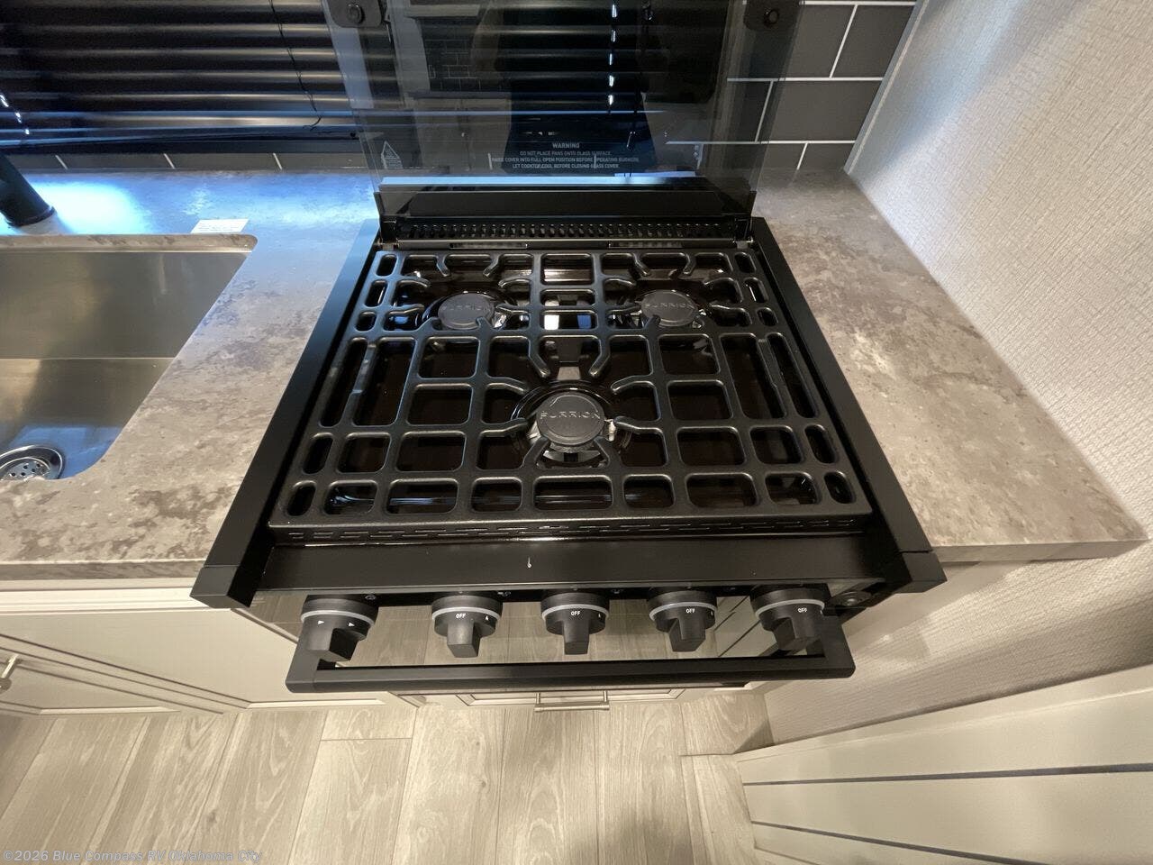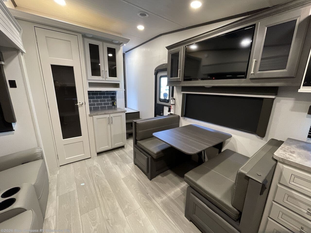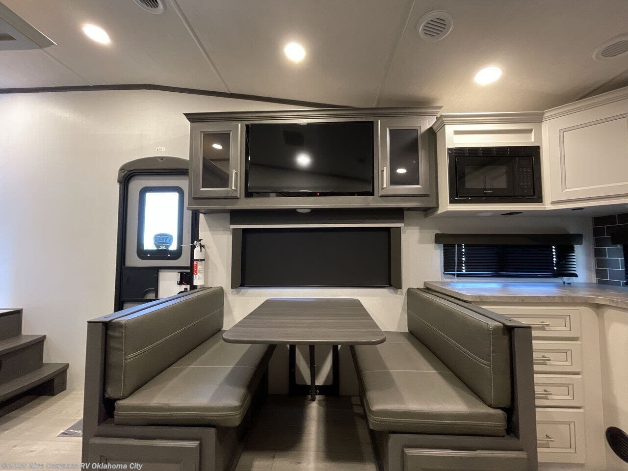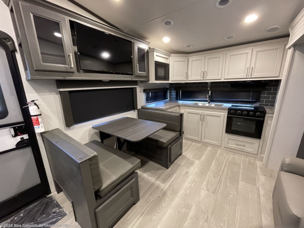 If you are looking for a fifth wheel that sleeps four to six with inside and outside cooking then check this unit out! This unit offers a short, mid-living layout with a bedroom wardrobe slide and combined 12 volt refrigerator and 68" tri-fold sofa sleeper slide for added floorspace to move about. Up front, you will enjoy a private bedroom with a queen bed and bedside wardrobe/nightstands as well as a larger wardrobe that slides out along the curbside wall. A complete bath provides a large shower, toilet and sink, plus linen storage which you are sure to appreciate as you travel. There are plenty of options for this unit making it easy to customize to your use and style. The theater seating and free standing dinette options can be selected in place of the sleeper sofa and booth dinette if you prefer. If you enjoy spending time outdoors, imagine making breakfast for your friends and family using the outside griddle. There is also a 16' awning to create even more living space to enjoy, and the unobstructed pass-through storage compartment can easily house all of your outdoor camping gear like lawn chairs and yard games.