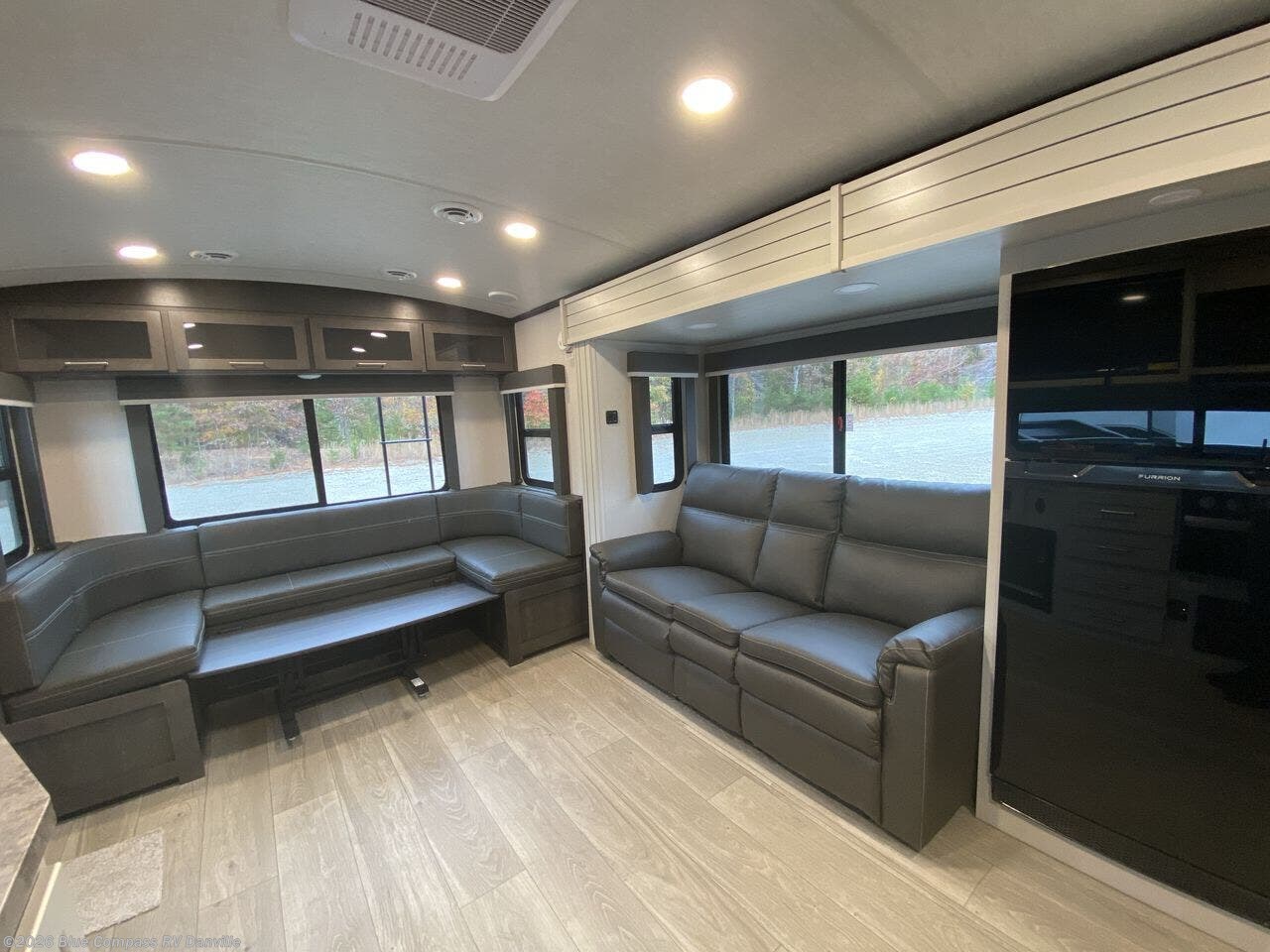 This Cougar Half-Ton travel trailer has an excellent dining area with its huge rear U-shaped dinette! Right next to the dinette is a large slide out that holds the 68" tri-fold sleeper sofa, 10.4 cu. ft. refrigerator, and a pantry. The kitchen has been excellently appointed with a Furrion range, seamless, pressed countertops, a stainless steel undermount sink, and a microwave, and you will be grateful that you can access both sides of the walk-through bathroom. The private bedroom is ultra convenient with its exterior entrance, king-size bed, and dual wardrobes and dual nightstands.