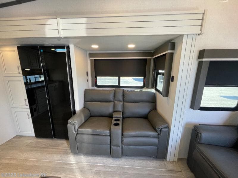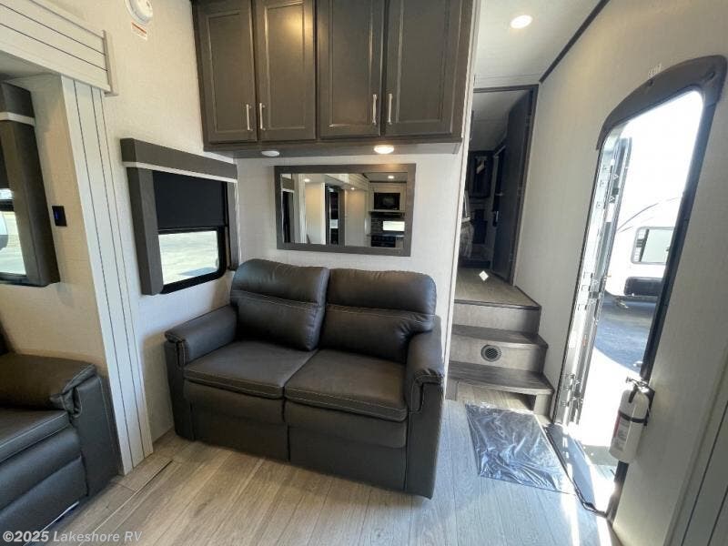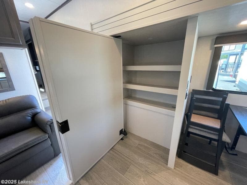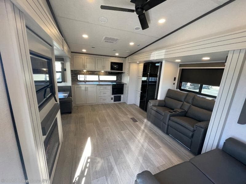 Time spent at the campground in this fifth wheel will be time well spent! Once you arrive, you can unload the unobstructed pass-thru storage, put out the two power awnings, and grab a cold drink from the outdoor mini refrigerator. Head inside to relax on the tri-fold sleeper sofa or theater seating across from the LED HDTV. The rear kitchen includes everything you need to make meals each day, including a pull-out countertop for more space plus a pantry and 16 cu. ft. refrigerator for food storage. The full bath with a 30" x 36" shower will let you freshen up before bed, and speaking of bedtime, the queen bed in the front private bedroom is sure to bring a great night's rest. There are also dual wardrobes and nightstands here for your things, plus a third wardrobe with washer and dryer prep if you want to add these appliances.