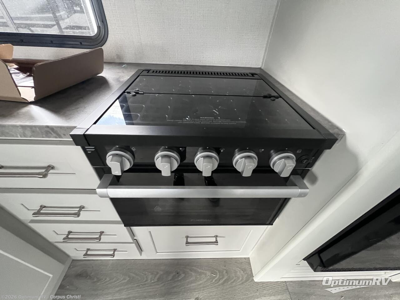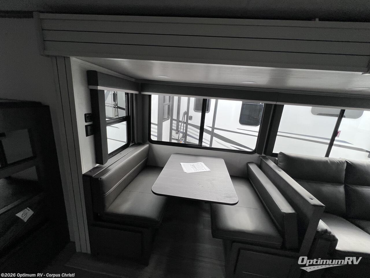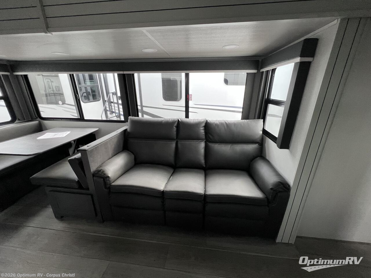 With dual entry doors in this travel trailer, you can enter in through the main living area or the full bath for convenience! Once inside, the sleeper sofa and booth dinette provide places to relax, eat, and play games, plus there is an entertainment center with hidden storage behind to keep movies organized. A full kitchen with a three burner cooktop and 12V refrigerator will allow you to cook and store food, or you can head outdoors to cook on the outdoor kitchen. There is also drop-frame storage outside for fishing poles and hiking gear, and the 21' electric awning provides shade as you relax. When it's time to call it a night, the king bed in the front private bedroom is sure to bring comfort, while the little ones take the double-size bunks, and any other guests can sleep on the living room furniture!