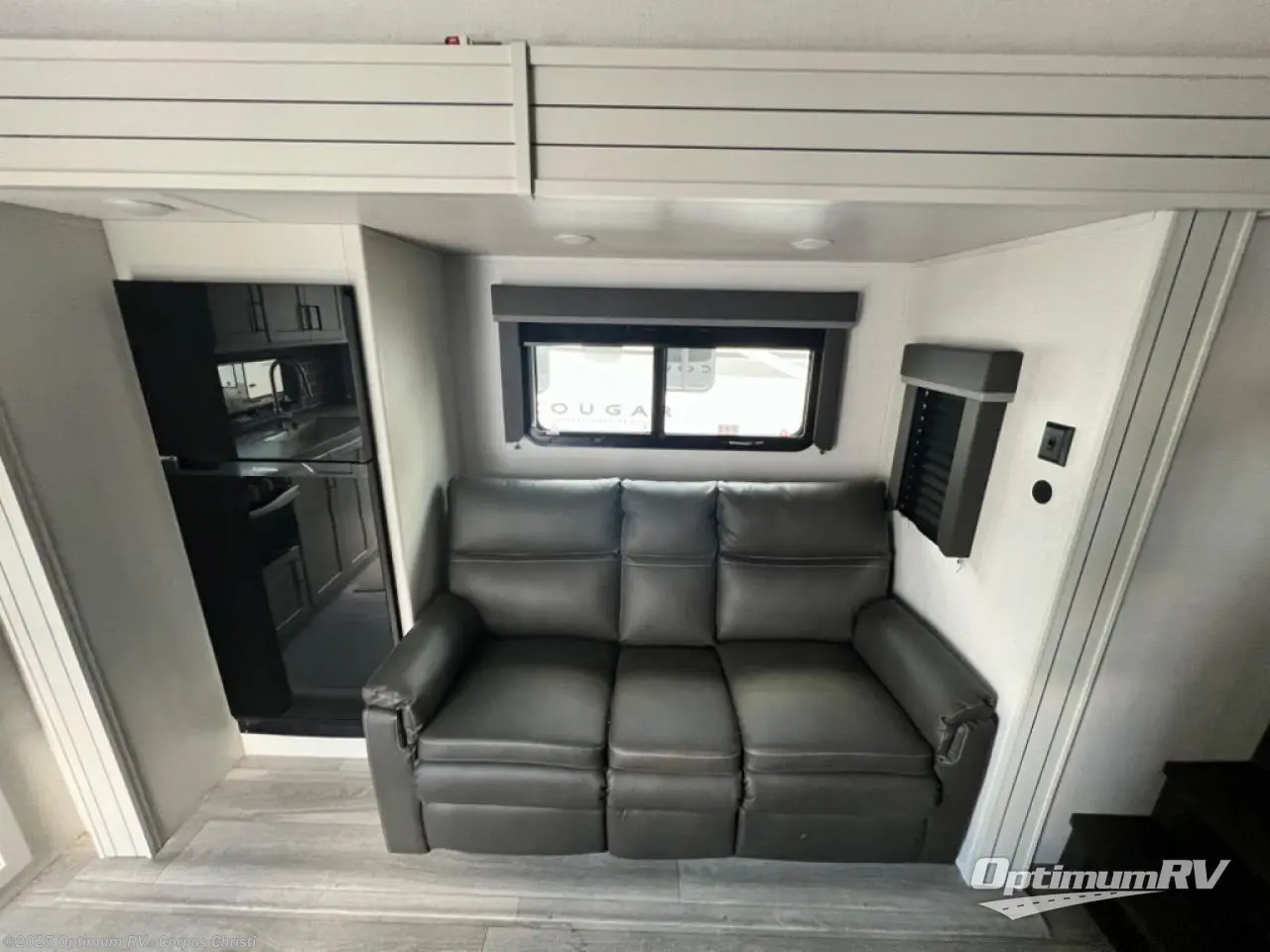 Your family of five or six will love traveling in this Cougar Sport lightweight fifth wheel! Enter to find a convenient rear kitchen layout just steps inside the door. Drop your shoes off in the shoe cubby to your right at the door, and relax on either the tri-fold sleeper sofa or at the booth dinette. The sofa and a 12 volt refrigerator are situated within the slide for added roominess. Head up the steps to a complete bath and private front bedroom featuring a queen size bed with dual shirt wardrobes and nightstands on both sides of the bed. There is also a wardrobe off the foot of the bed along the inside wall with two convenient drawers as well. The bathroom offers a shower with a skylight for added headroom and natural lighting. You will also appreciate the medicine cabinet over the sink for your personal items. Back down to the main living and kitchen area, a nice size pantry will hold all of your dry goods and snacks, and there is ample storage in the overhead cabinets above the dinette on either side of the TV, plus in the kitchen area all along the rear wall. Here you can cook your family their camp favorites using either the three burner range with oven, or overhead microwave. Outside, a 17' awning provides added living space protected from the elements!