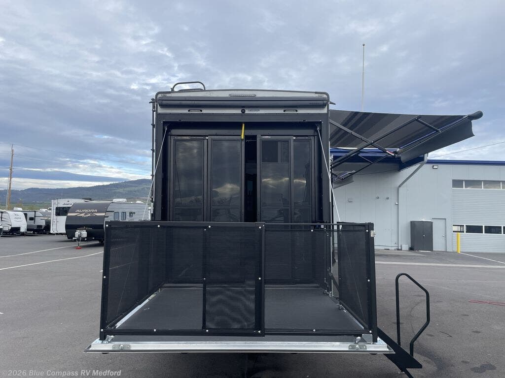 Don't leave your favorite off-road toys behind, simply load them up with the 8' MORryde powered ramp door into the 11' garage area of this toy hauler! The garage area isn't just for your toys, it's for eating, sleeping, and entertaining too with dual opposing sofas with a queen bed above them, a loft with a bunk mat, an LED TV, and even a half bathroom for your convenience. The residential four person sofa slide comes with heat, massage, and 110V/USB ports for an ultimate relaxing evening across from the entertainment center with pantries on either side to store your snacks. The kitchen island table has swing-out stools for you to enjoy a cup of coffee at in the mornings and the dual entry bathroom has a residential shower with a seat to freshen up. It even leads directly into the front private bedroom which has a Fuzion king bed slide across from a dresser with an LED TV and a front master closet with washer and dryer prep!
