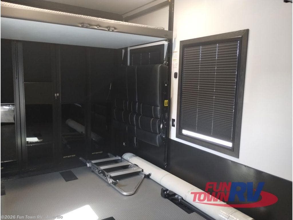 Adventure is just around the corner in this triple slide out, triple axle toy hauler. Once your toys are unloaded from the14' separate garage, you can relax on the dual opposing sofas that include a top queen bed for nighttime use. There is also a loft with a bunk mat here, overhead cabinets for storage, and an LED TV to watch the big game. The living area is where everyone can come together since there is an L-shaped sofa, theater seating, and an entertainment center for movies, and you can choose to add the optional dinette table to dine at. You'll love the kitchen with its counter peninsula, four burner range, and residential refrigerator. A full bath towards the front will let you freshen up each day, and the front private bedroom includes a Fuzion king bed for all-around comfort. There is also a master closet here, along with USB outlets, a dresser with hidden storage, plus washer and dryer prep!