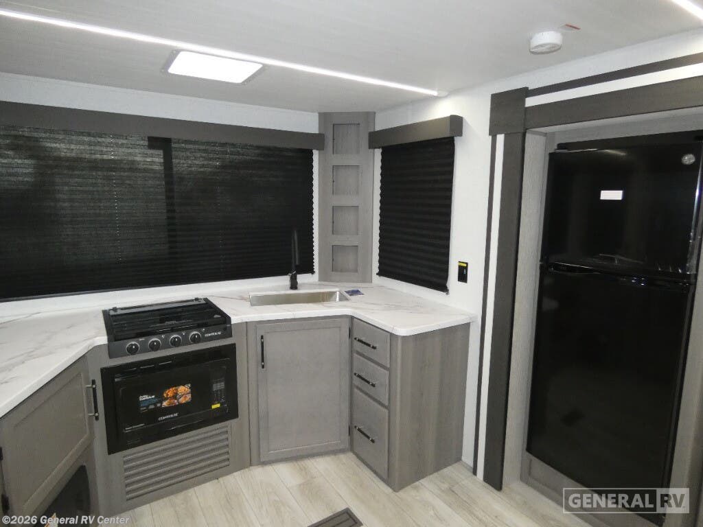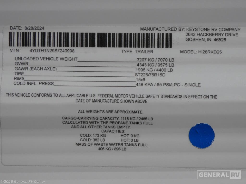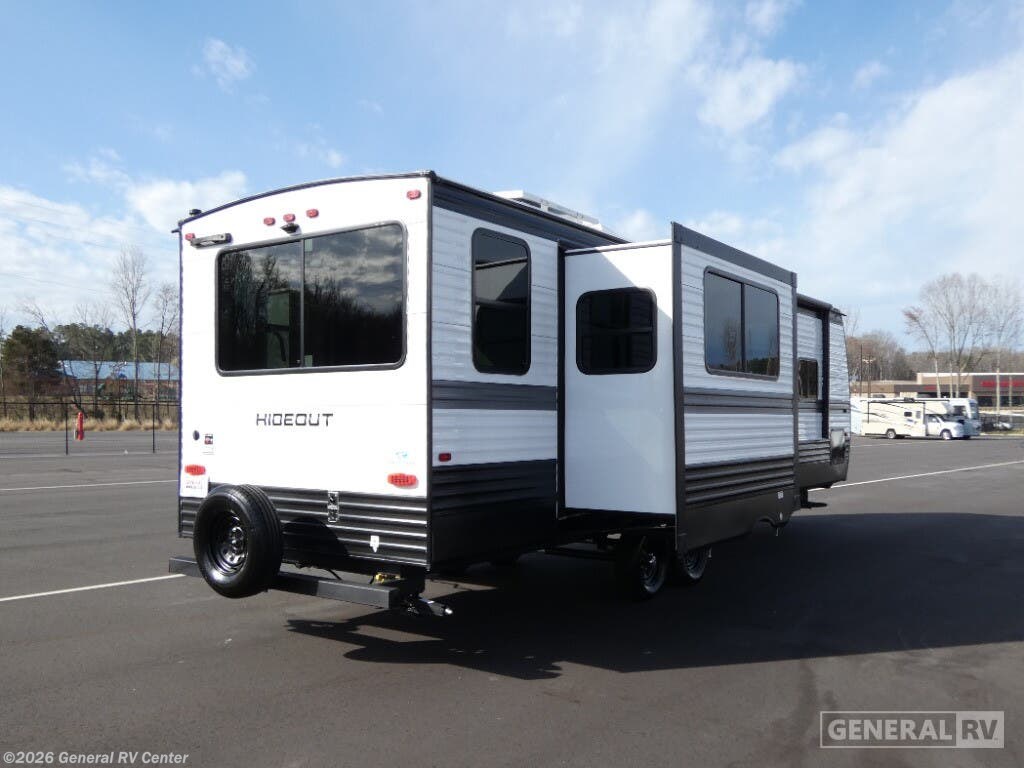 Experience the perfect blend of comfort and functionality with the 2025 Keystone Hideout 28RKD. This charming travel trailer is designed for those who love to explore without sacrificing the comforts of home. With a spacious rear kitchen, you'll enjoy cooking up delicious meals using the three-burner cooktop and full-size electric refrigerator. The layout flows effortlessly into the center living area, where a cozy U-shaped dinette and an optional tri-fold sofa or theater seating await, perfect for relaxing and entertaining. The 12 ft. powered retractable awning extends your living space outdoors, offering shade and comfort as you enjoy the great outdoors. Retreat to the front bedroom, where a queen bed promises restful nights. Clever storage solutions, including dual linen closets and a handy laundry chute, keep everything organized and within reach. The center bath, equipped with a shower curtain, ensures privacy and convenience. With a GVWR of 9575 lbs and a cargo capacity of 2351 lbs, this RV is both robust and versatile, ready to accompany you on your adventures. Whether you're a seasoned traveler or a weekend warrior, the Hideout 28RKD is your ticket to unforgettable journeys. For more details, visit your nearest General RV Dealership.