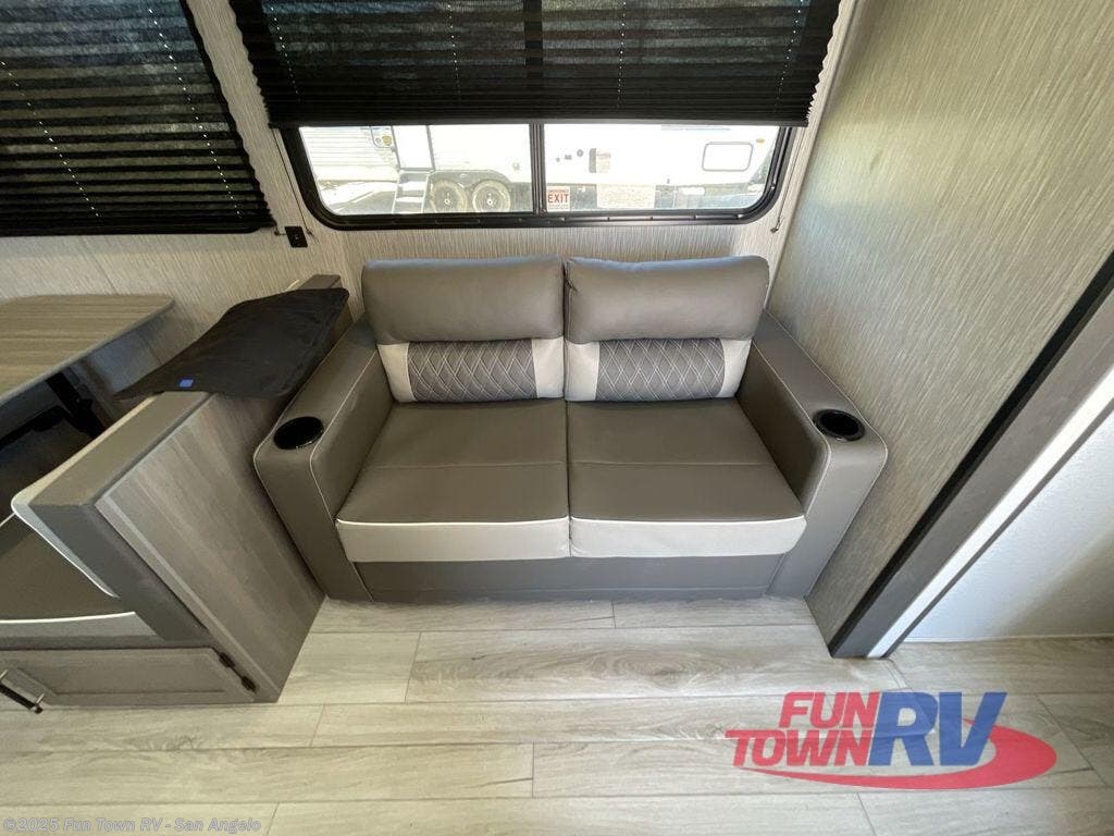 You will be quite impressed by the large private bunkhouse on this Hideout travel trailer! This bunkhouse has a slide out for more space, two bunks, a flip-up bunk, plus a toy chest to keep everything tidy. Now your kids can play all day and store their toys when it's time for bed. The full bathroom is located right next to the bunkhouse for easy access at night, and the bathroom also contains the second exterior entry door. The main living area is full of great features as well with a large slide, a standard sofa, and a booth dinette. And you can choose the optional tri-fold sofa or optional theater seating in place of the standard sofa, depending on your needs.