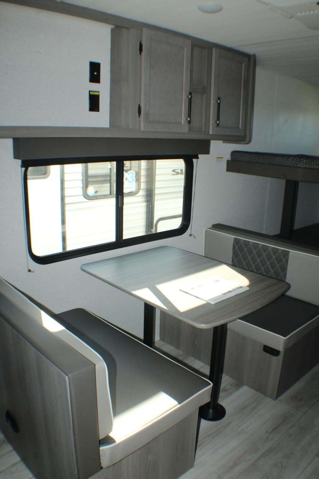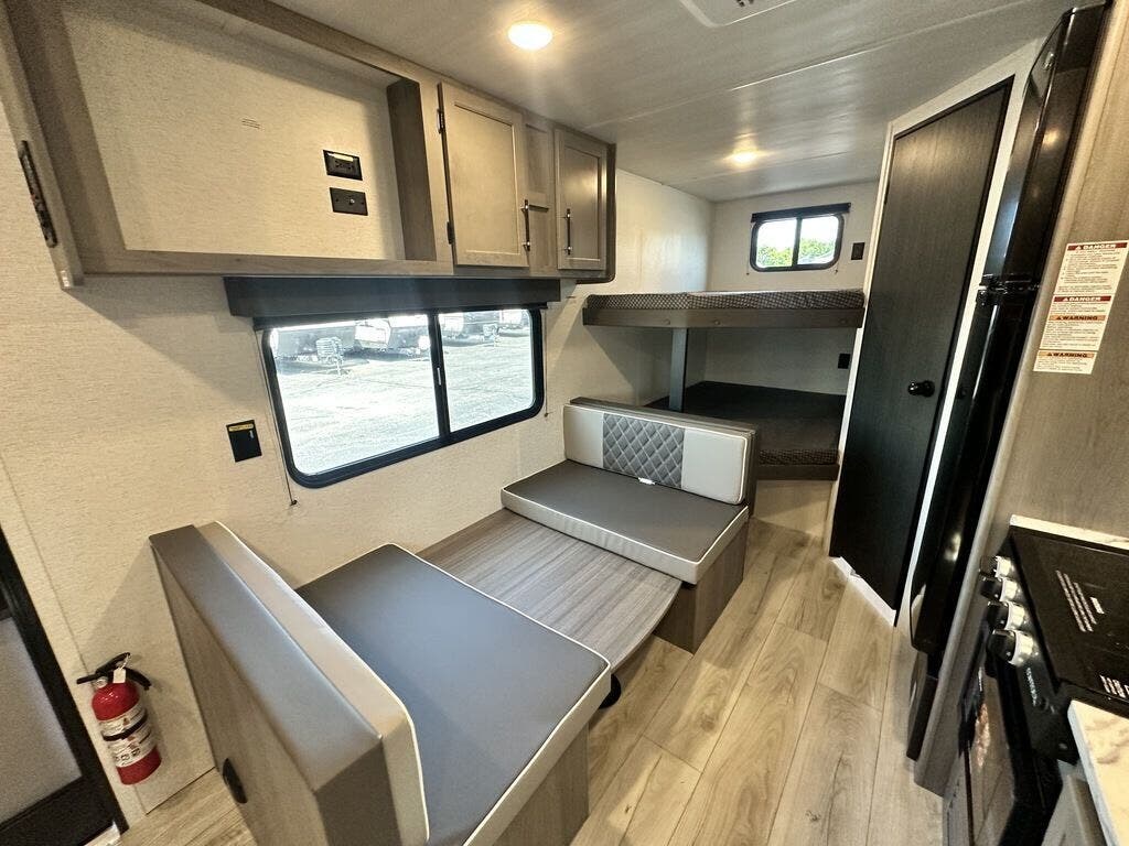 Booth Dinette, Bunk Beds, Medicine Cabinet, Queen Bed, Roof Vents, Shower, Toilet