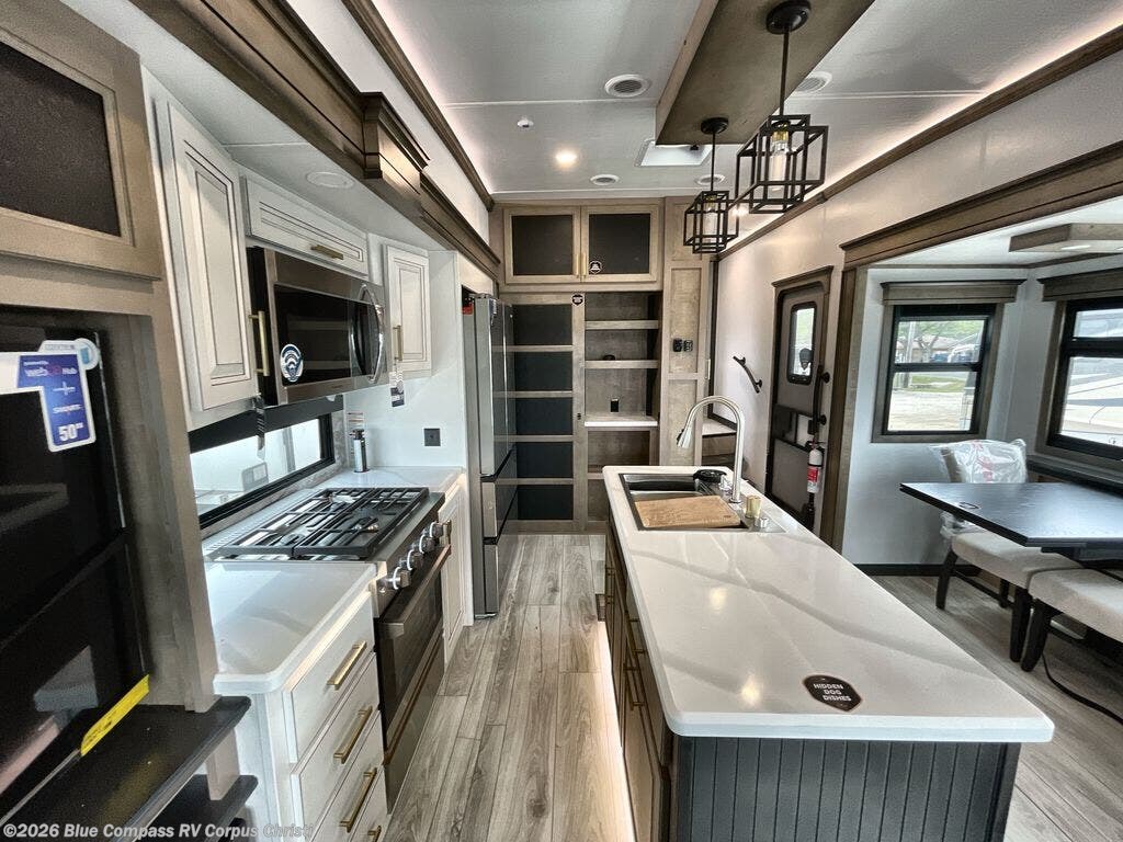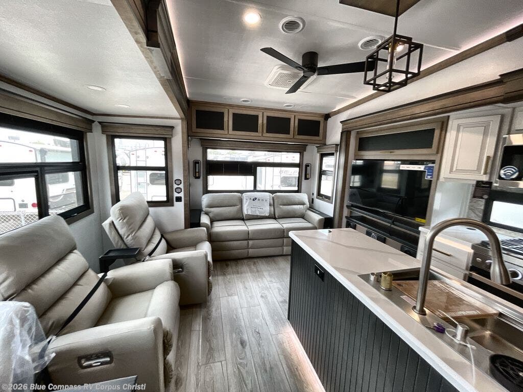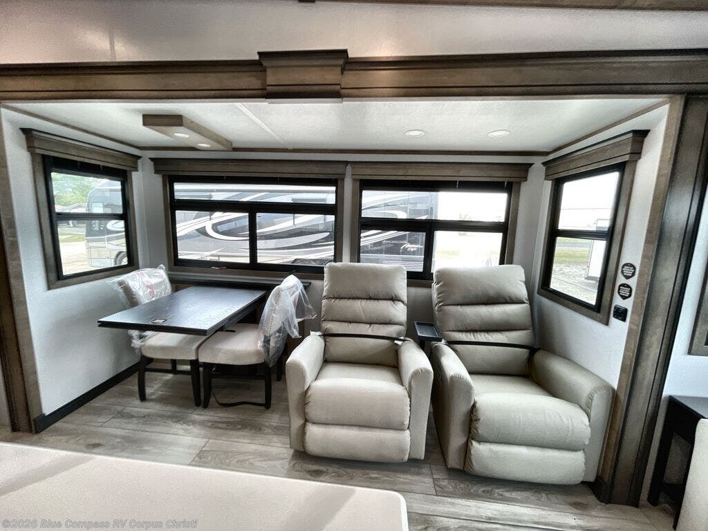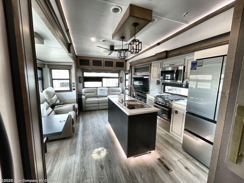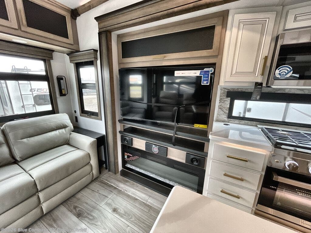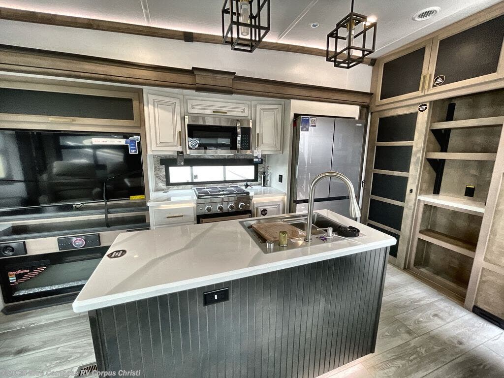 Luxury abounds throughout this fifth wheel! Starting in the kitchen with the island, floor to ceiling pantry with shelves, 24" range, and residential convection microwave. The full bathroom has a 48" x 30" fiberglass shower with a seat, decorative glass enclosure, and a skylight above it for more natural lighting. Sleep like a baby in the front private bedroom on the king bed slide with storage underneath and keep your clothes looking their best with the front closet that has a clothing hamper and stackable washer and dryer prep. The rear living area offers true relaxation with a hide-a-bed sofa and power theater seating across from the entertainment center with a 5,000 BTU decorative fireplace heater and 50" Smart TV to watch your favorite movies!