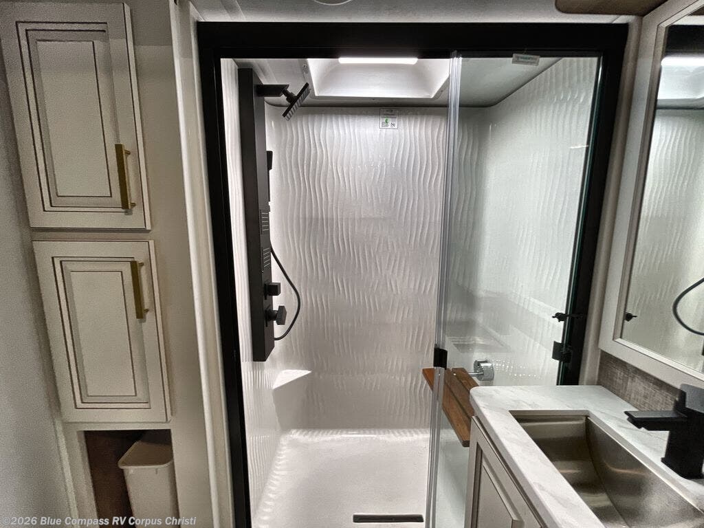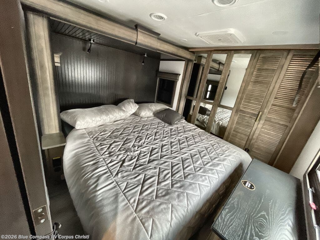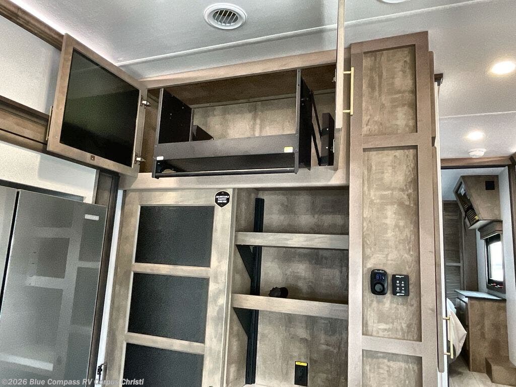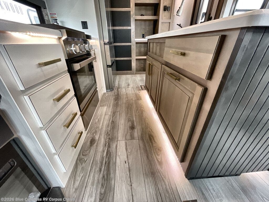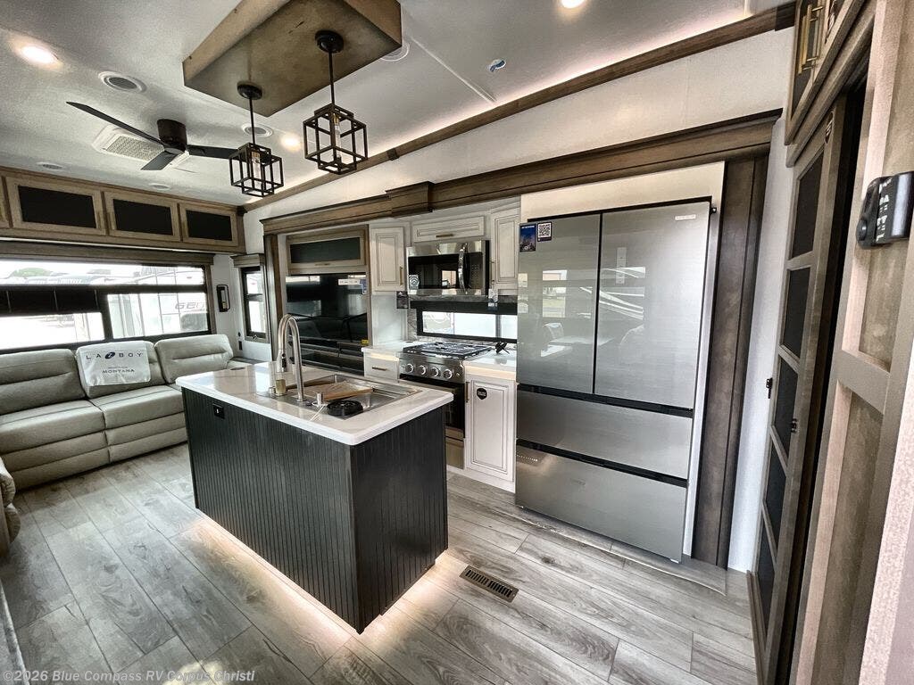 Luxury abounds throughout this fifth wheel! Starting in the kitchen with the island, floor to ceiling pantry with shelves, 24" range, and residential convection microwave. The full bathroom has a 48" x 30" fiberglass shower with a seat, decorative glass enclosure, and a skylight above it for more natural lighting. Sleep like a baby in the front private bedroom on the king bed slide with storage underneath and keep your clothes looking their best with the front closet that has a clothing hamper and stackable washer and dryer prep. The rear living area offers true relaxation with a hide-a-bed sofa and power theater seating across from the entertainment center with a 5,000 BTU decorative fireplace heater and 50" Smart TV to watch your favorite movies!