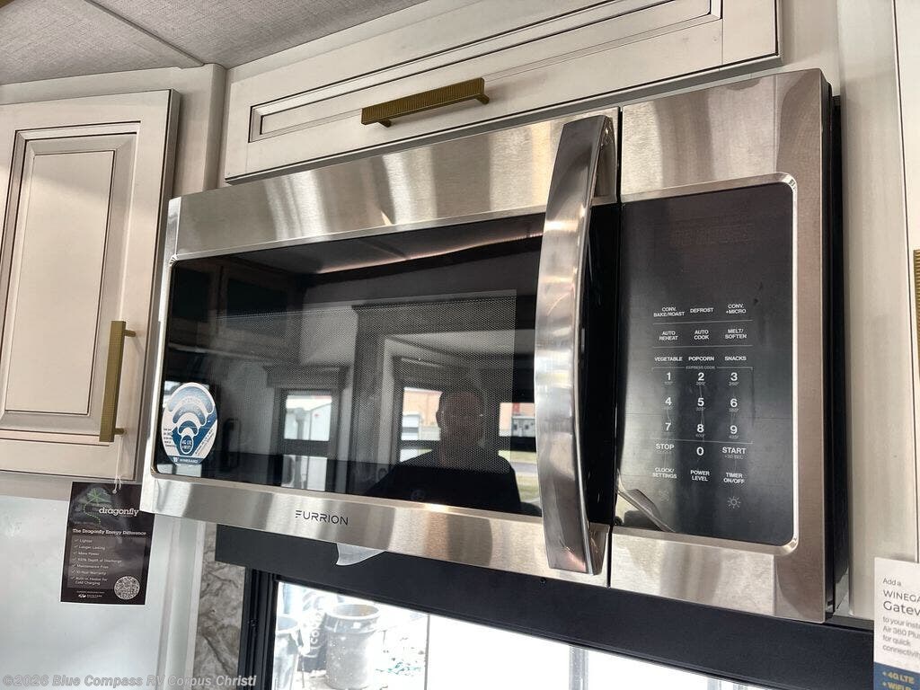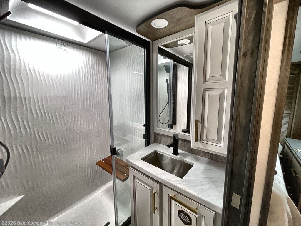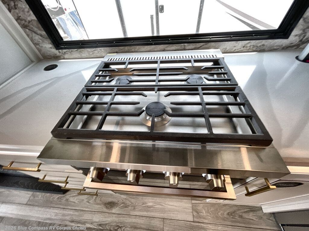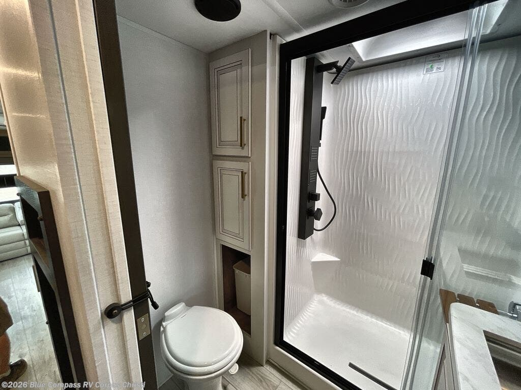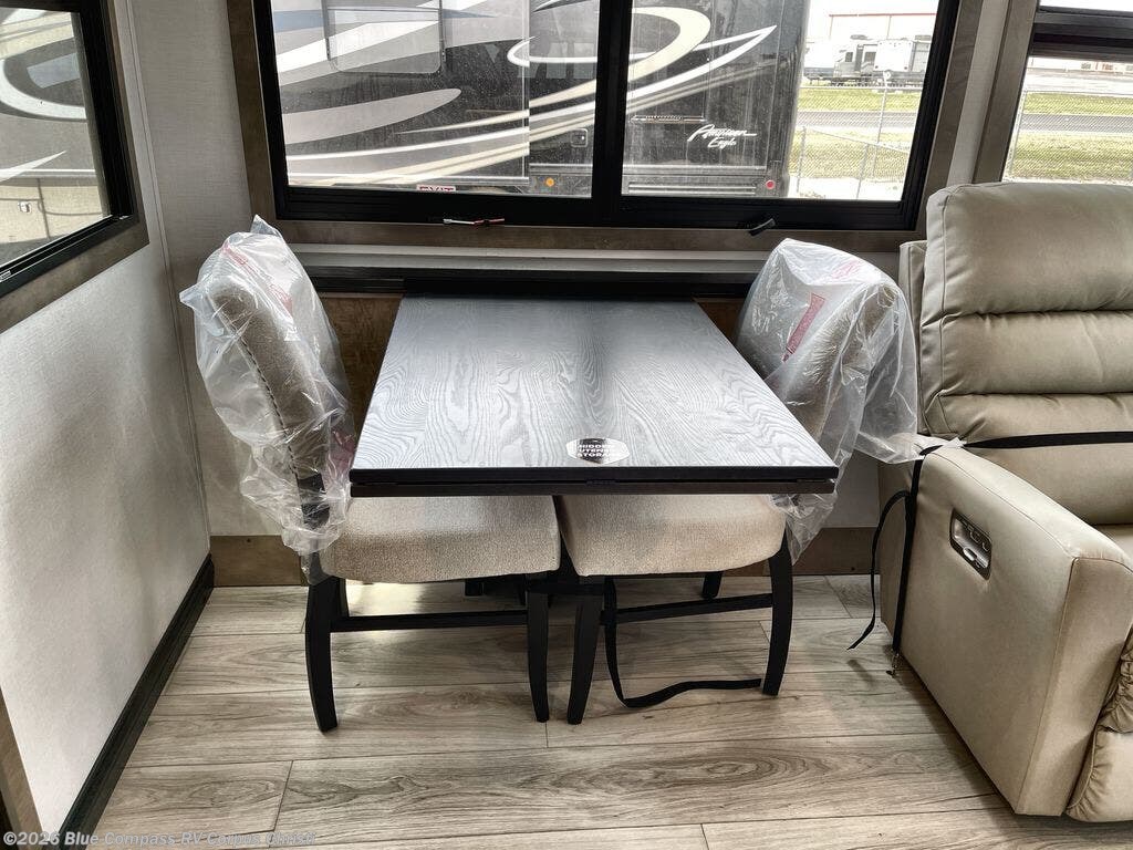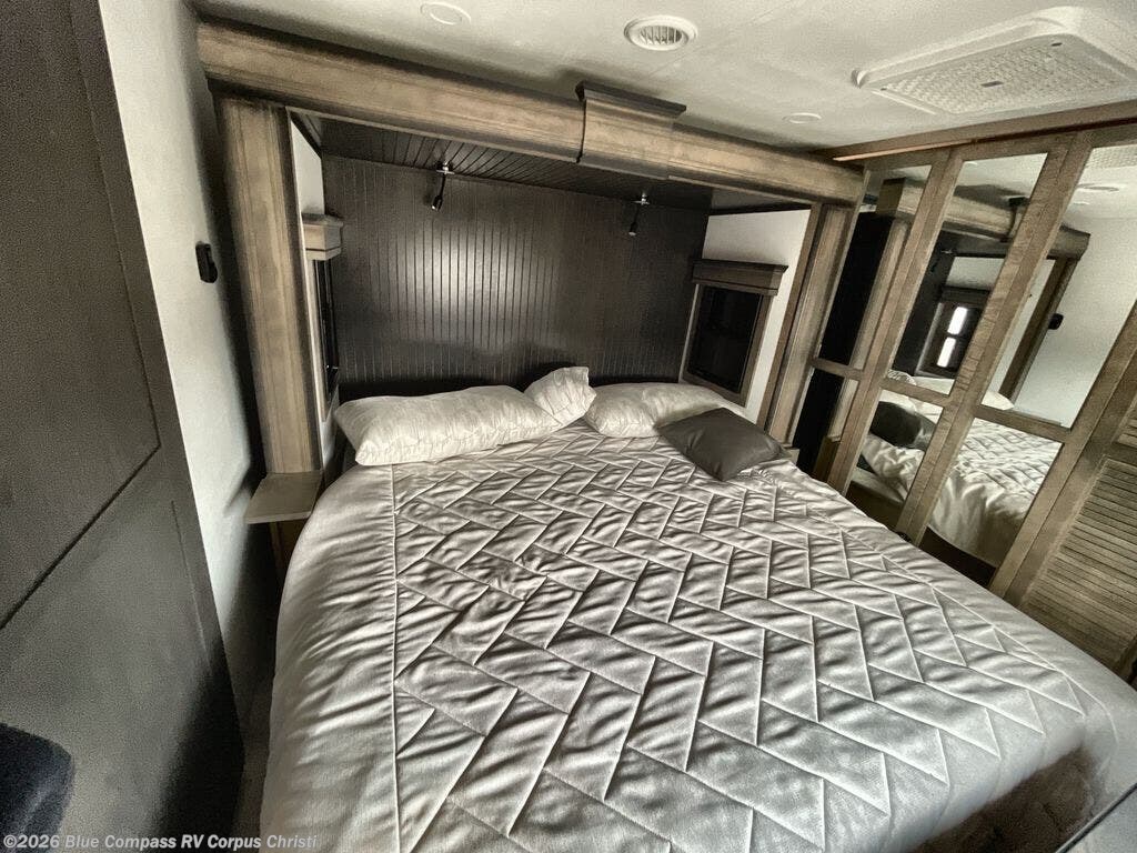 Luxury abounds throughout this fifth wheel! Starting in the kitchen with the island, floor to ceiling pantry with shelves, 24" range, and residential convection microwave. The full bathroom has a 48" x 30" fiberglass shower with a seat, decorative glass enclosure, and a skylight above it for more natural lighting. Sleep like a baby in the front private bedroom on the king bed slide with storage underneath and keep your clothes looking their best with the front closet that has a clothing hamper and stackable washer and dryer prep. The rear living area offers true relaxation with a hide-a-bed sofa and power theater seating across from the entertainment center with a 5,000 BTU decorative fireplace heater and 50" Smart TV to watch your favorite movies!