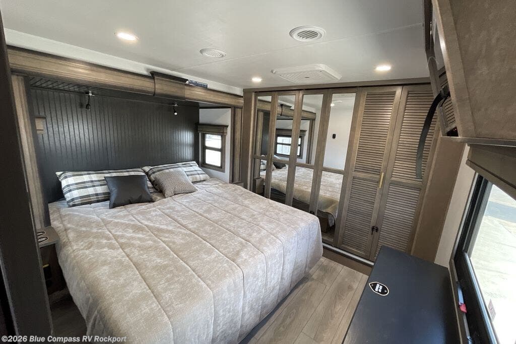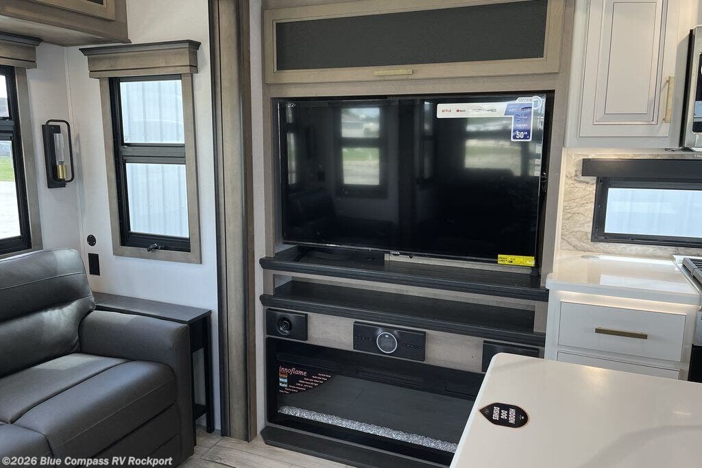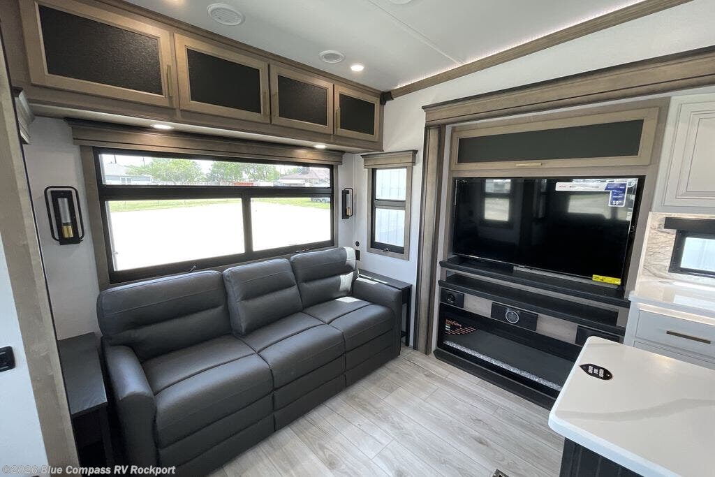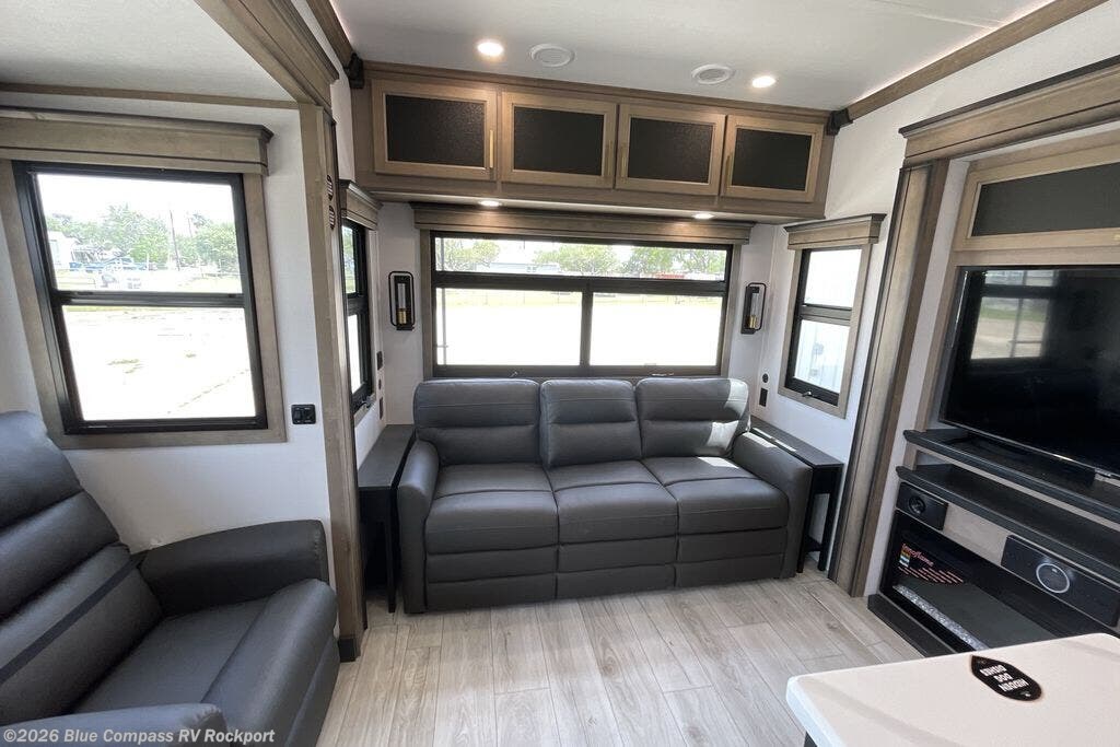 Luxury abounds throughout this fifth wheel! Starting in the kitchen with the island, floor to ceiling pantry with shelves, 24" range, and residential convection microwave. The full bathroom has a 48" x 30" fiberglass shower with a seat, decorative glass enclosure, and a skylight above it for more natural lighting. Sleep like a baby in the front private bedroom on the king bed slide with storage underneath and keep your clothes looking their best with the front closet that has a clothing hamper and stackable washer and dryer prep. The rear living area offers true relaxation with a hide-a-bed sofa and power theater seating across from the entertainment center with a 5,000 BTU decorative fireplace heater and 50" Smart TV to watch your favorite movies!