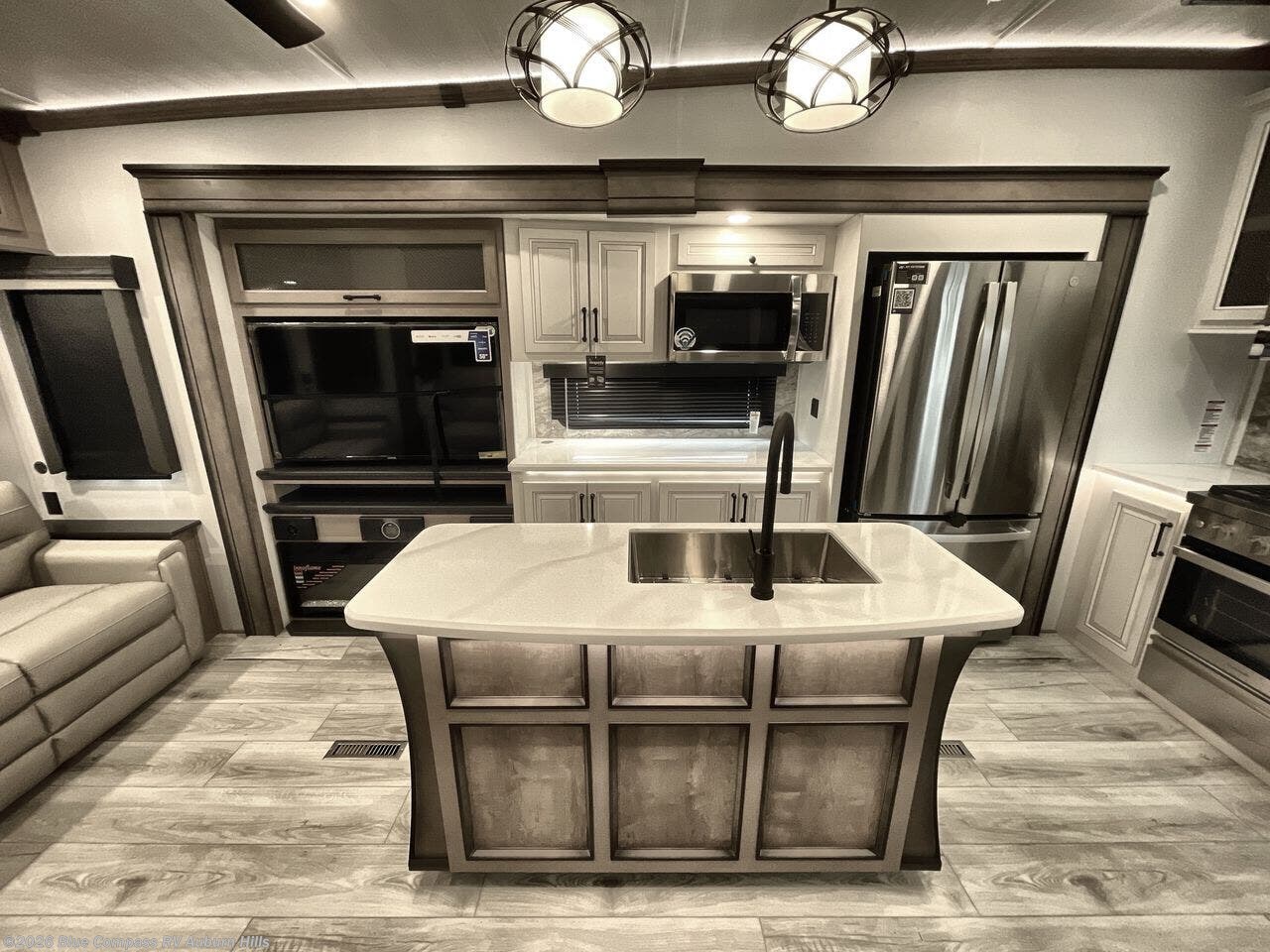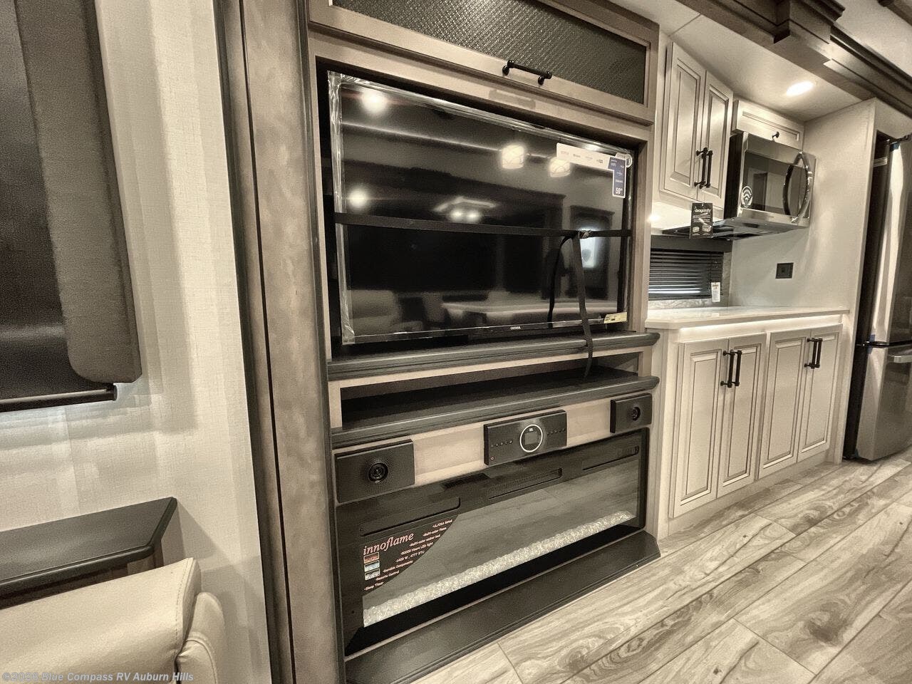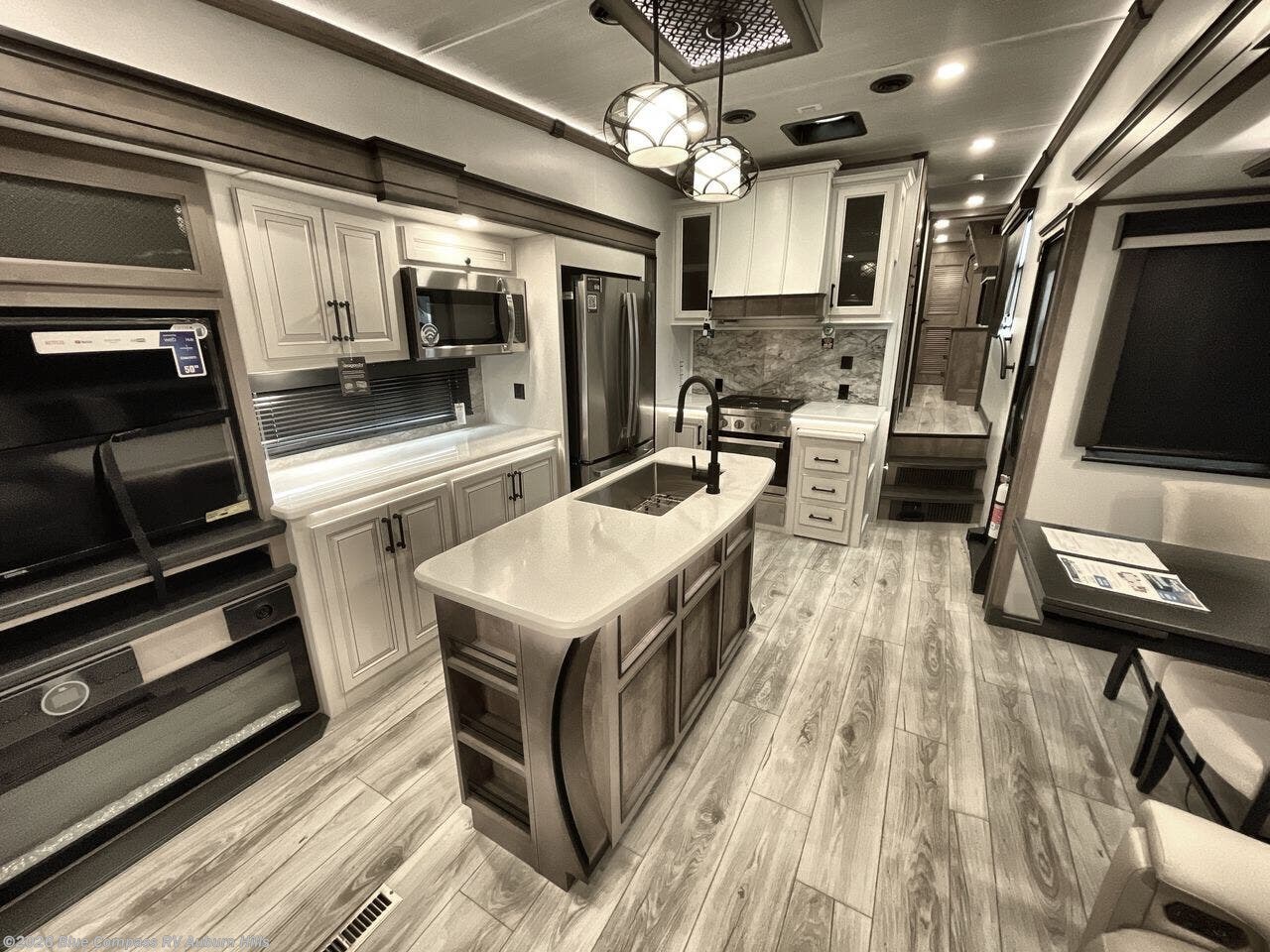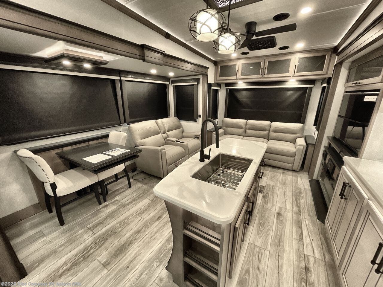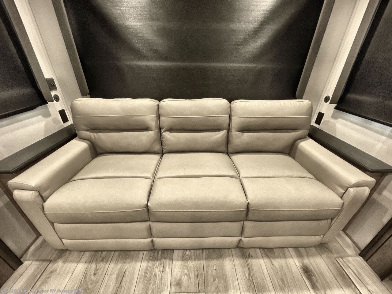 Luxury abounds throughout this fifth wheel! Starting in the kitchen with the island, floor to ceiling pantry with shelves, 24" range, and residential convection microwave. The full bathroom has a 48" x 30" fiberglass shower with a seat, decorative glass enclosure, and a skylight above it for more natural lighting. Sleep like a baby in the front private bedroom on the king bed slide with storage underneath and keep your clothes looking their best with the front closet that has a clothing hamper and stackable washer and dryer prep. The rear living area offers true relaxation with a hide-a-bed sofa and power theater seating across from the entertainment center with a 5,000 BTU decorative fireplace heater and 50" Smart TV to watch your favorite movies!
