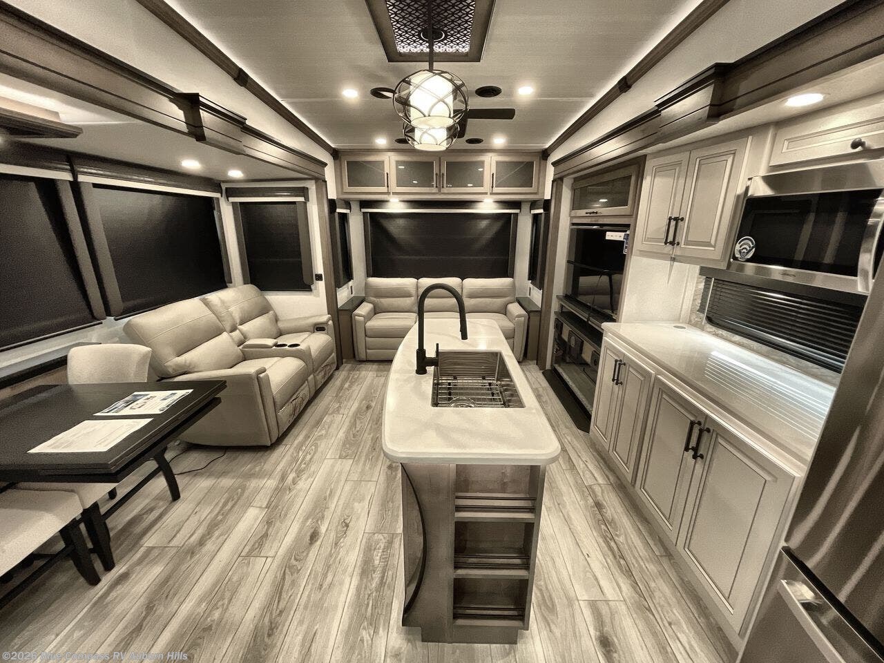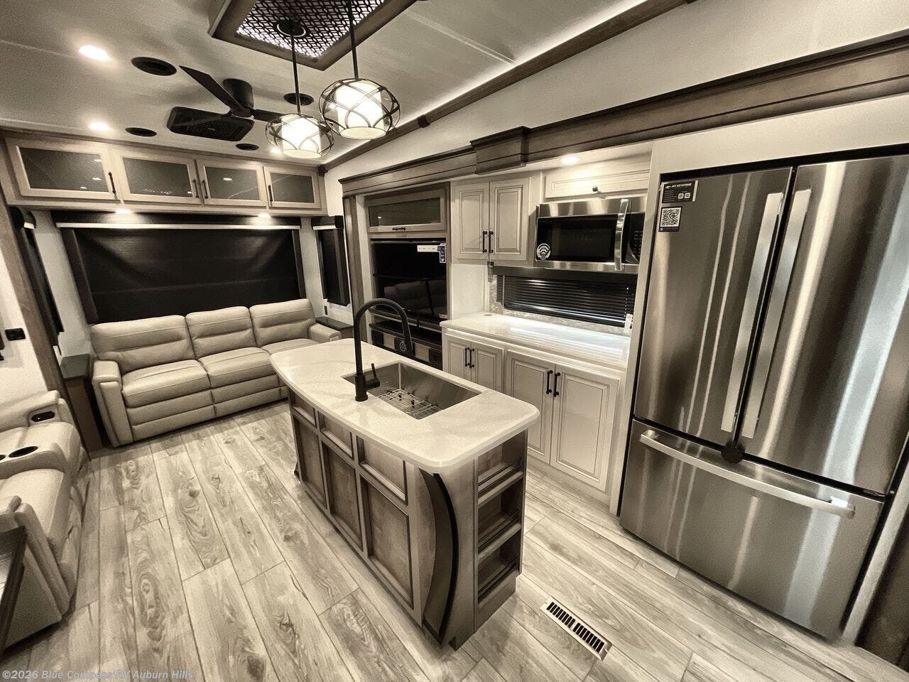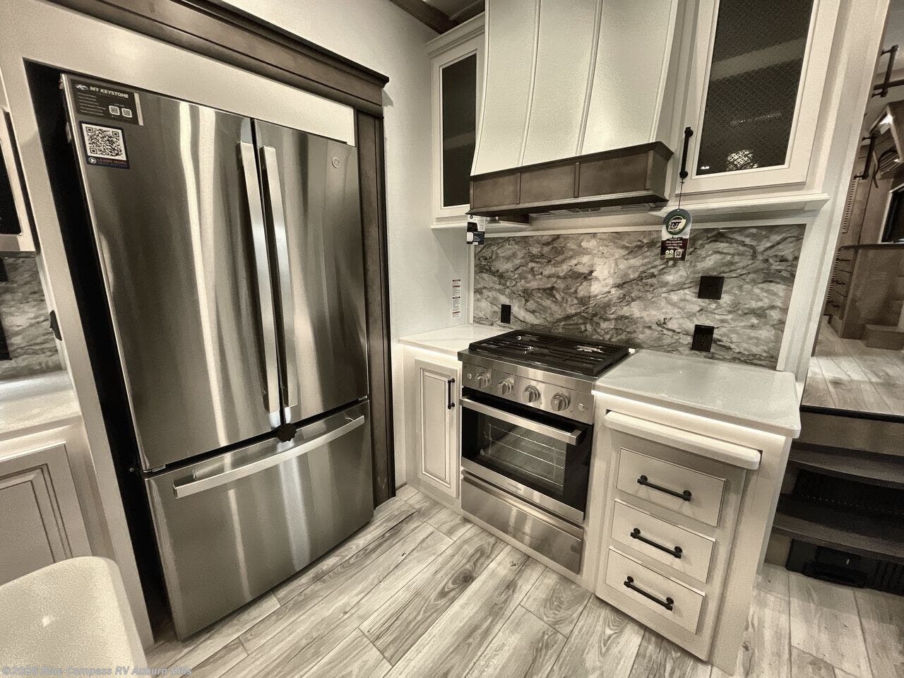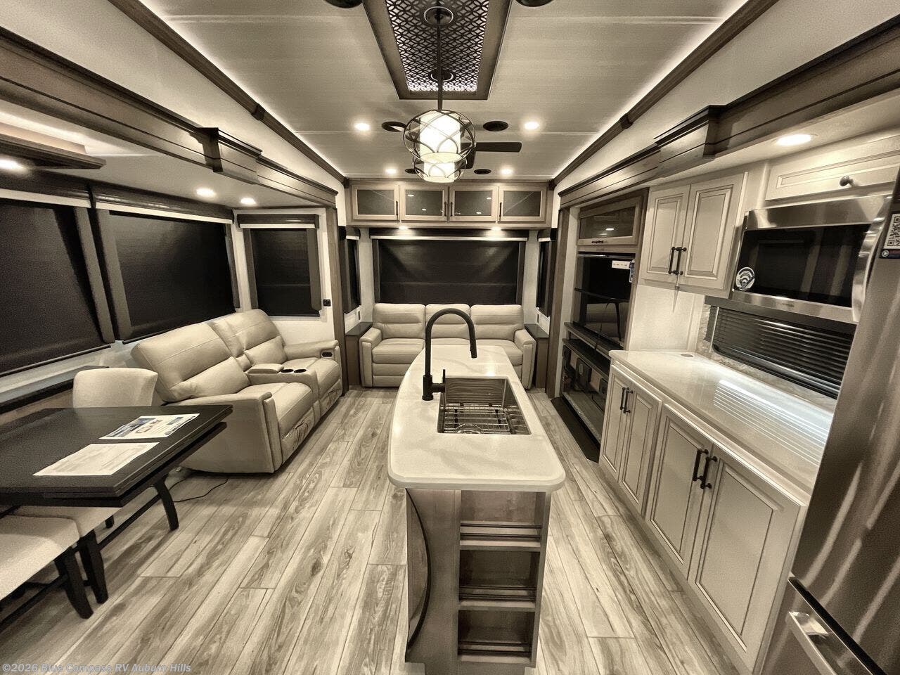 Luxury abounds throughout this fifth wheel! Starting in the kitchen with the island, floor to ceiling pantry with shelves, 24" range, and residential convection microwave. The full bathroom has a 48" x 30" fiberglass shower with a seat, decorative glass enclosure, and a skylight above it for more natural lighting. Sleep like a baby in the front private bedroom on the king bed slide with storage underneath and keep your clothes looking their best with the front closet that has a clothing hamper and stackable washer and dryer prep. The rear living area offers true relaxation with a hide-a-bed sofa and power theater seating across from the entertainment center with a 5,000 BTU decorative fireplace heater and 50" Smart TV to watch your favorite movies!