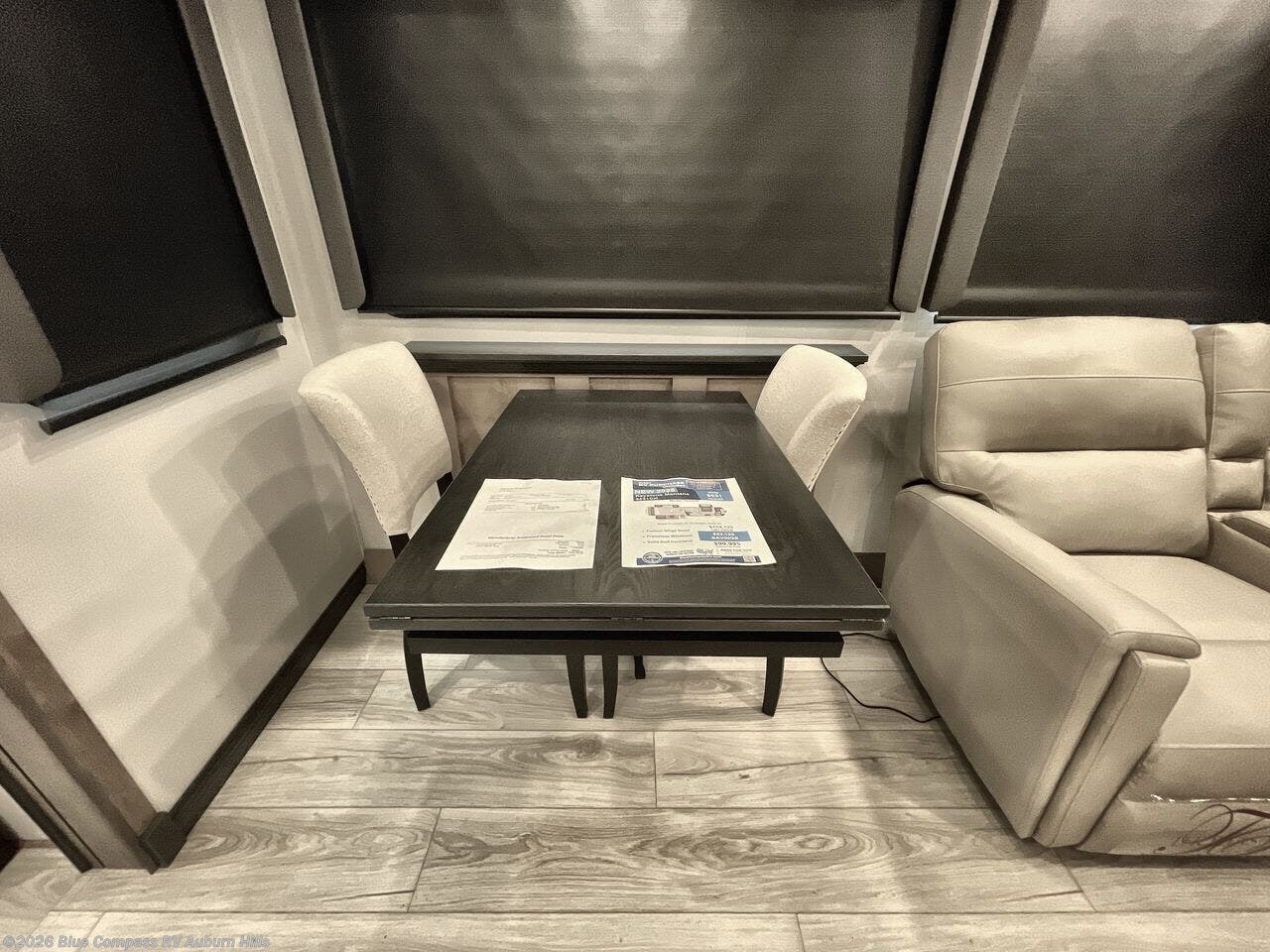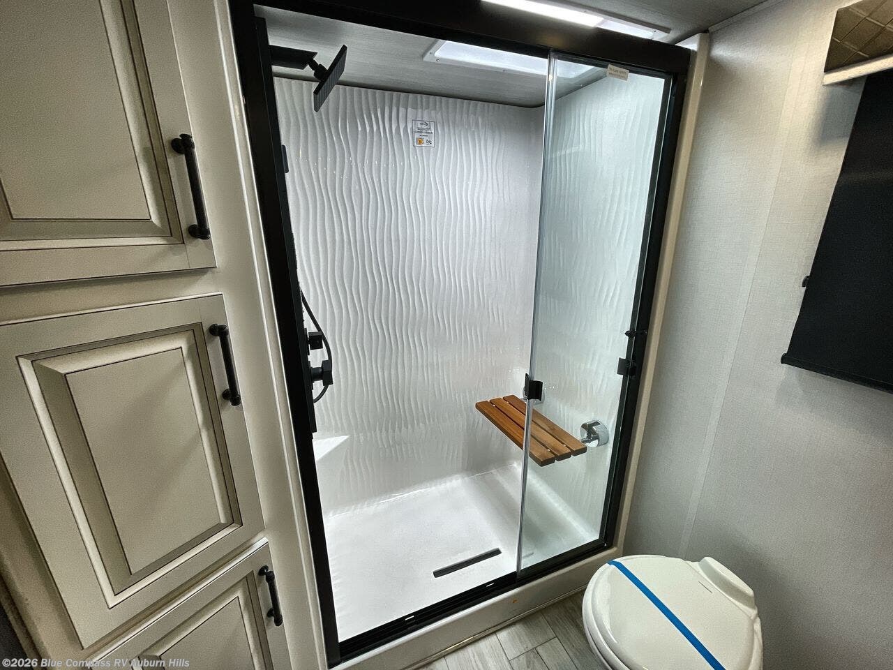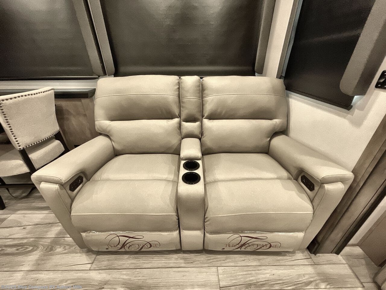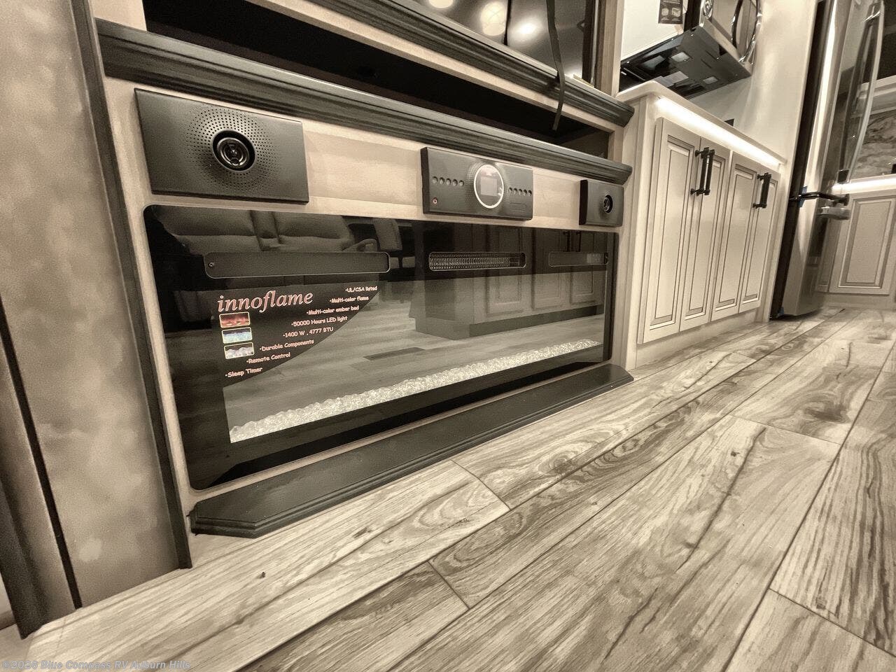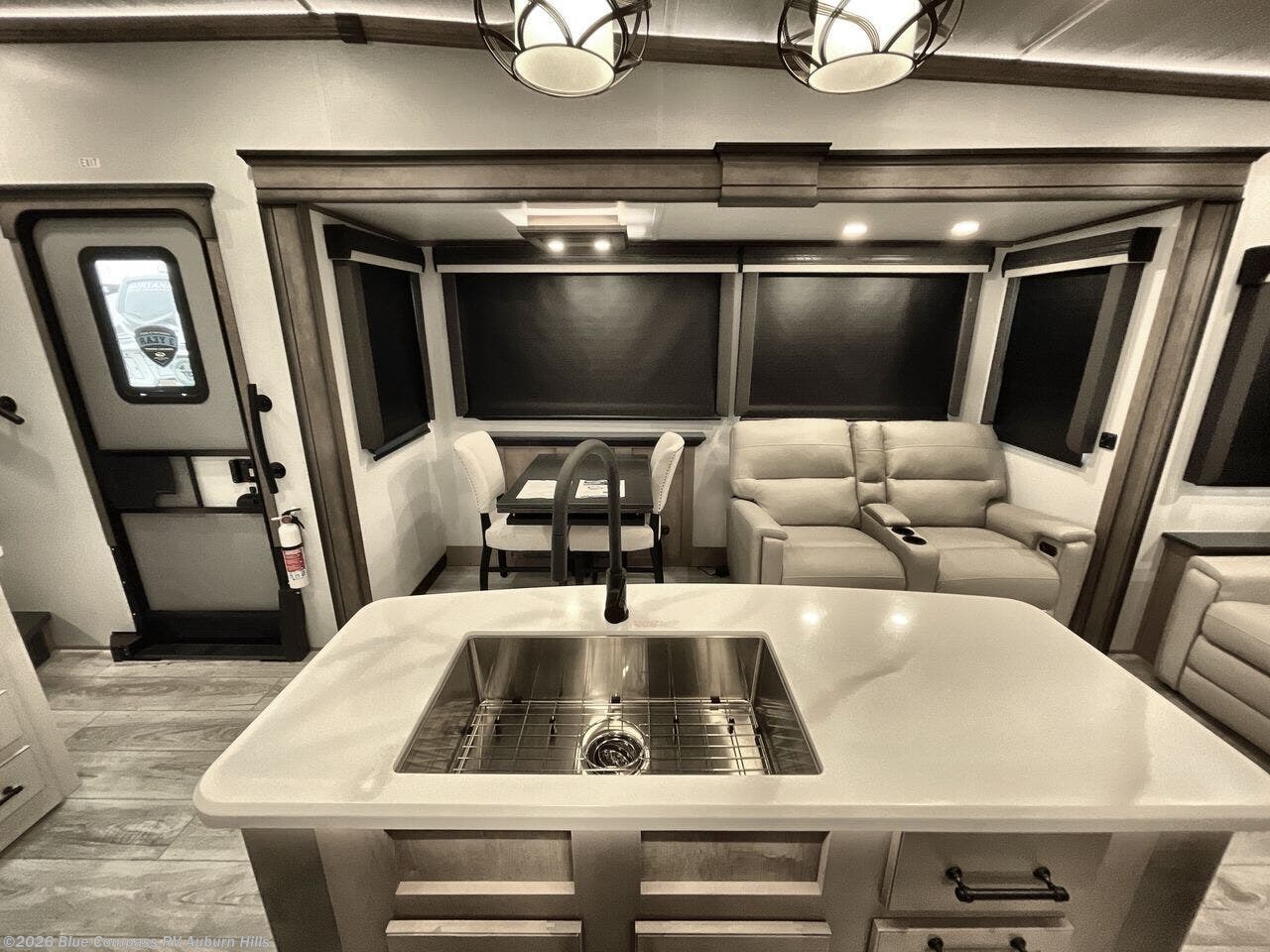 Luxury abounds throughout this fifth wheel! Starting in the kitchen with the island, floor to ceiling pantry with shelves, 24" range, and residential convection microwave. The full bathroom has a 48" x 30" fiberglass shower with a seat, decorative glass enclosure, and a skylight above it for more natural lighting. Sleep like a baby in the front private bedroom on the king bed slide with storage underneath and keep your clothes looking their best with the front closet that has a clothing hamper and stackable washer and dryer prep. The rear living area offers true relaxation with a hide-a-bed sofa and power theater seating across from the entertainment center with a 5,000 BTU decorative fireplace heater and 50" Smart TV to watch your favorite movies!