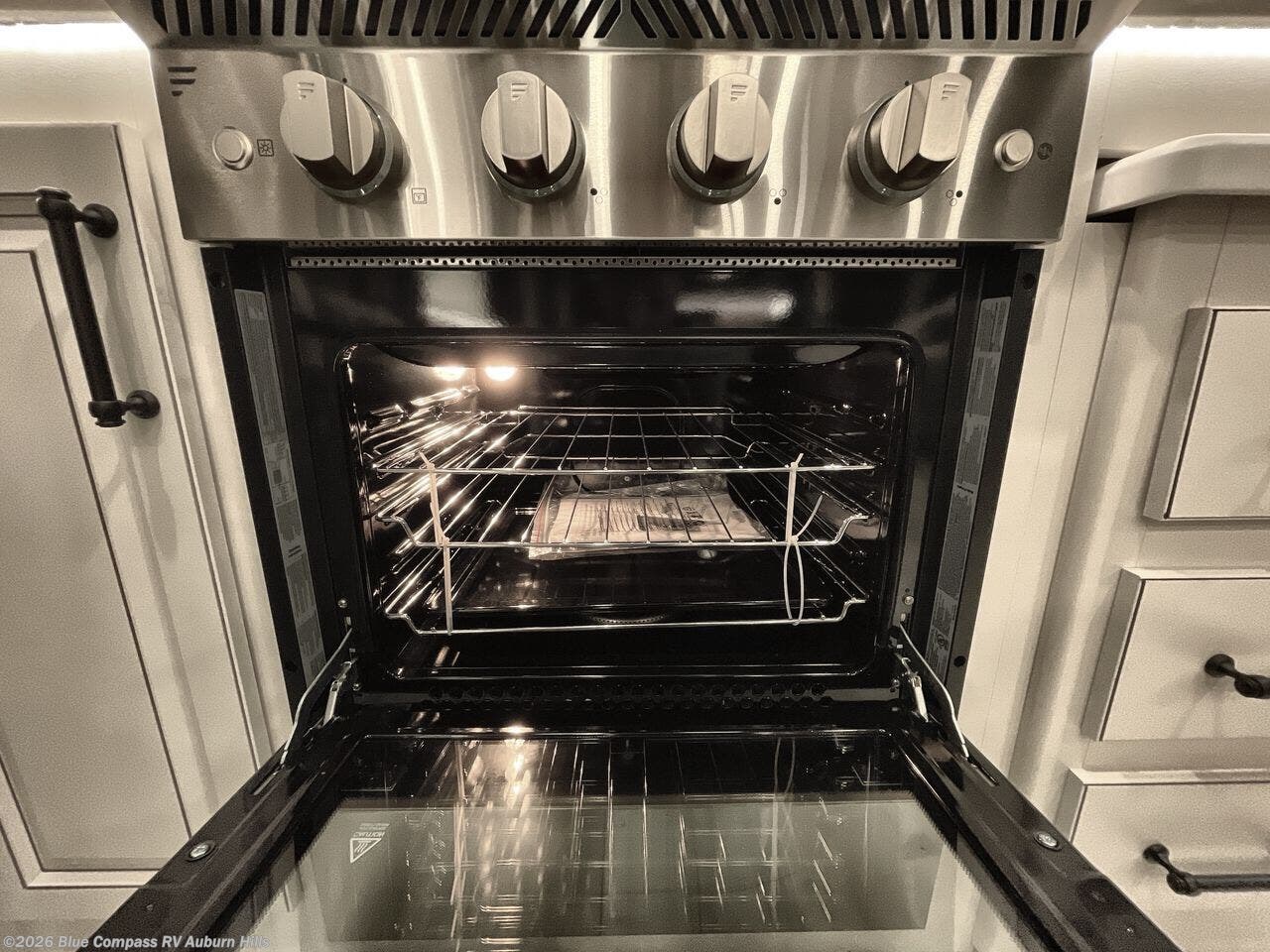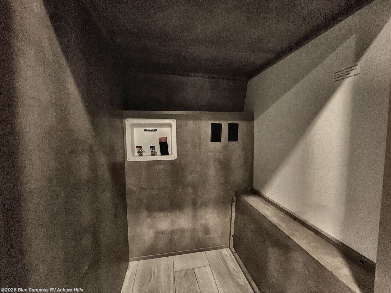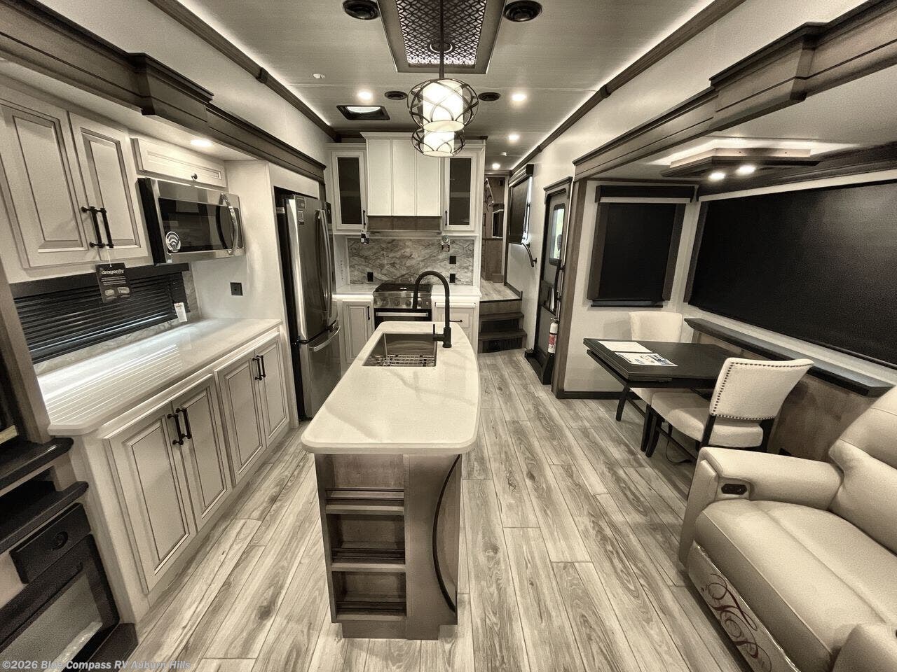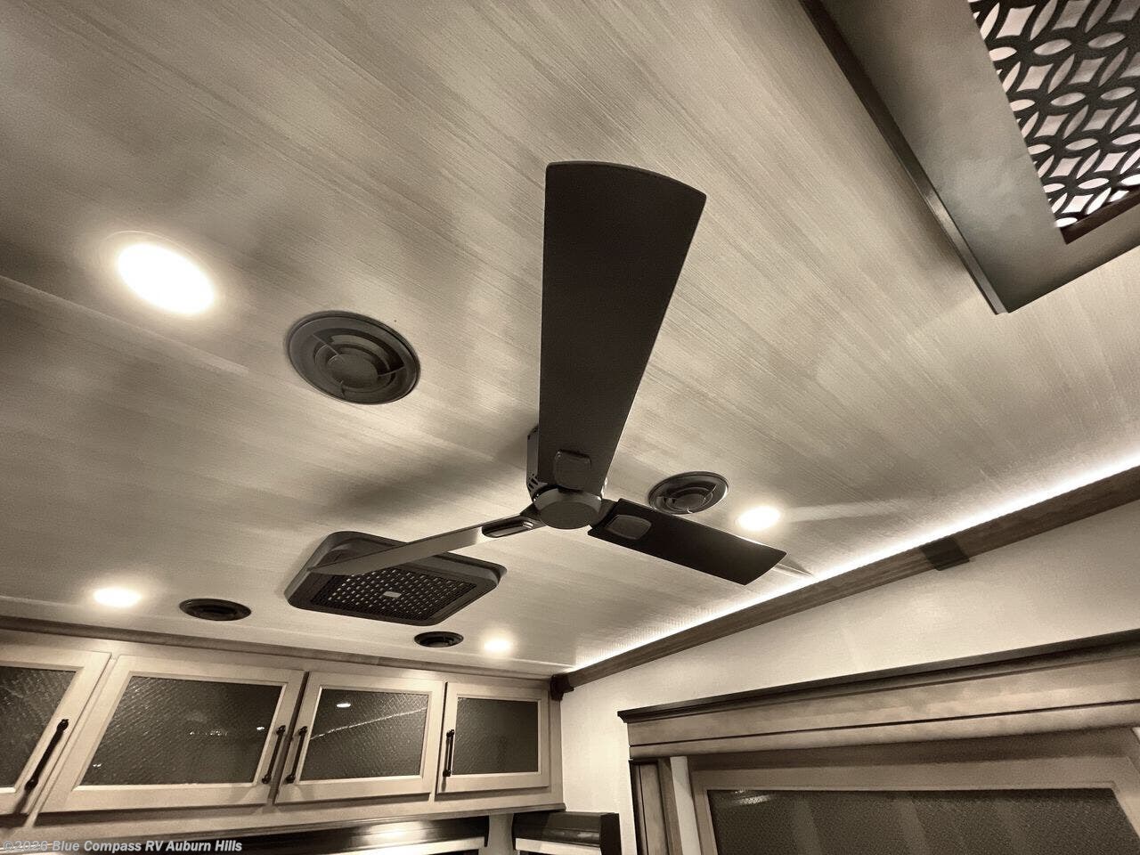 Luxury abounds throughout this fifth wheel! Starting in the kitchen with the island, floor to ceiling pantry with shelves, 24" range, and residential convection microwave. The full bathroom has a 48" x 30" fiberglass shower with a seat, decorative glass enclosure, and a skylight above it for more natural lighting. Sleep like a baby in the front private bedroom on the king bed slide with storage underneath and keep your clothes looking their best with the front closet that has a clothing hamper and stackable washer and dryer prep. The rear living area offers true relaxation with a hide-a-bed sofa and power theater seating across from the entertainment center with a 5,000 BTU decorative fireplace heater and 50" Smart TV to watch your favorite movies!
