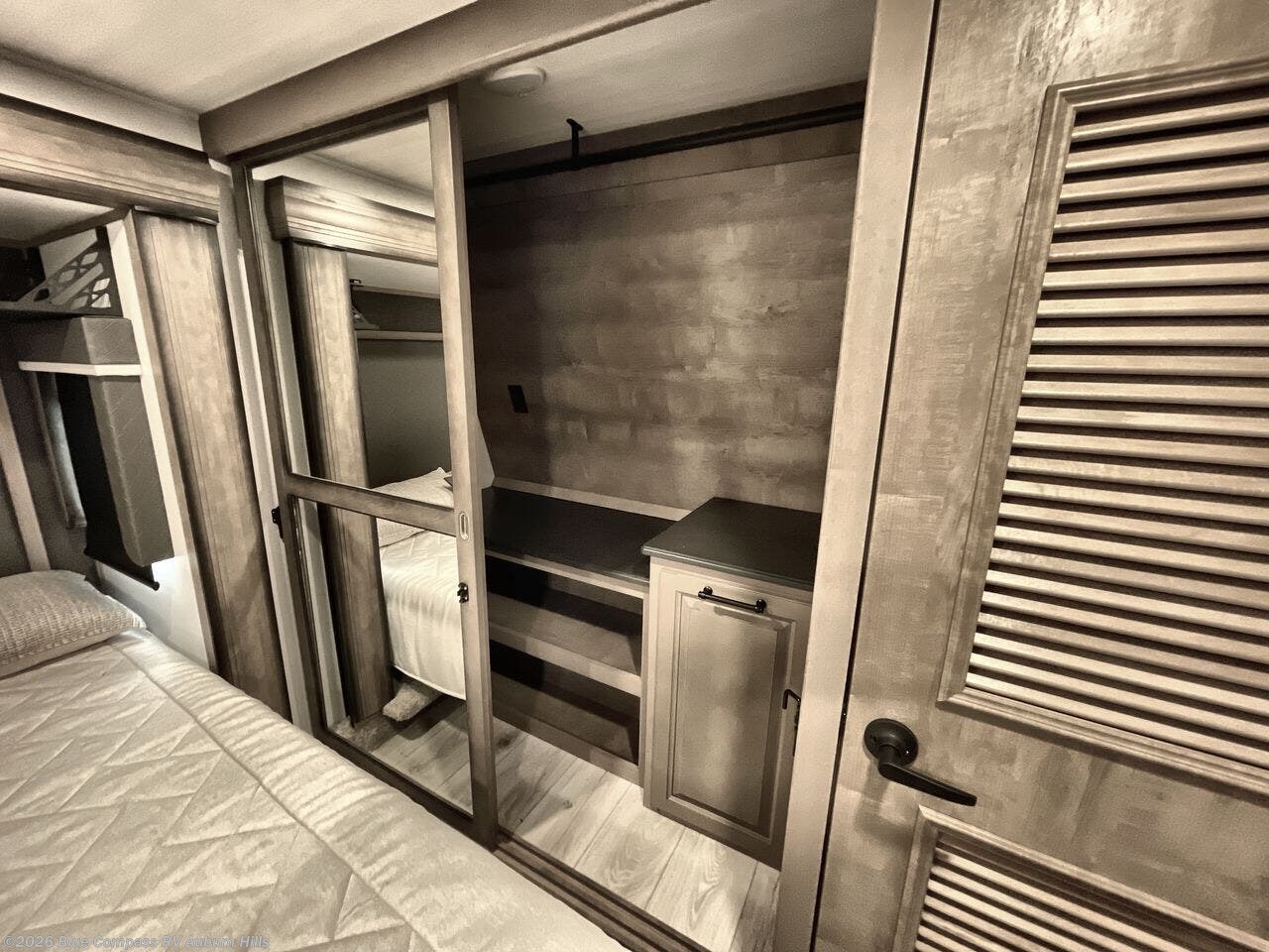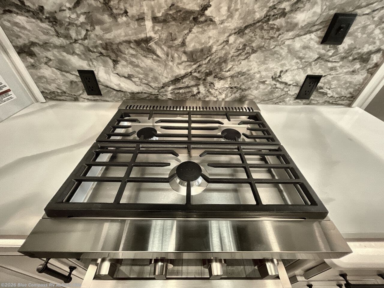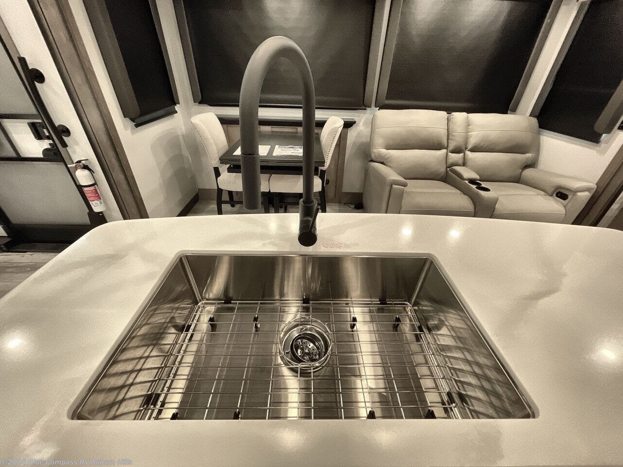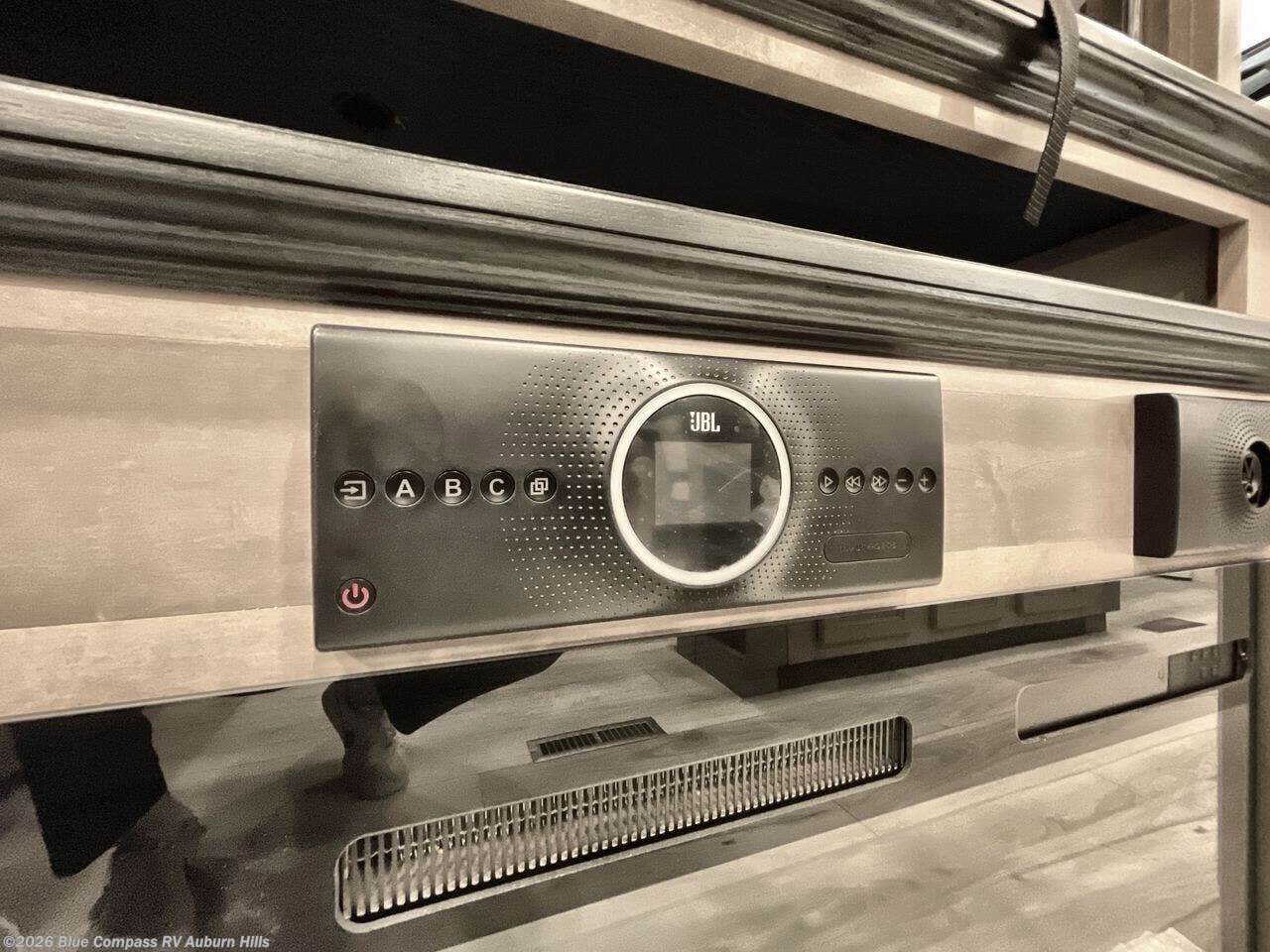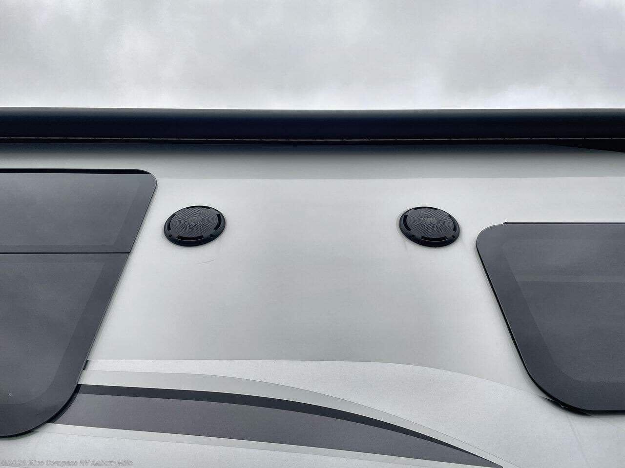 Luxury abounds throughout this fifth wheel! Starting in the kitchen with the island, floor to ceiling pantry with shelves, 24" range, and residential convection microwave. The full bathroom has a 48" x 30" fiberglass shower with a seat, decorative glass enclosure, and a skylight above it for more natural lighting. Sleep like a baby in the front private bedroom on the king bed slide with storage underneath and keep your clothes looking their best with the front closet that has a clothing hamper and stackable washer and dryer prep. The rear living area offers true relaxation with a hide-a-bed sofa and power theater seating across from the entertainment center with a 5,000 BTU decorative fireplace heater and 50" Smart TV to watch your favorite movies!