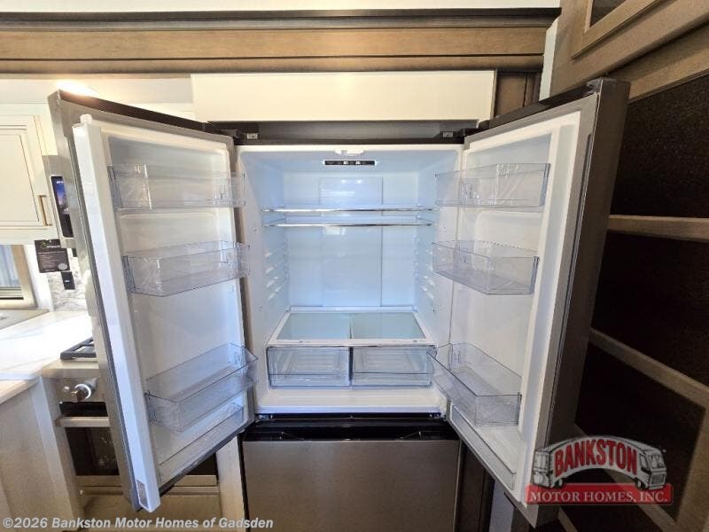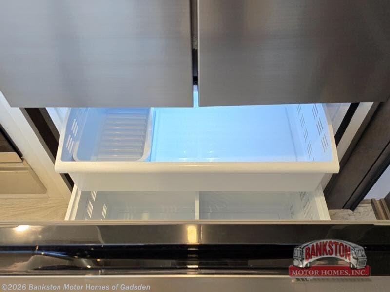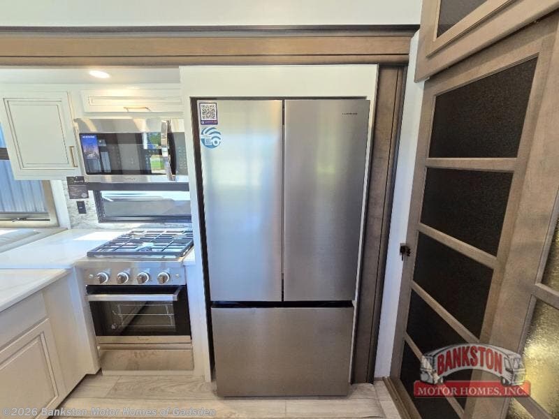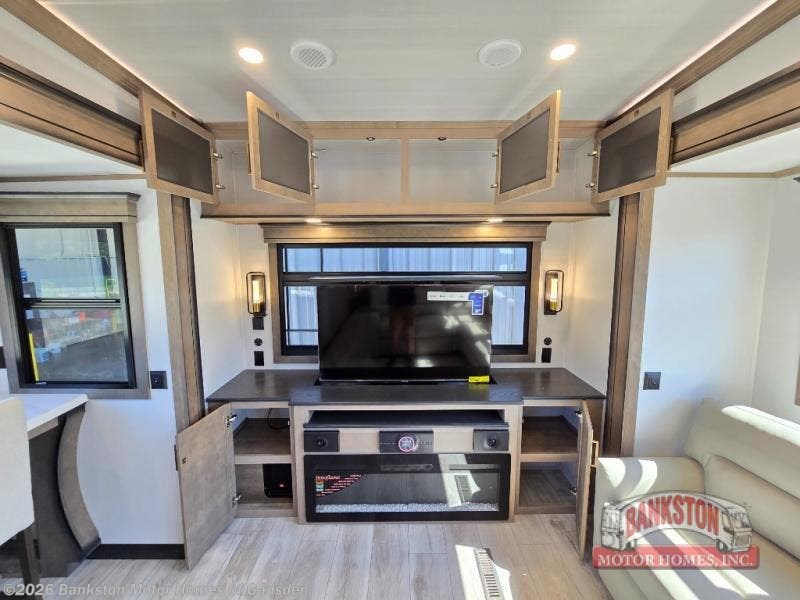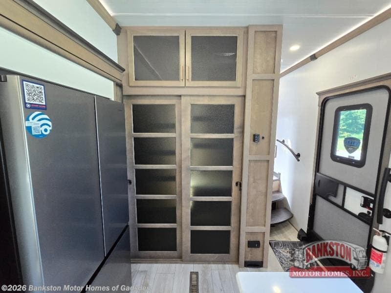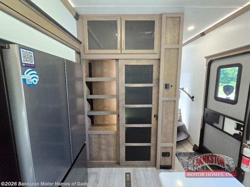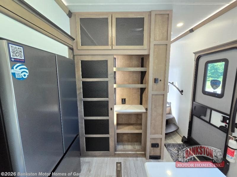 Luxury abounds throughout this fifth wheel starting in the centrally located kitchen featuring an L-shaped counter, a large floor to ceiling pantry with sliding glass doors, a 24" range with an overhead convection microwave, and an 18 cu. ft. residential refrigerator with ice an maker. Just up the steps to the right of the entry, you will find a spacious bathroom featuring a 48" x 30" fiberglass shower with a seat, decorative glass enclosure, linen cabinet, and skylight above it for more natural lighting. Sleep like a baby in the front private bedroom on the king bed slide with storage underneath, and keep your clothes looking their best with the front closet that has a clothing hamper and stackable washer/dryer prep. The rear entertainment living area offers true relaxation with L-shaped seating including a hide-a-bed sofa along the roadside, and powered theater seating facing the entertainment center with a 5,000 BTU decorative fireplace heater and Smart TV to watch your favorite movies!