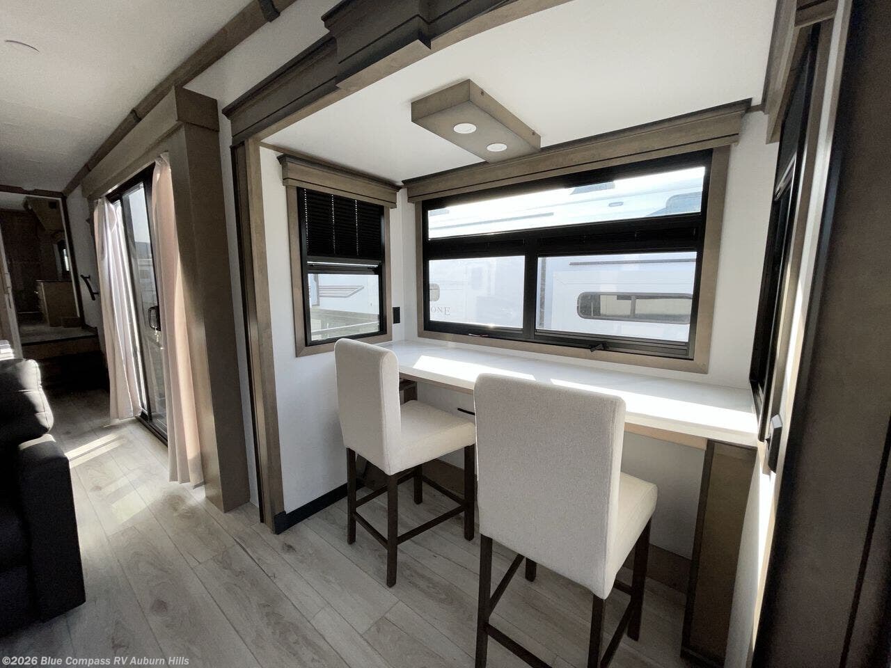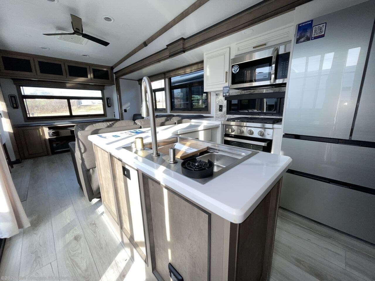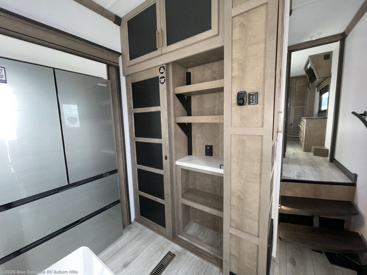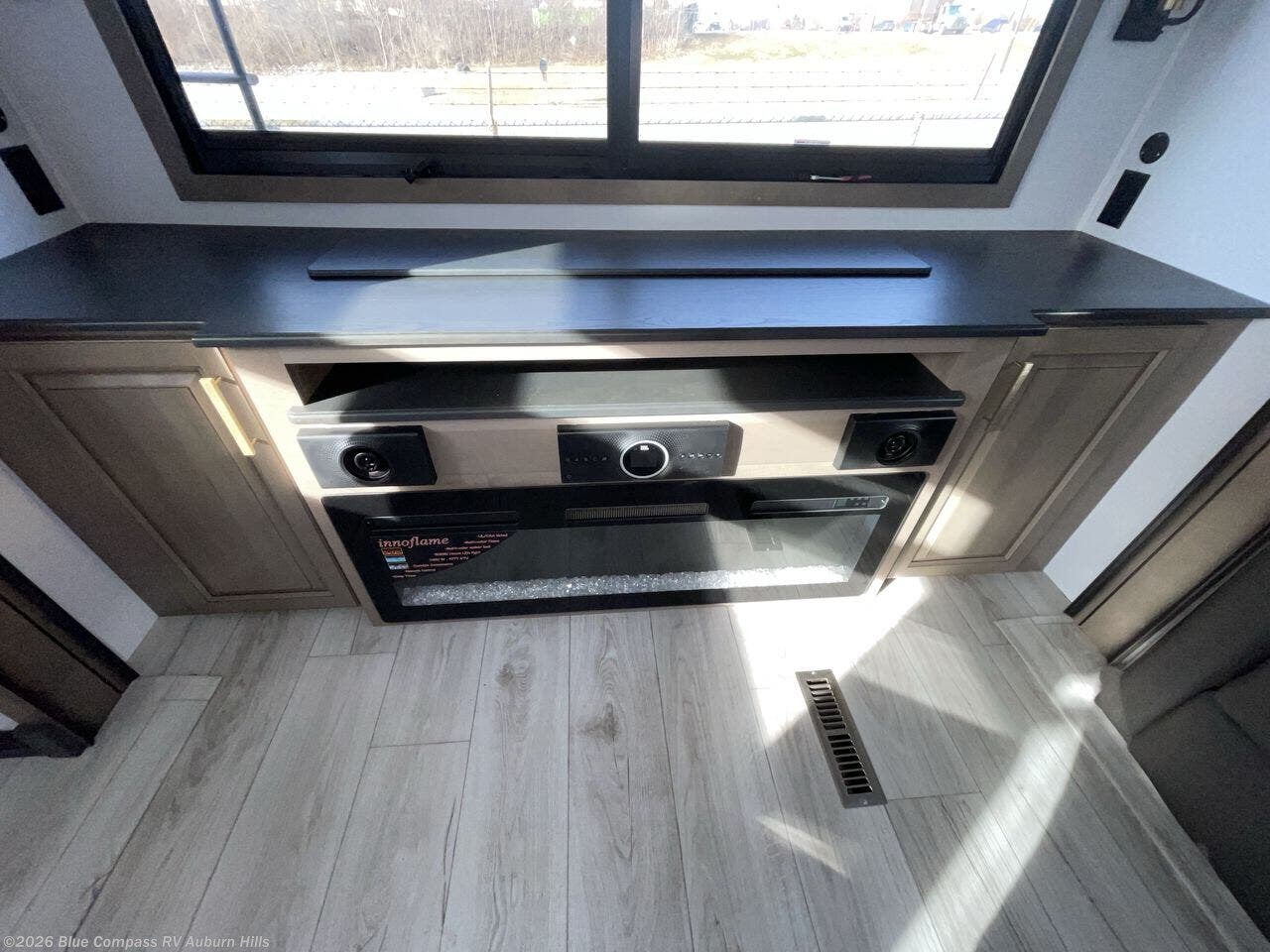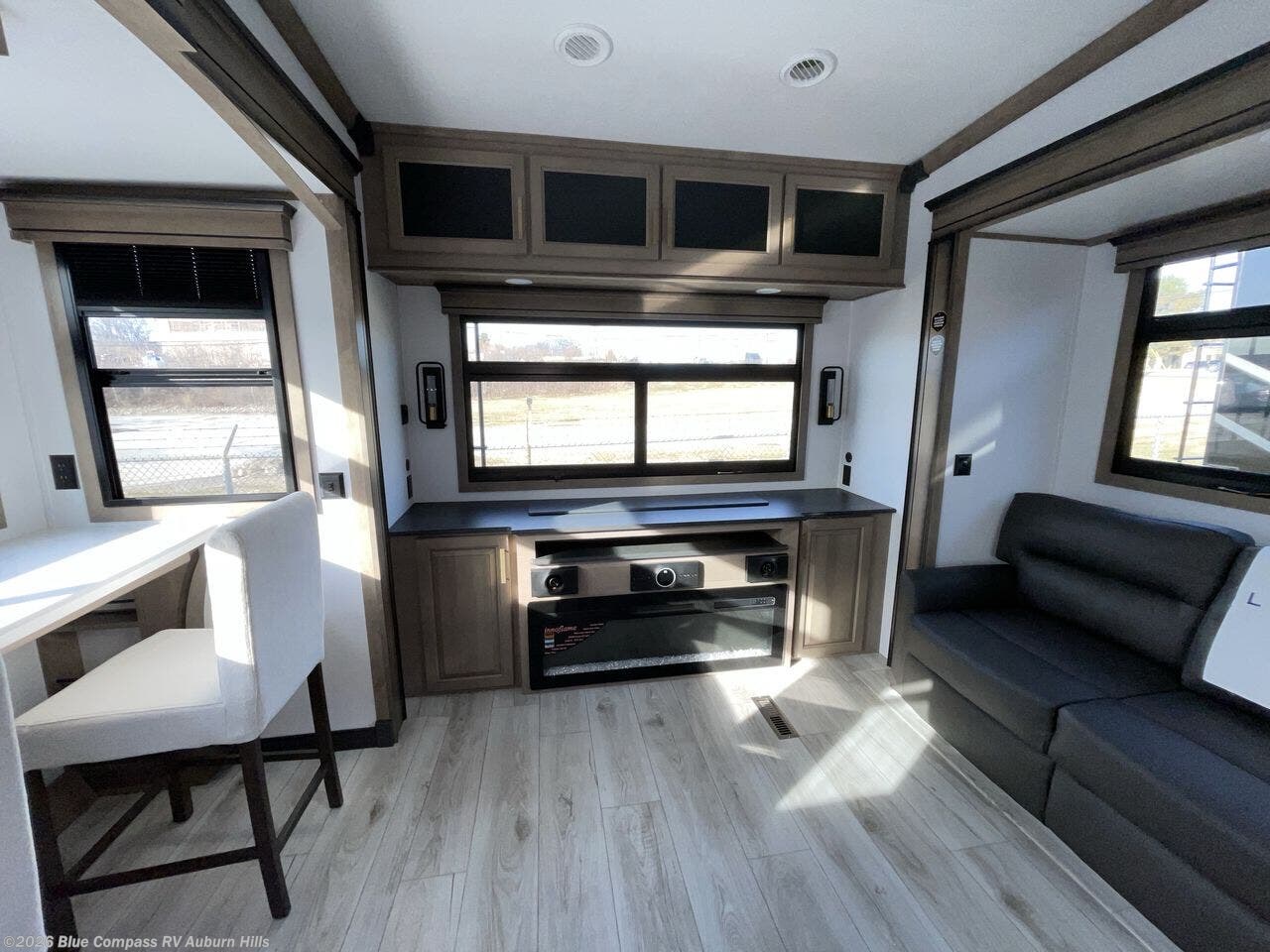Luxury abounds throughout this fifth wheel starting in the centrally located kitchen featuring an L-shaped counter, a large floor to ceiling pantry with sliding glass doors, a 24" range with an overhead convection microwave, and an 18 cu. ft. residential refrigerator with ice an maker. Just up the steps to the right of the entry, you will find a spacious bathroom featuring a 48" x 30" fiberglass shower with a seat, decorative glass enclosure, linen cabinet, and skylight above it for more natural lighting. Sleep like a baby in the front private bedroom on the king bed slide with storage underneath, and keep your clothes looking their best with the front closets. The rear entertainment living area offers true relaxation with L-shaped seating including a hide-a-bed sofa along the roadside, and powered theater seating facing the entertainment center with a 5,000 BTU decorative fireplace heater and Smart TV to watch your favorite movies! And don't overlook the best part, the powered side patio to entertain guests!