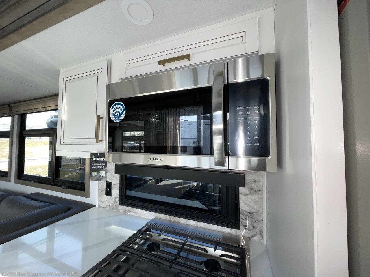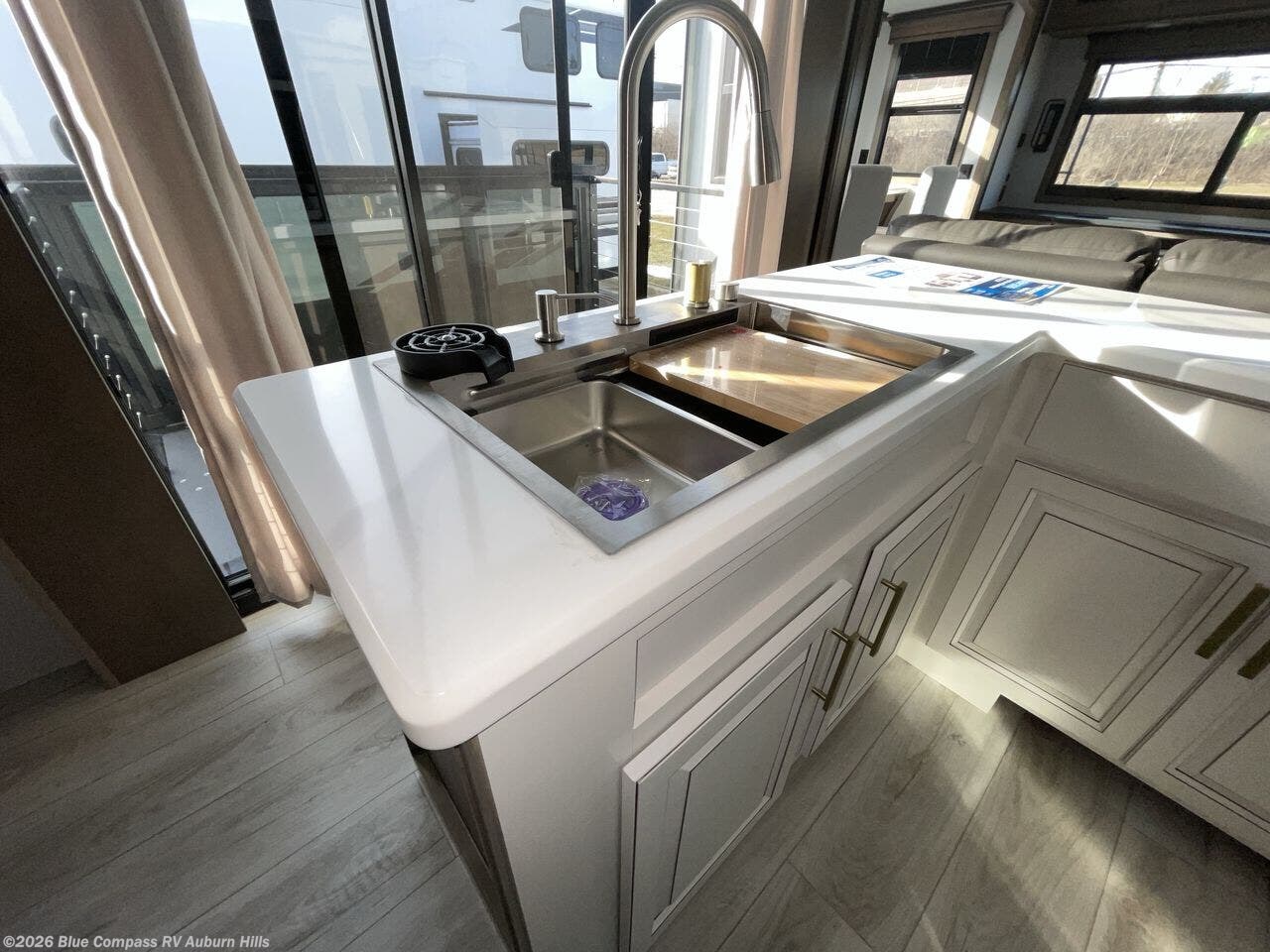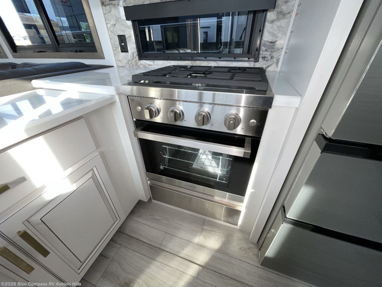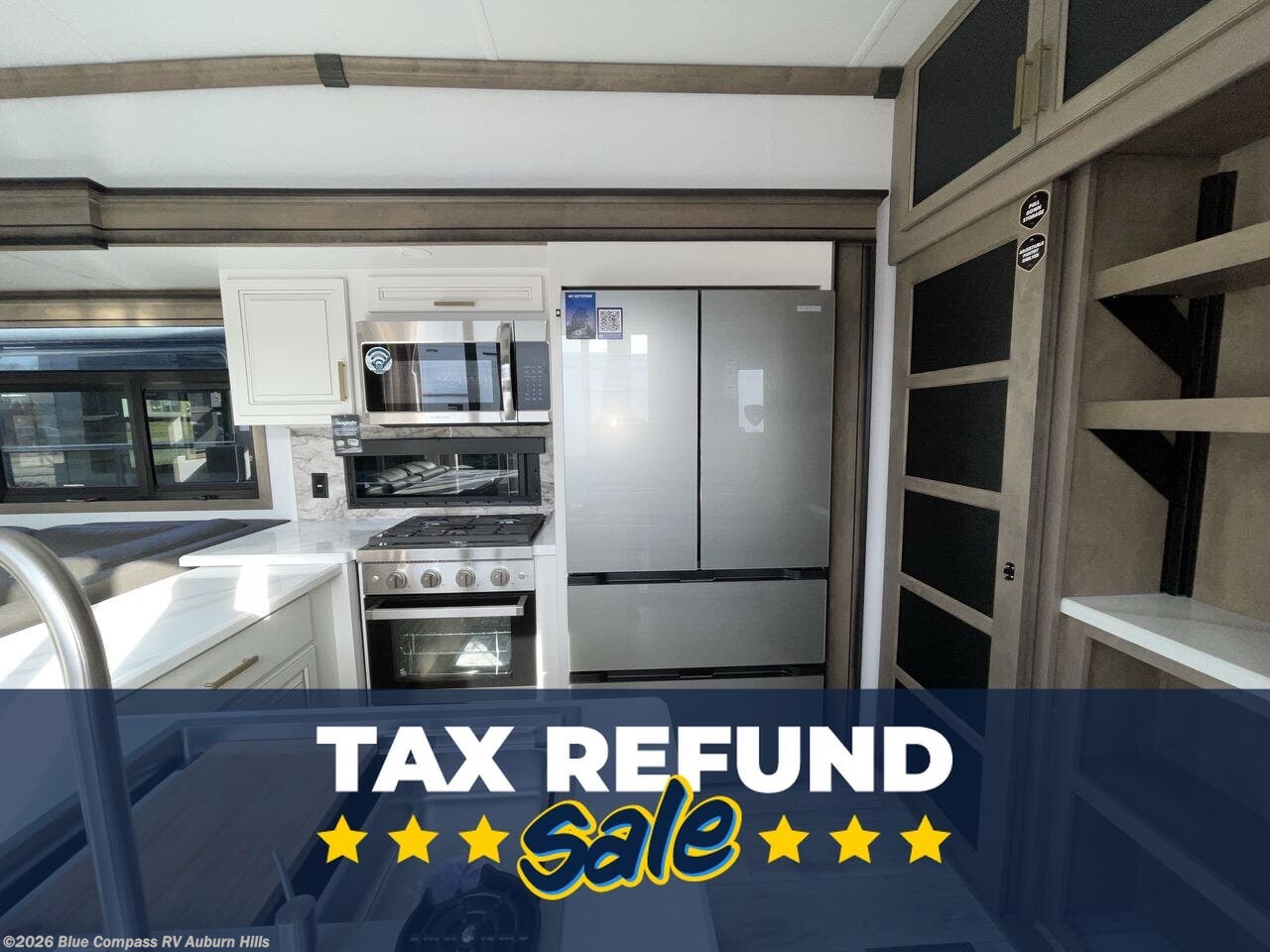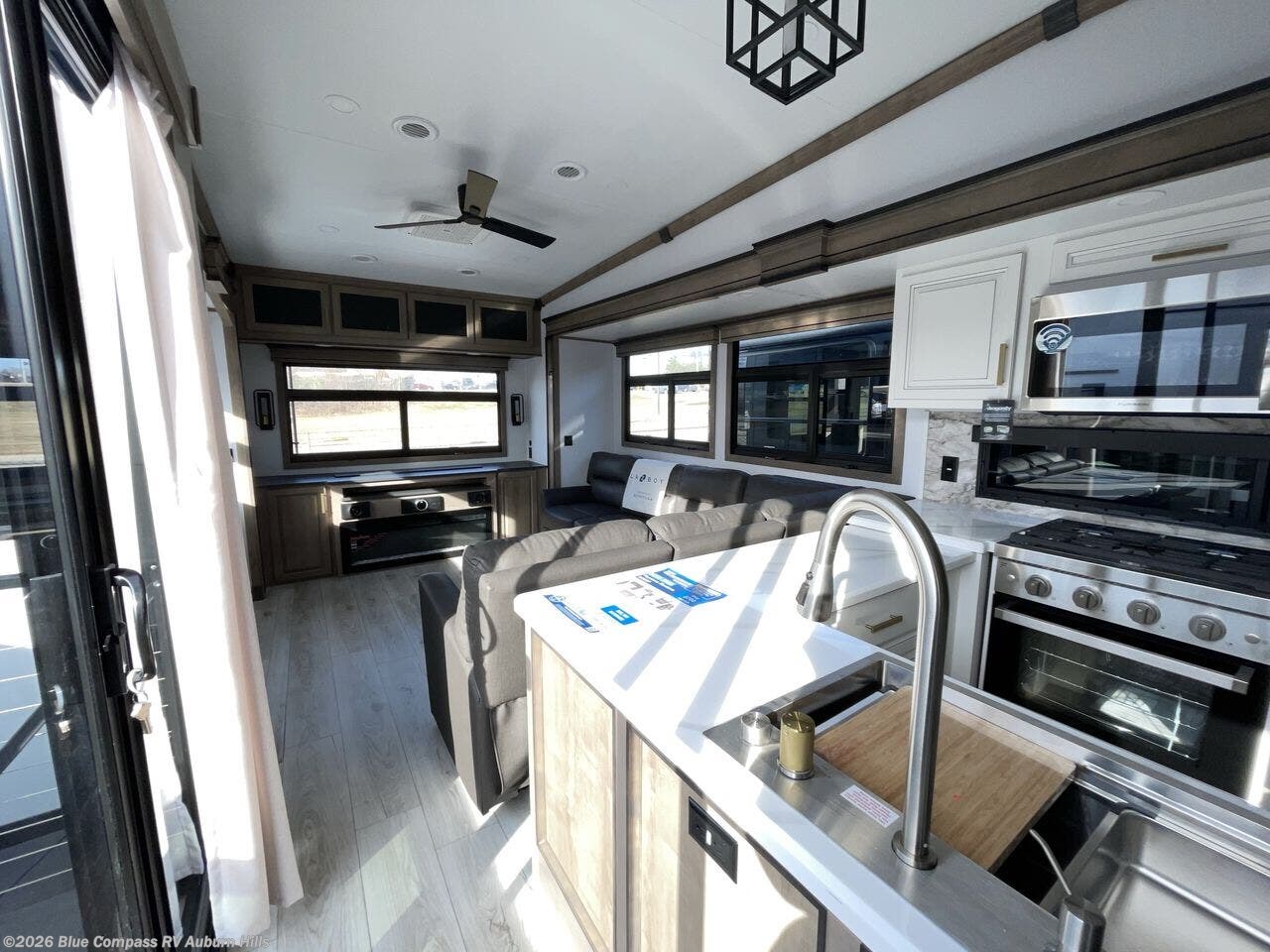 Luxury abounds throughout this fifth wheel starting in the centrally located kitchen featuring an L-shaped counter, a large floor to ceiling pantry with sliding glass doors, a 24" range with an overhead convection microwave, and an 18 cu. ft. residential refrigerator with ice an maker. Just up the steps to the right of the entry, you will find a spacious bathroom featuring a 48" x 30" fiberglass shower with a seat, decorative glass enclosure, linen cabinet, and skylight above it for more natural lighting. Sleep like a baby in the front private bedroom on the king bed slide with storage underneath, and keep your clothes looking their best with the front closets. The rear entertainment living area offers true relaxation with L-shaped seating including a hide-a-bed sofa along the roadside, and powered theater seating facing the entertainment center with a 5,000 BTU decorative fireplace heater and Smart TV to watch your favorite movies! And don't overlook the best part, the powered side patio to entertain guests!