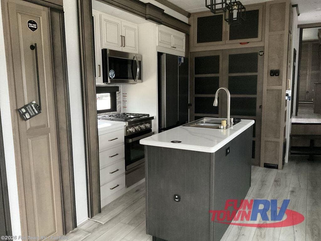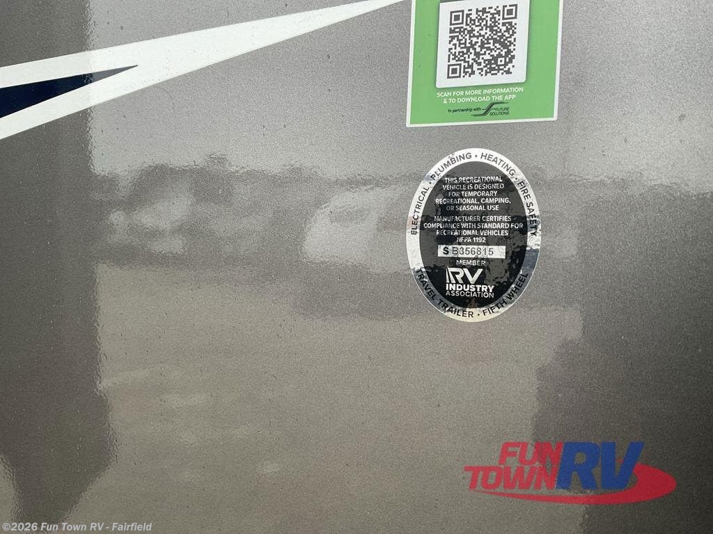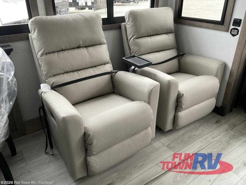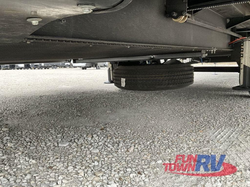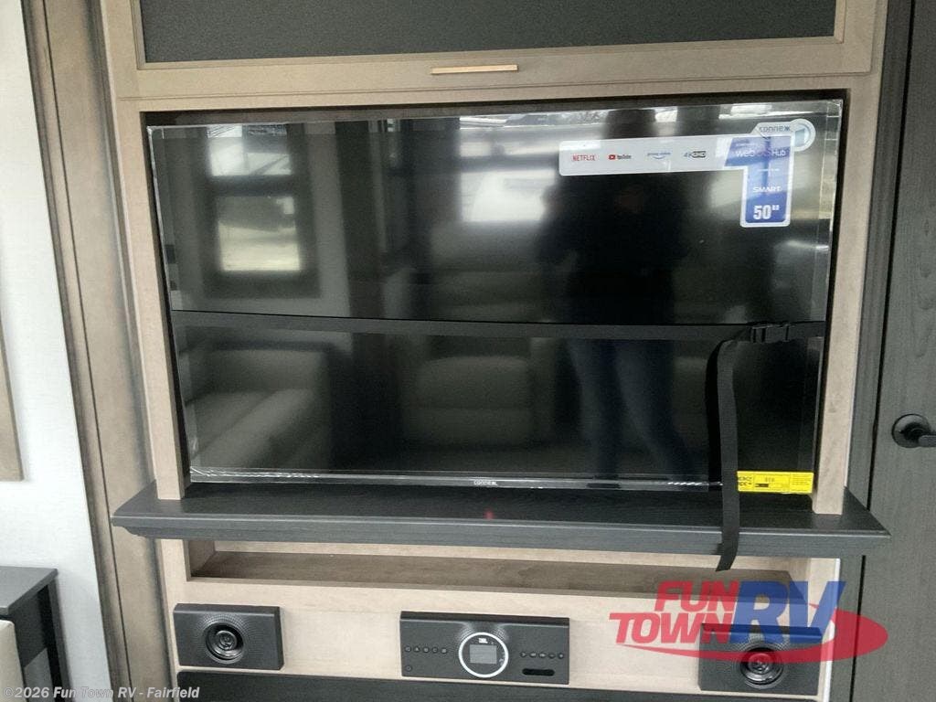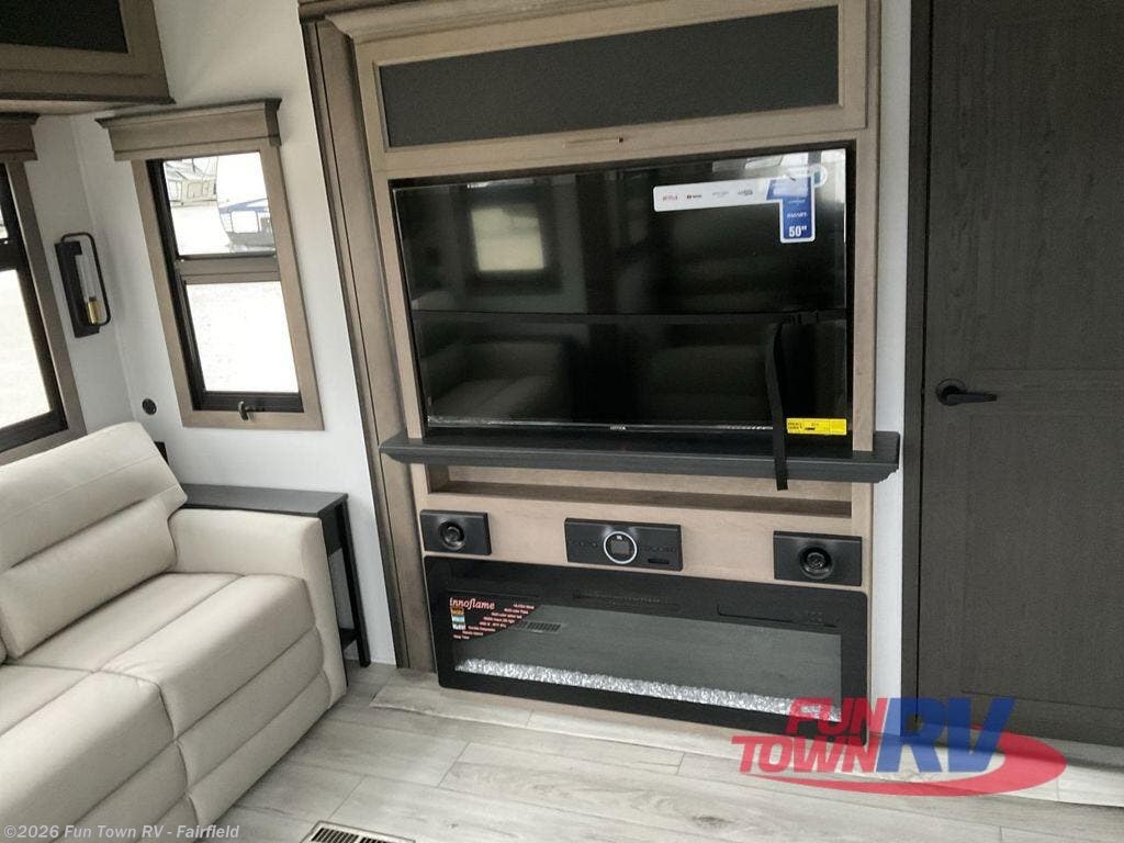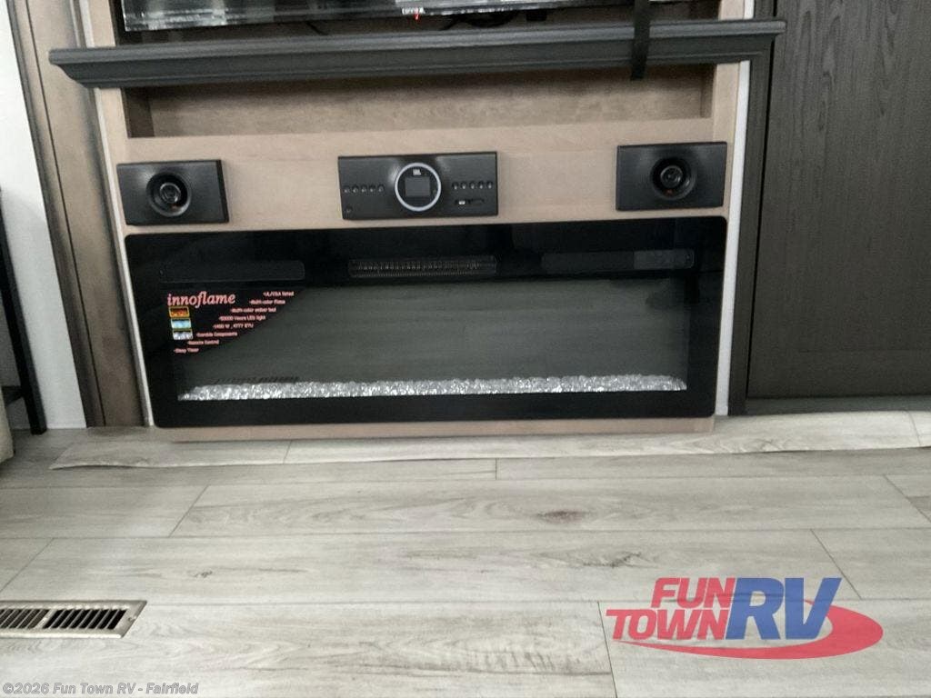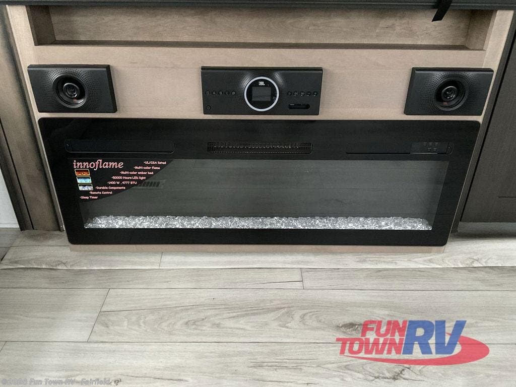 This fifth wheel has everything you need! The front private bedroom has a king bed slide across from a Smart HDTV with a dresser below it, plus a large front closet with a clothing hamper and stackable washer and dryer prep. Freshen up each morning in the full bathroom with the 48" x 30" fiberglass shower with a seat and skylight above for more natural lighting as you get ready. The kitchen has everything you need to prepare your best meals including extra countertop space on the kitchen island. Enjoy your meals at the dinette with storage and then relax on the rear hide-a-bed sofa or the power theater seating across from the entertainment center with a 5,000 BTU decorative fireplace heater and 50" Smart HDTV to watch your favorite movies!