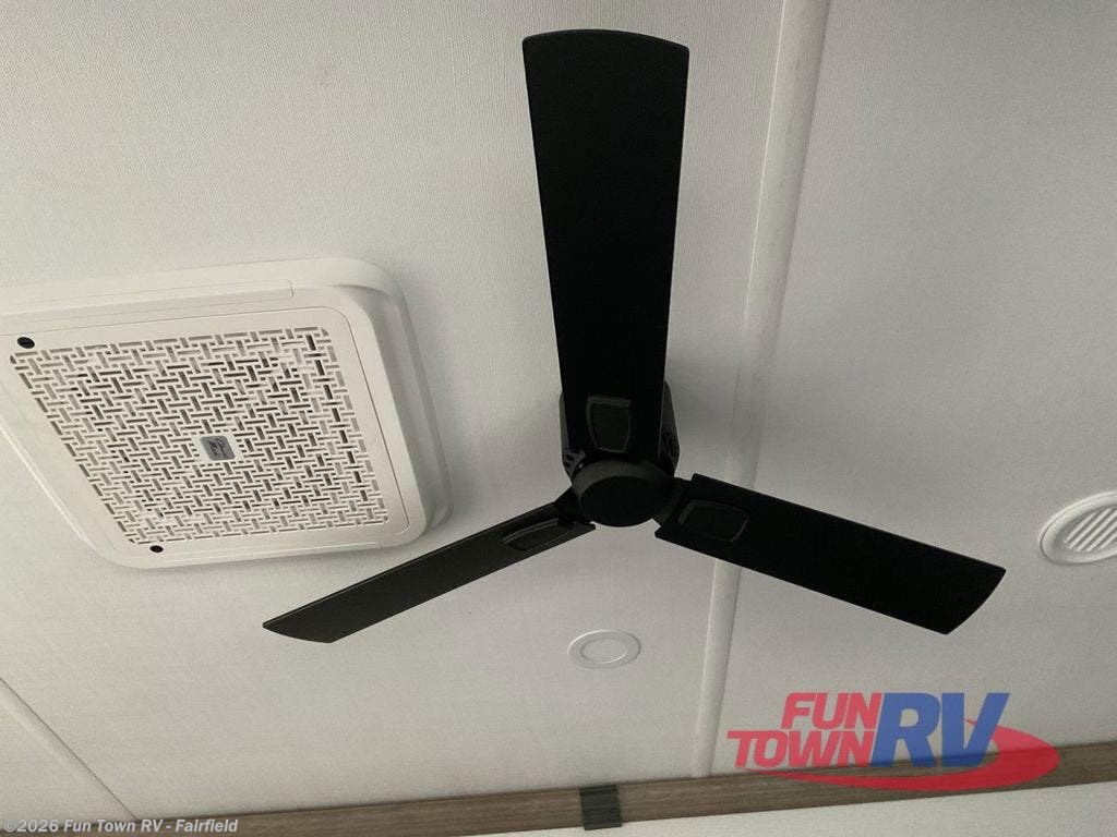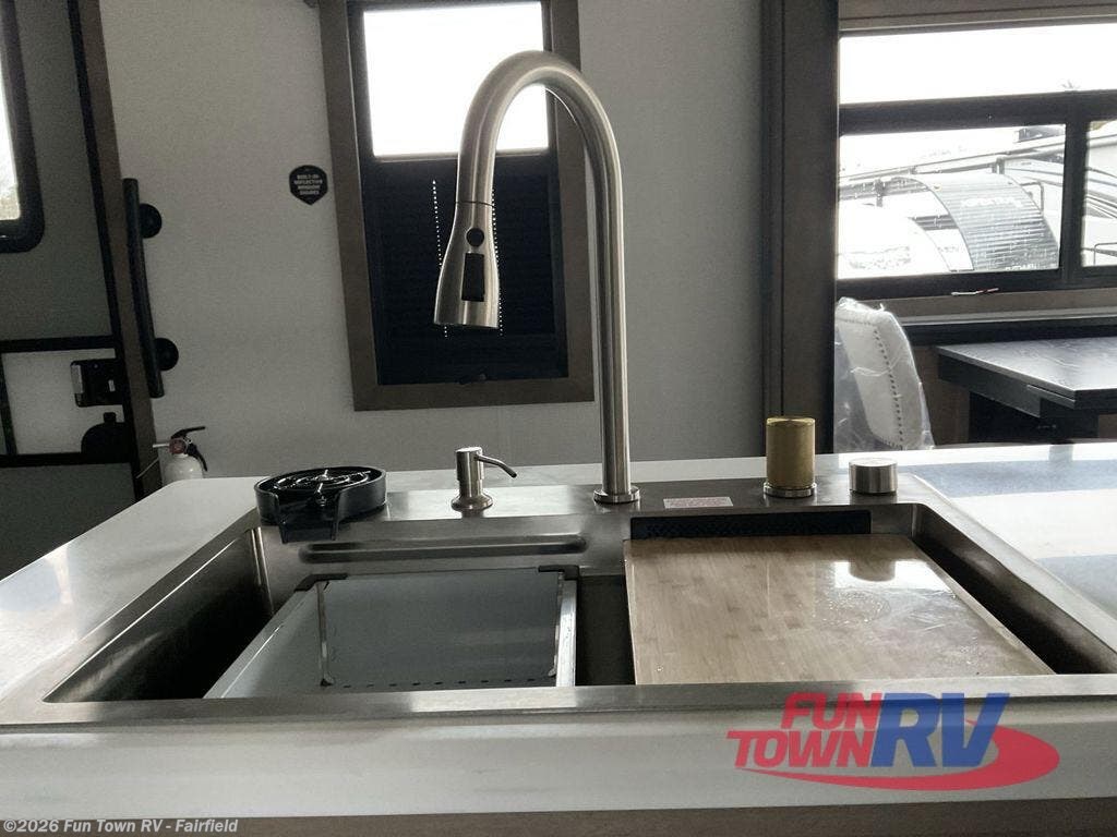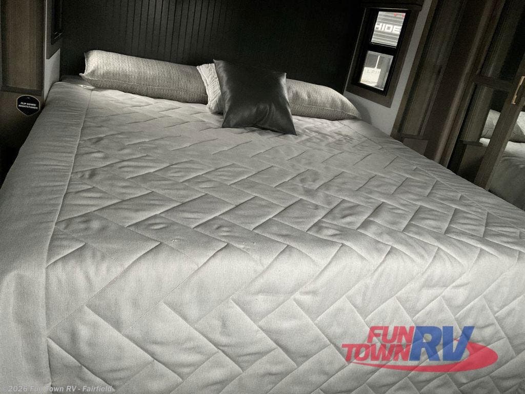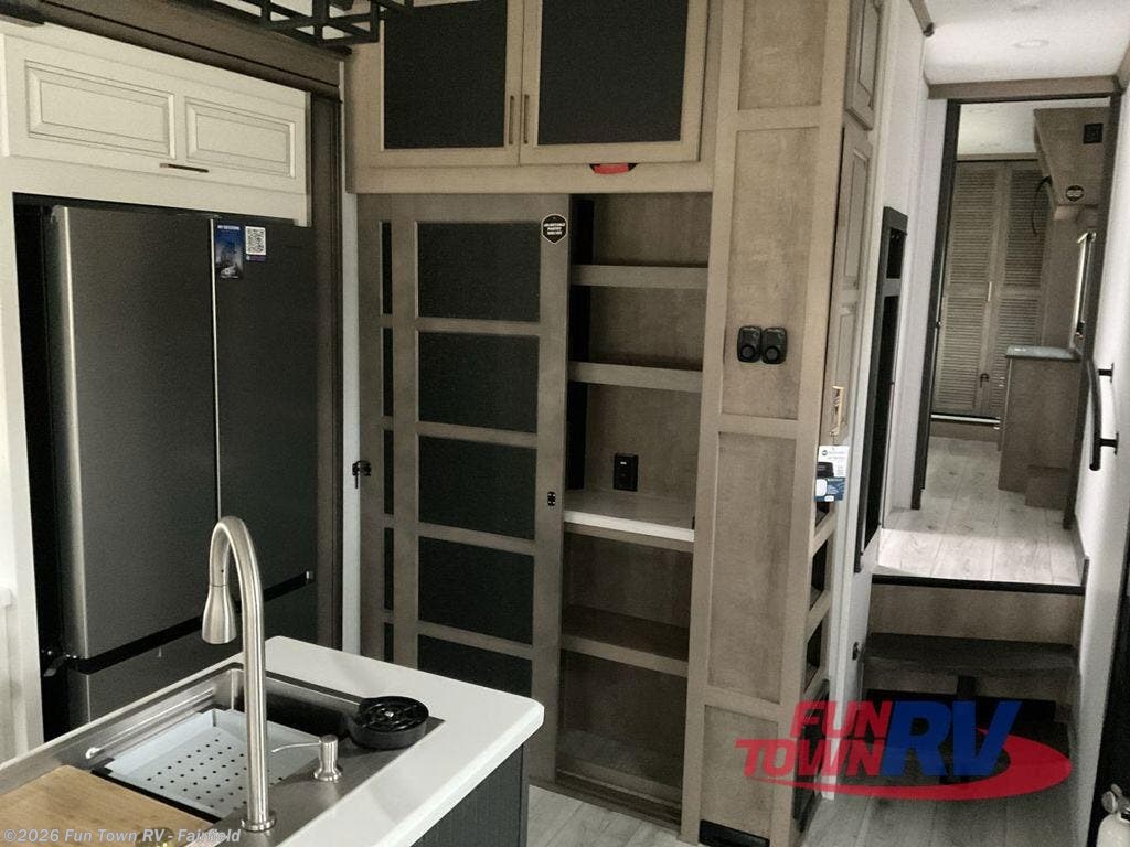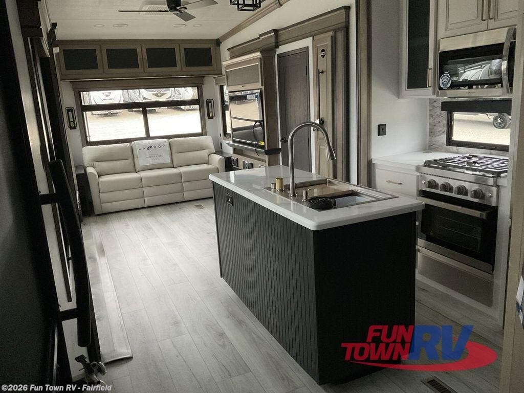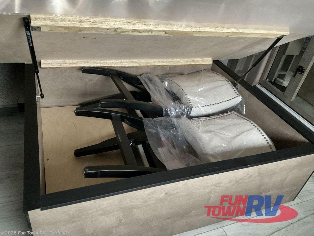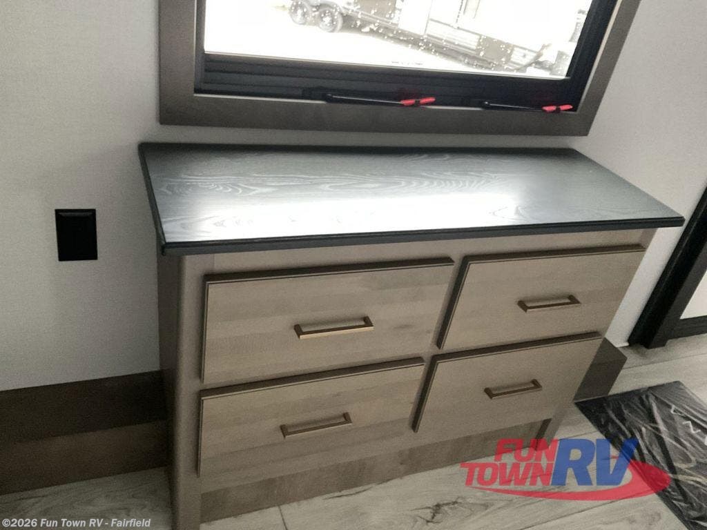 This fifth wheel has everything you need! The front private bedroom has a king bed slide across from a Smart HDTV with a dresser below it, plus a large front closet with a clothing hamper and stackable washer and dryer prep. Freshen up each morning in the full bathroom with the 48" x 30" fiberglass shower with a seat and skylight above for more natural lighting as you get ready. The kitchen has everything you need to prepare your best meals including extra countertop space on the kitchen island. Enjoy your meals at the dinette with storage and then relax on the rear hide-a-bed sofa or the power theater seating across from the entertainment center with a 5,000 BTU decorative fireplace heater and 50" Smart HDTV to watch your favorite movies!