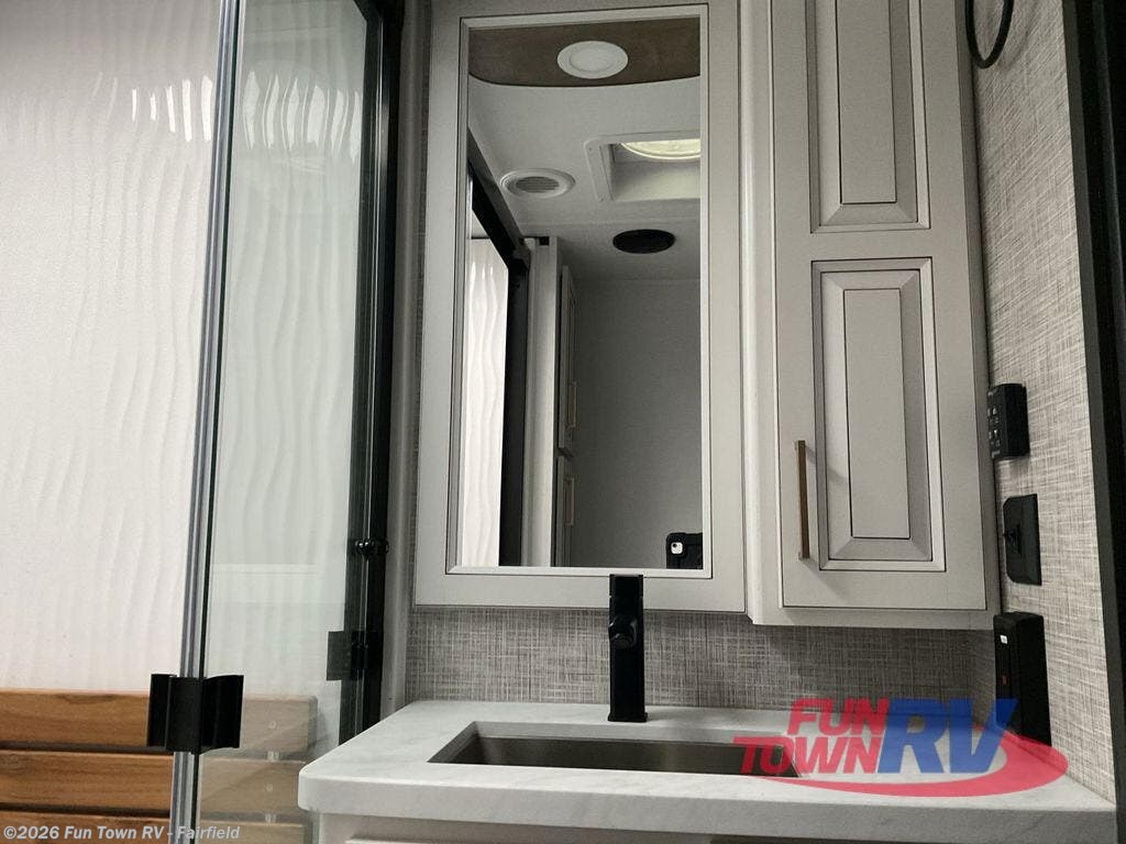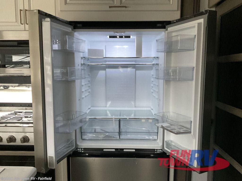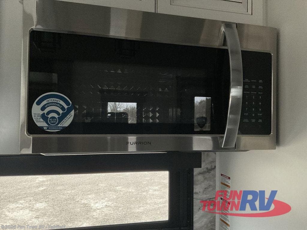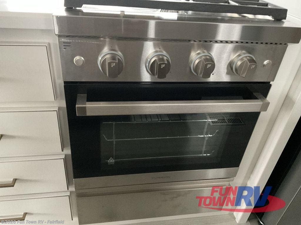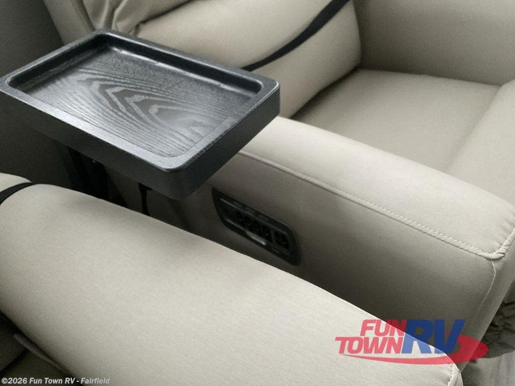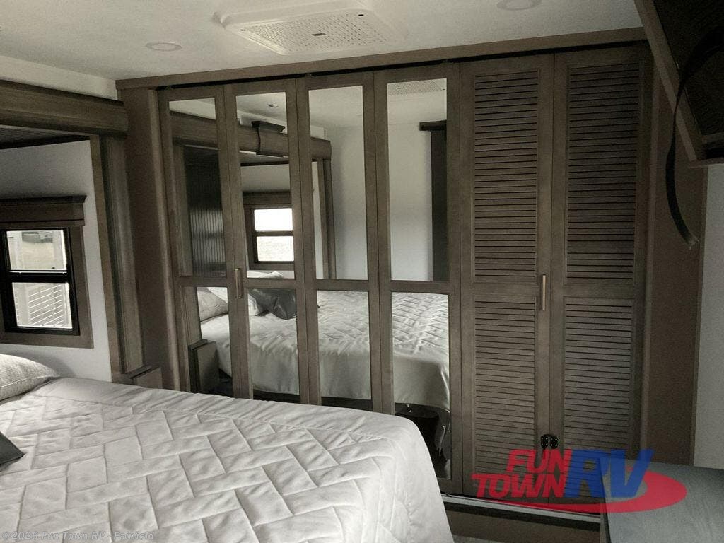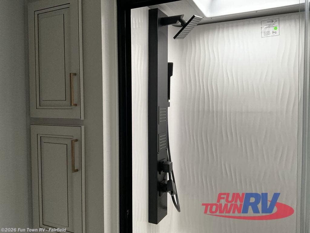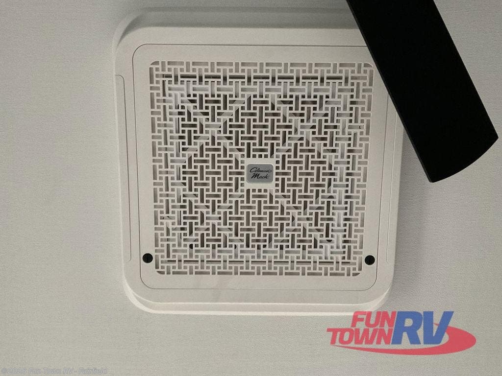 This fifth wheel has everything you need! The front private bedroom has a king bed slide across from a Smart HDTV with a dresser below it, plus a large front closet with a clothing hamper and stackable washer and dryer prep. Freshen up each morning in the full bathroom with the 48" x 30" fiberglass shower with a seat and skylight above for more natural lighting as you get ready. The kitchen has everything you need to prepare your best meals including extra countertop space on the kitchen island. Enjoy your meals at the dinette with storage and then relax on the rear hide-a-bed sofa or the power theater seating across from the entertainment center with a 5,000 BTU decorative fireplace heater and 50" Smart HDTV to watch your favorite movies!
