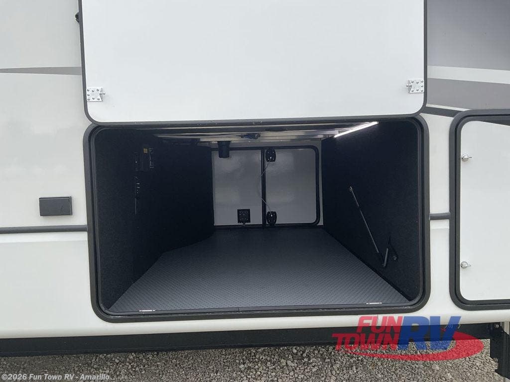 This fifth wheel has everything you need! The front private bedroom has a king bed slide across from a Smart HDTV with a dresser below it, plus a large front closet with a clothing hamper and stackable washer and dryer prep. Freshen up each morning in the full bathroom with the 48" x 30" fiberglass shower with a seat and skylight above for more natural lighting as you get ready. The kitchen has everything you need to prepare your best meals including extra countertop space on the kitchen island. Enjoy your meals at the dinette with storage and then relax on the rear hide-a-bed sofa or the power theater seating across from the entertainment center with a 5,000 BTU decorative fireplace heater and 50" Smart HDTV to watch your favorite movies!