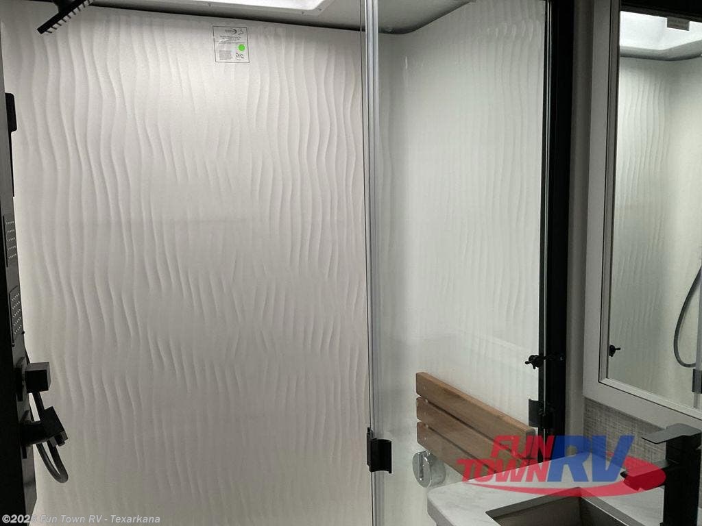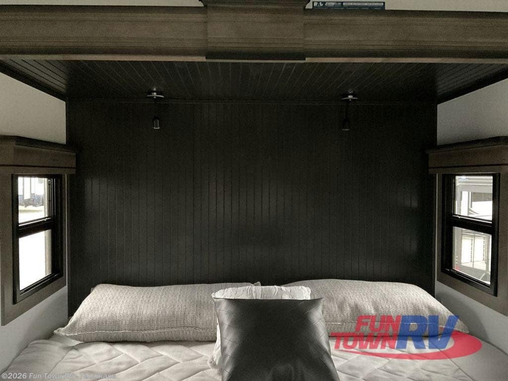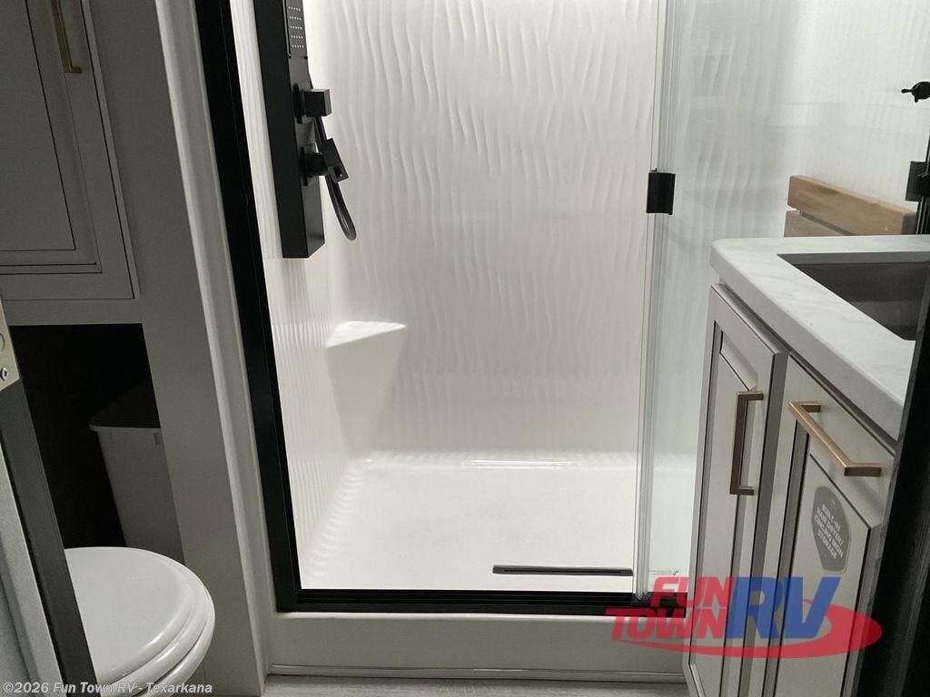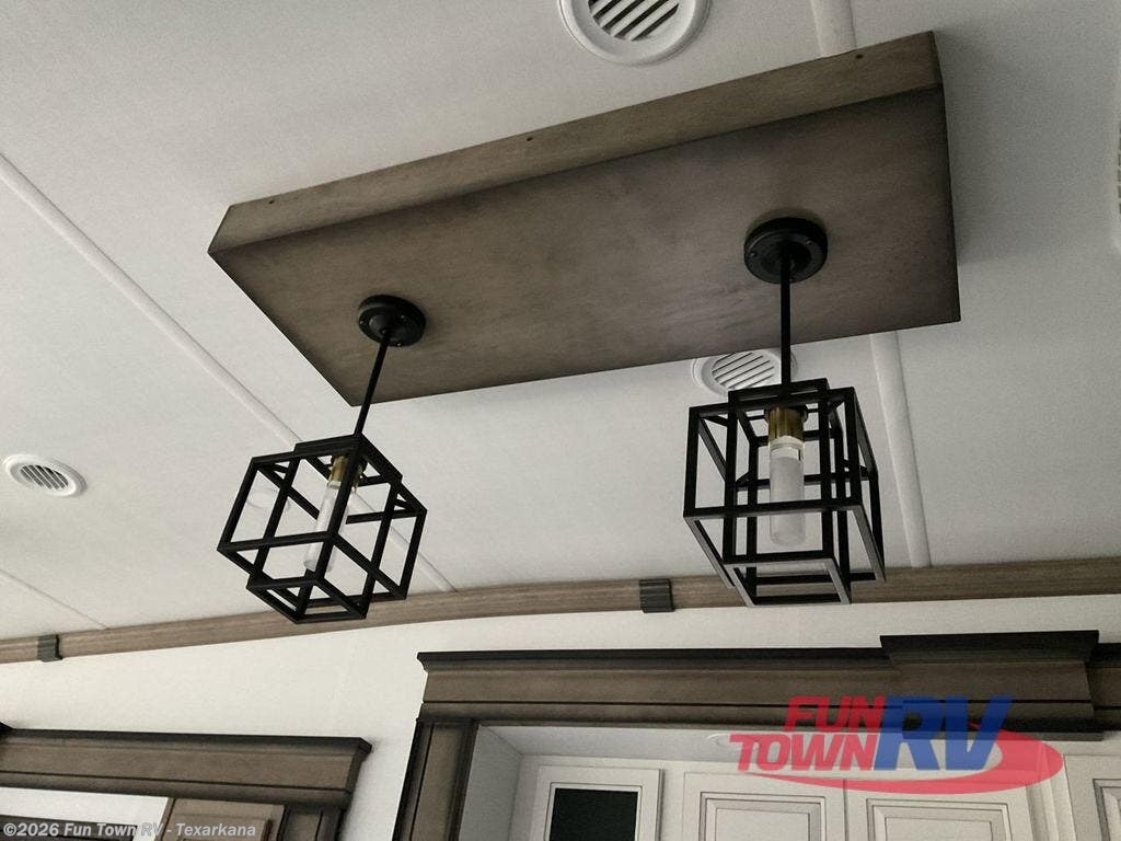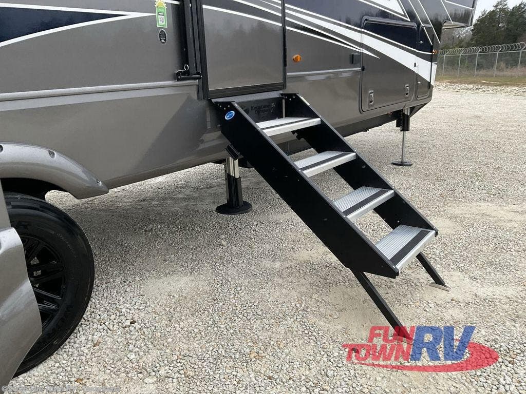 This fifth wheel has everything you need! The front private bedroom has a king bed slide across from a Smart HDTV with a dresser below it, plus a large front closet with a clothing hamper and stackable washer and dryer prep. Freshen up each morning in the full bathroom with the 48" x 30" fiberglass shower with a seat and skylight above for more natural lighting as you get ready. The kitchen has everything you need to prepare your best meals including extra countertop space on the kitchen island. Enjoy your meals at the dinette with storage and then relax on the rear hide-a-bed sofa or the power theater seating across from the entertainment center with a 5,000 BTU decorative fireplace heater and 50" Smart HDTV to watch your favorite movies!