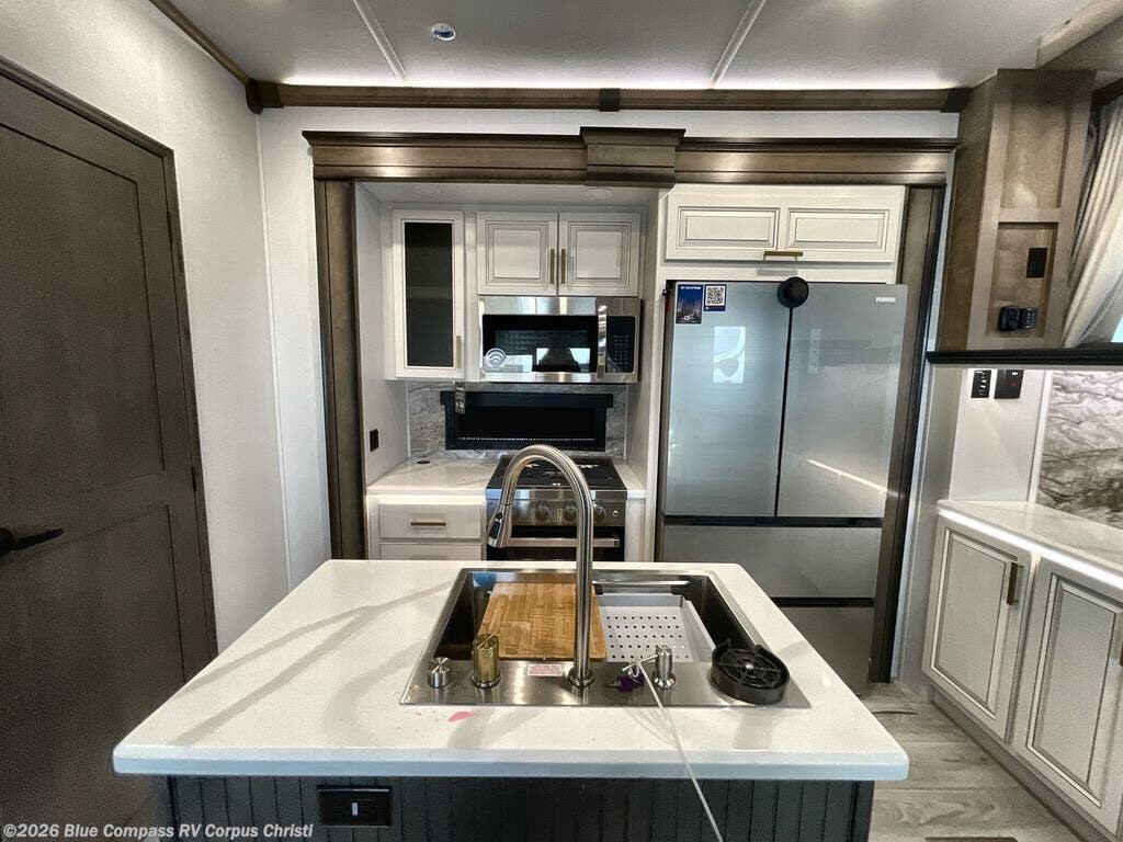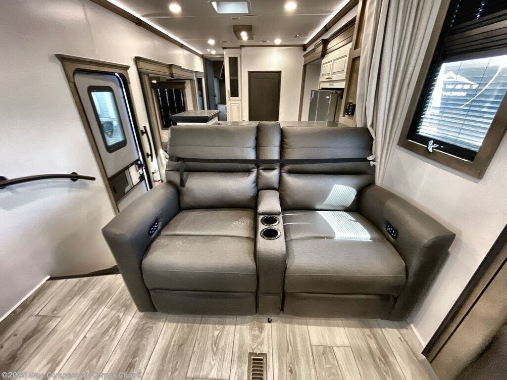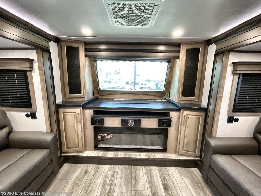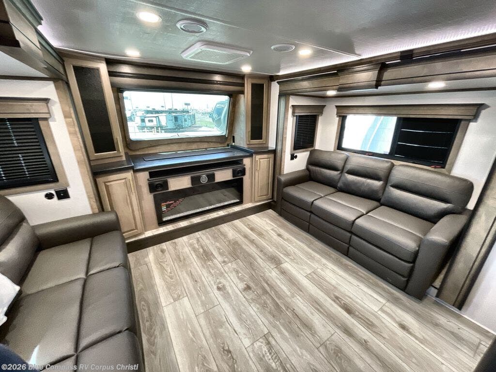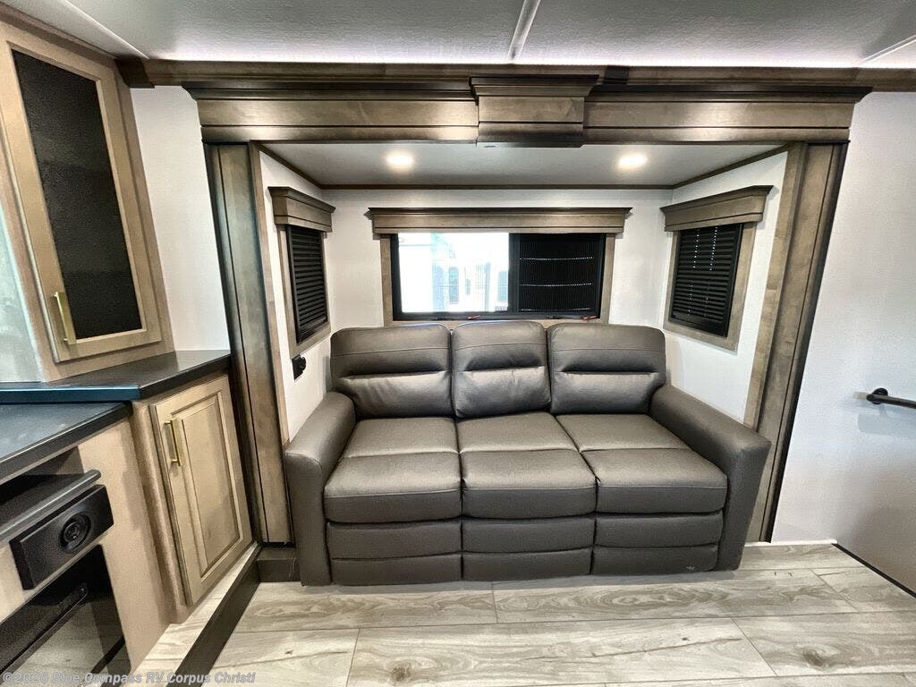Life will be easier at the campground in this fifth wheel with a bath and a half! The full rear bathroom has a 48" x 30" fiberglass shower with a seat and skylight above, a linen closet to keep your towels close, a dual sink vanity for two to get ready at once, and a barn door to close off the master suite. The bedroom also has a king bed slide with storage underneath across from a dresser with a 32" Smart TV and wardrobe, as well as a large closet with stackable washer and dryer prep. The chef can prepare their best meals with the kitchen island, convection microwave and 24" range, plus there is a pantry/buffet and a free standing legless dinette to enjoy your meals at. The front living area will have you feeling right at home with the front entertainment center that has a telescoping 50" Smart TV, a 5,000 BTU decorative fireplace heater, and storage on either side. There is also opposing hide-a-bed sofa slides for extra sleeping spaces and power theater seating for even more comfort!