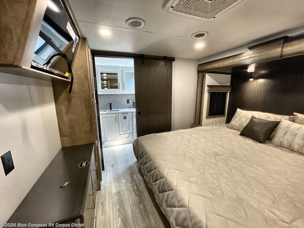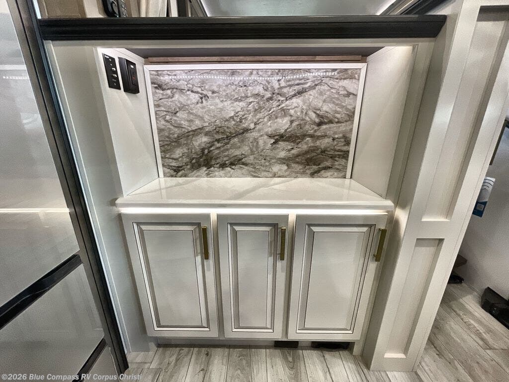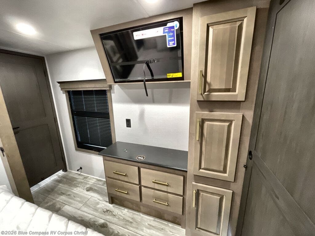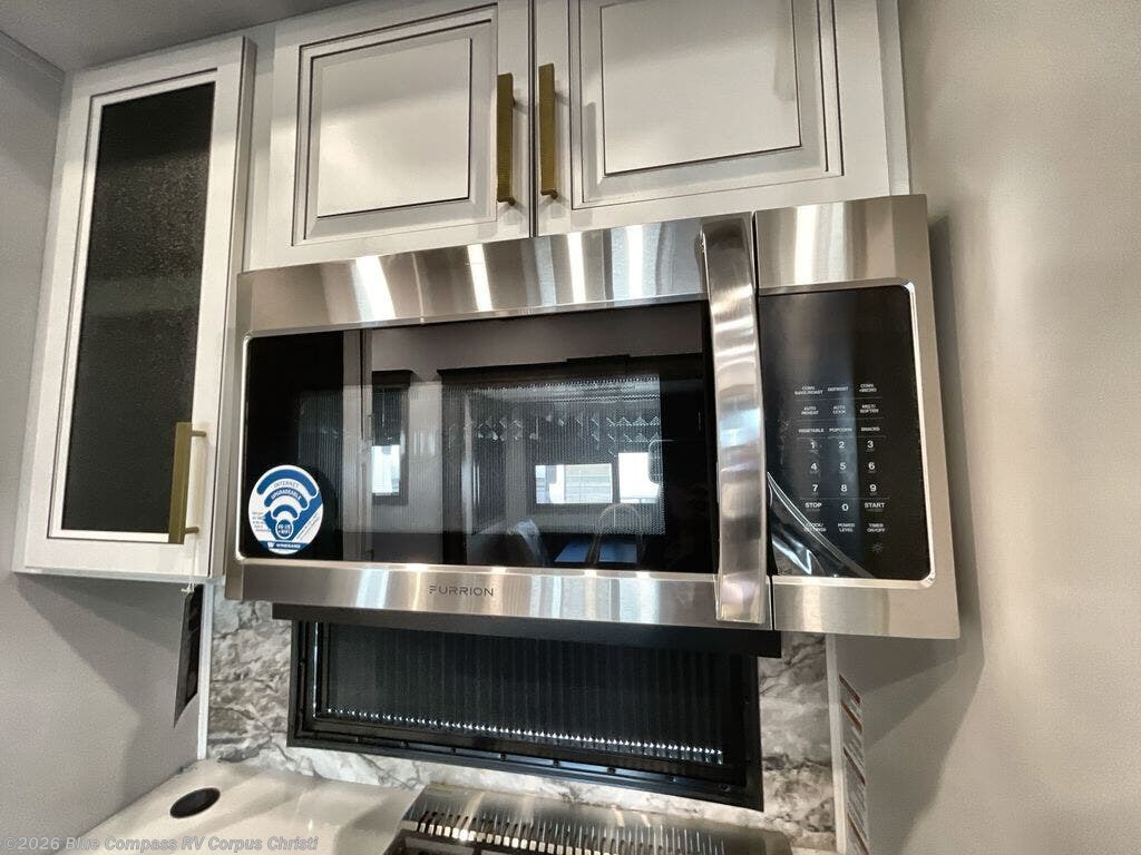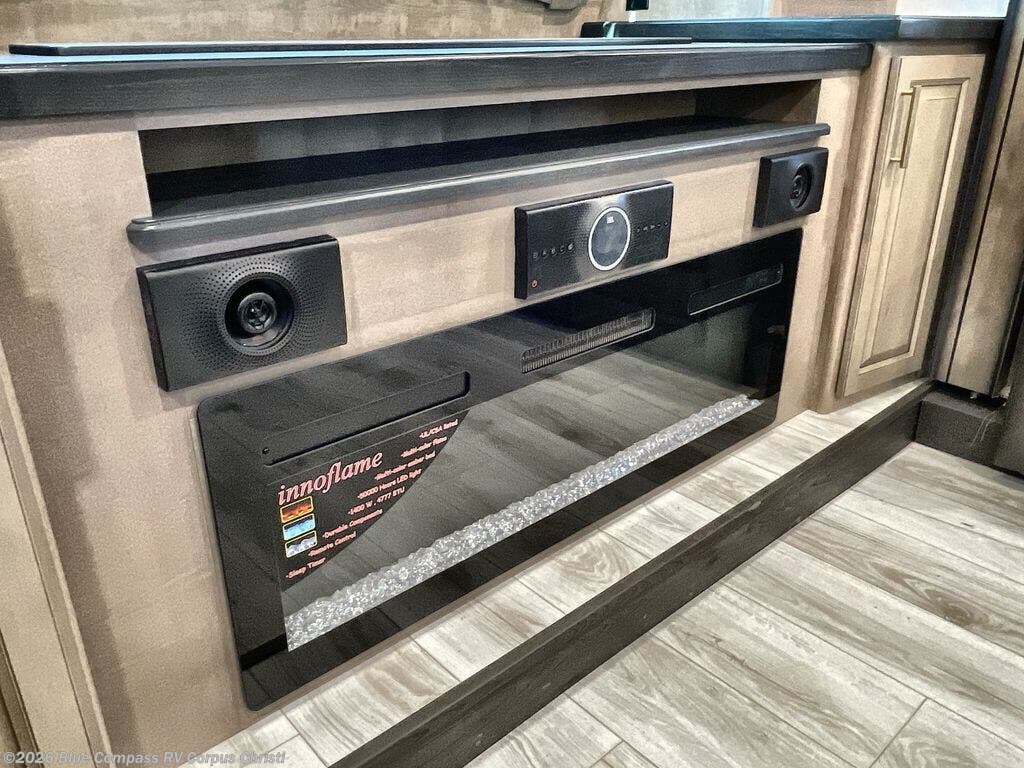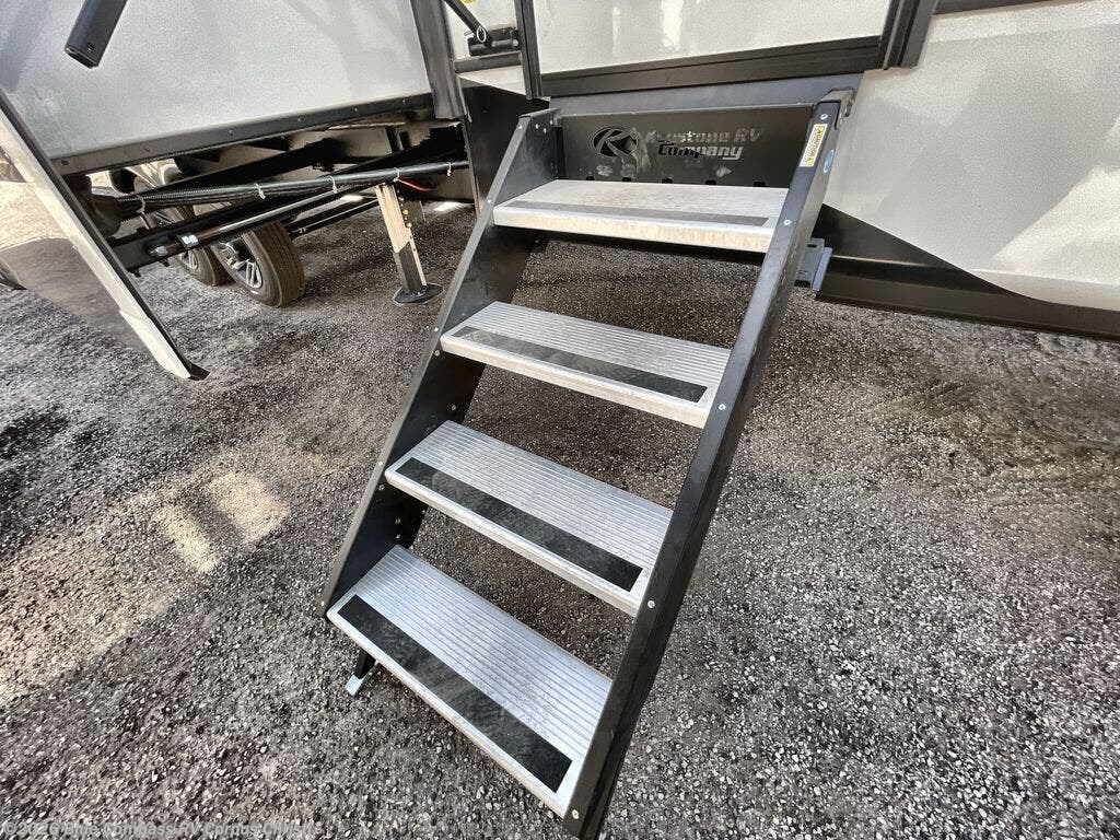 Life will be easier at the campground in this fifth wheel with a bath and a half! The full rear bathroom has a 48" x 30" fiberglass shower with a seat and skylight above, a linen closet to keep your towels close, a dual sink vanity for two to get ready at once, and a barn door to close off the master suite. The bedroom also has a king bed slide with storage underneath across from a dresser with a 32" Smart TV and wardrobe, as well as a large closet with stackable washer and dryer prep. The chef can prepare their best meals with the kitchen island, convection microwave and 24" range, plus there is a pantry/buffet and a free standing legless dinette to enjoy your meals at. The front living area will have you feeling right at home with the front entertainment center that has a telescoping 50" Smart TV, a 5,000 BTU decorative fireplace heater, and storage on either side. There is also opposing hide-a-bed sofa slides for extra sleeping spaces and power theater seating for even more comfort!