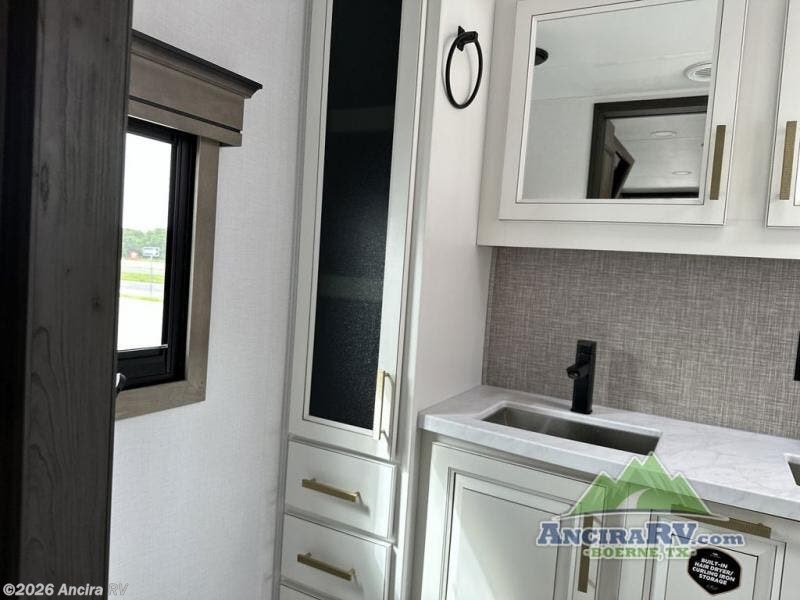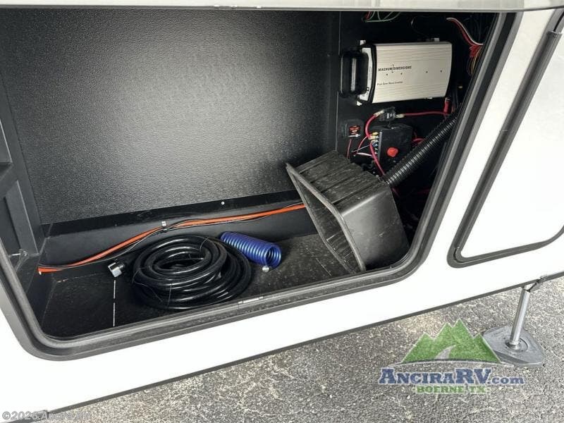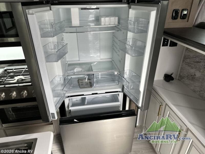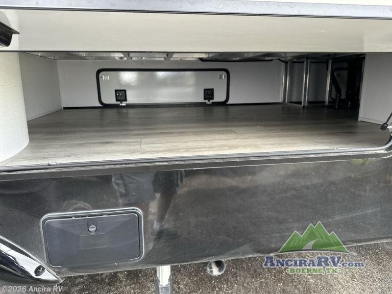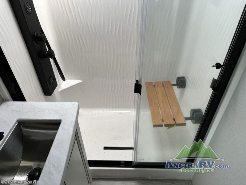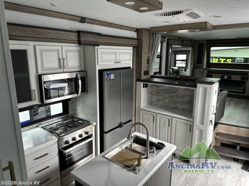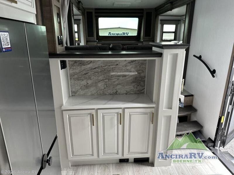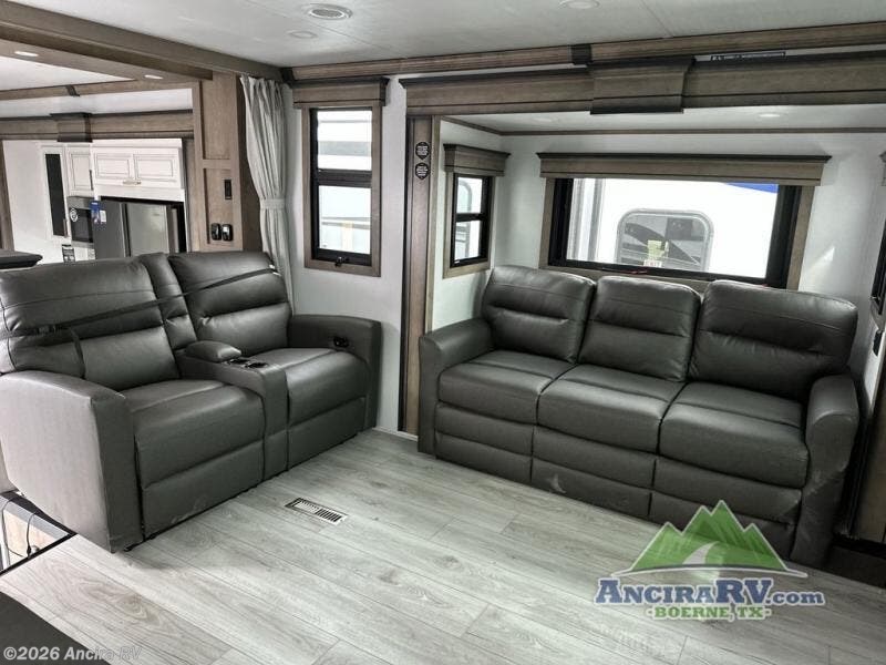 Life will be easier at the campground in this fifth wheel with a bath and a half! The full rear bathroom has a 48" x 30" fiberglass shower with a seat and skylight above, a linen closet to keep your towels close, a dual sink vanity for two to get ready at once, and a barn door to close off the master suite. The bedroom also has a king bed slide with storage underneath across from a dresser with a 32" Smart TV and wardrobe, as well as a large closet with stackable washer and dryer prep. The chef can prepare their best meals with the kitchen island, convection microwave and 24" range, plus there is a pantry/buffet and a free standing legless dinette to enjoy your meals at. The front living area will have you feeling right at home with the front entertainment center that has a telescoping 50" Smart TV, a 5,000 BTU decorative fireplace heater, and storage on either side. There is also opposing hide-a-bed sofa slides for extra sleeping spaces and power theater seating for even more comfort!