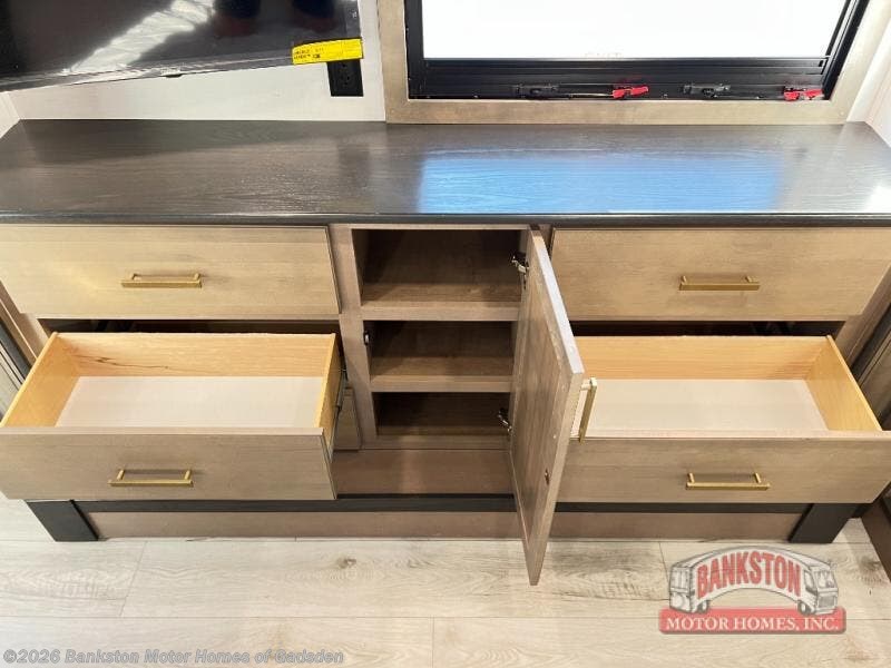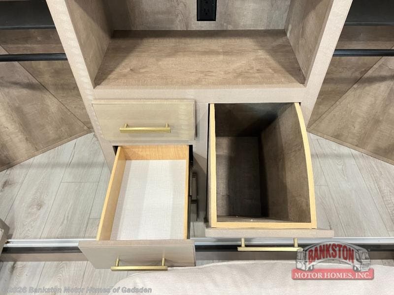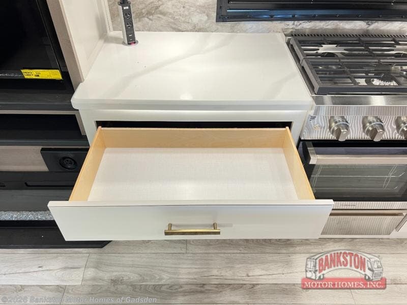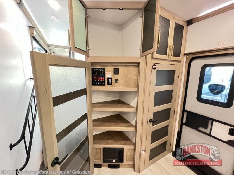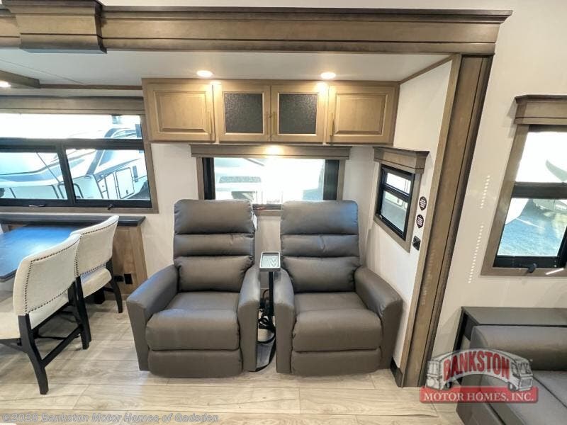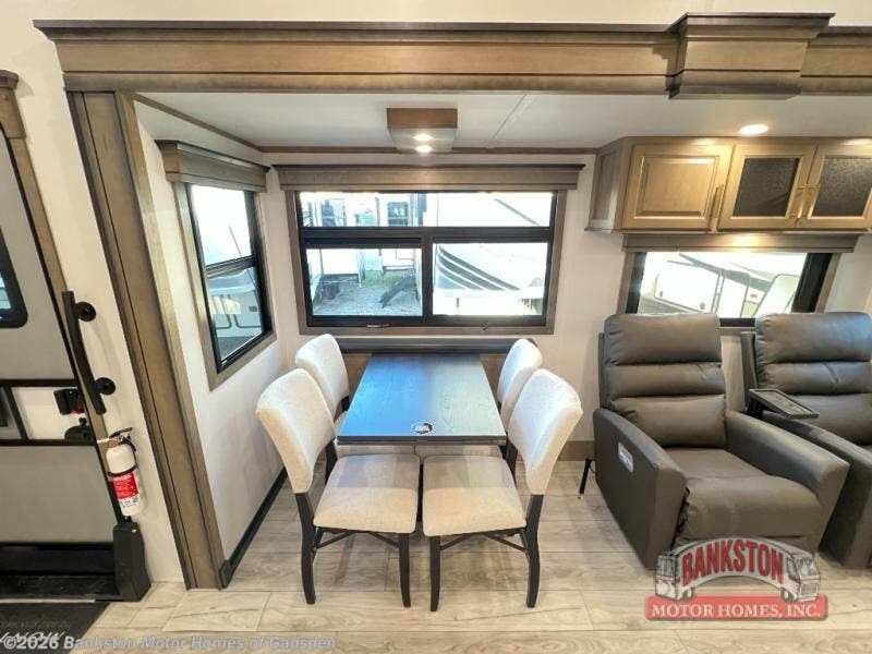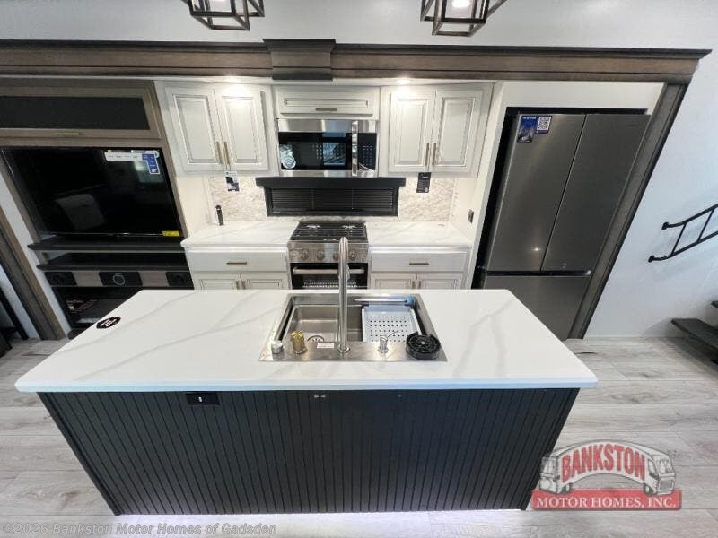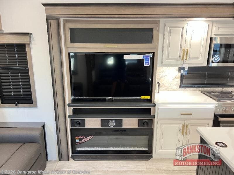 Enjoy a home away from home with this fifth wheel! The front private bedroom has a king bed slide with storage underneath across from a 32" Smart HDTV with drawers below it, a large front closet, and a barn door to close it all off. Freshen up each morning in the full bathroom with the 48" x 30" fiberglass shower with a seat and skylight above for more natural lighting as you get ready at the dual sink vanity. The kitchen has everything you need to prepare your best meals including extra countertop space on the kitchen island and even a closet with washer/dryer prep so you can quickly grab a clean dish towel. Enjoy your meals at the free standing legless dinette and then relax on the rear hide-a-bed sofa or the power theater seating across from the entertainment center with a 5,000 BTU decorative fireplace heater and 50" Smart HDTV to watch your favorite movies!