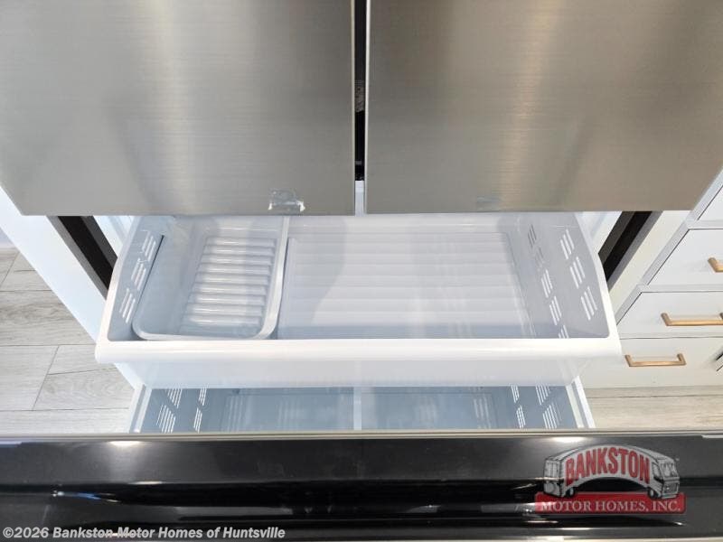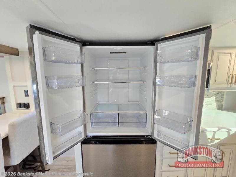 The perfect RV when you like to take "home"' with you when you travel! This Montana fifth wheel gives you the space you want and it feels like home with plenty of features to love and keep you comfortable when you are out enjoying your adventures. Four slides in total give each space plenty of room, the raised front kitchen has everything you need to cook up meals and snacks just like at home. An 18 cu. ft. residential refrigerator with ice maker, convection microwave oven, and large sink, plus pantry space will make any chef happy. The mid-coach area just inside the door features a living room with dual opposing hide-a-bed slides as well as powered theater seating and a fireplace with Smart TV opposite. Step up in back to a bedroom with a king bed slide, a dresser, and closet featuring prep for a stackable washer and dryer. A sliding barn door leads into the rear spacious master bath featuring a 48" x 30" shower, a toilet, linen storage and a vanity with two sinks!
