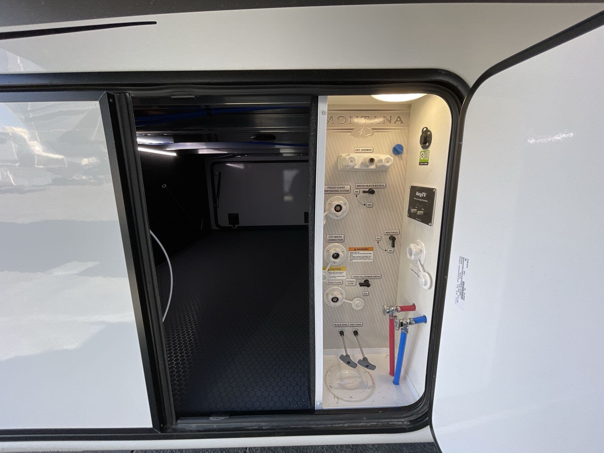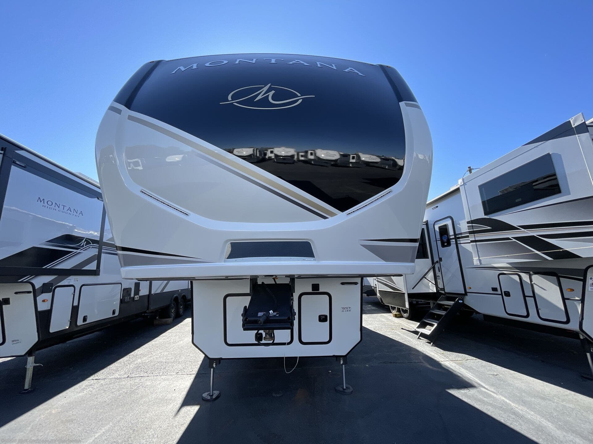 The perfect RV when you like to take "home"' with you when you travel! This Montana fifth wheel gives you the space you want and it feels like home with plenty of features to love and keep you comfortable when you are out enjoying your adventures. Five slides in total give each space plenty of room, the raised rear kitchen has everything you need to cook up meals and snacks just like at home. An 18 cu. ft. residential refrigerator with an ice maker, convection microwave oven and large sink, plus pantry space will make any chef happy. The mid-coach space just inside the door features a living room and half bath for convenience. There is also a dinette with storage within the roadside slide. Step up in front through a sliding barn door to a double slide space with a king bed and dresser. A second sliding barn door leads into the front spacious master bath featuring dual sinks, a 48" x 30" shower, and a large walk-in wardrobe with washer and dryer prep!