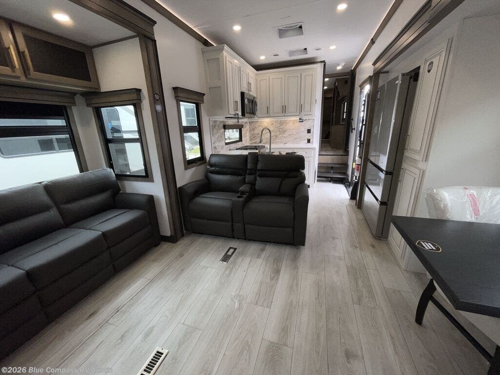 Traveling with friends and family is easier than ever with this fifth wheel in tow! There are two master suites; one for you and one for guests! The front master suite includes a king bed slide out, a front closet with a hamper, plus stackable washer/dryer prep if you want the option to make wash day easier. There is also convenient underbed storage, a dresser with a Smart HD TV, plus a private entrance into the dual entry bath. Head to the rear master suite to find just as much comfort with a queen bed slide out, dual closets and a dresser, plus a full rear bath where the second entry door is located. There is also a loft area above this room with three bunk mats for more campers! The middle kitchen and living area includes many comforts, like the power theater seating across from the 50" Smart TV and hide-a-bed sofa, plus the U-shaped kitchen with ample counter space and a 24" range. You'll also find food storage in the pantry and 18 cu. ft. residential refrigerator with an ice maker, or you can choose the slightly larger optional 20 cu. ft. refrigerator!