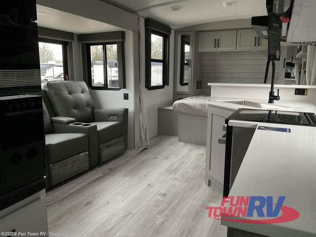 This single slide out travel trailer is perfect for the group of four looking for adventure. There is a queen bed up front with dual wardrobe nightstands, a TV, and a laundry chute that lets you throw dirty clothes straight into the pass-thru storage. The Do-More U-shaped dinette will be perfect for game night, dining, and extra sleeping space for guests. A full kitchen includes a three burner gas range and microwave oven to cook meals, along with a 10 cu. ft. 12V refrigerator for food storage. There is also an entryway pantry/closet for even more storage. And everyone can freshen up in the rear corner bath each day instead of using the camp's facilities!
