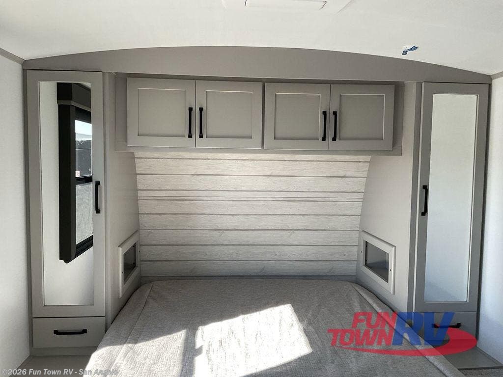 With dual entry doors on this travel trailer, you can enter in through the front master bedroom or the main living area and kitchen. The walk-thru bath will be easily accessible for everyone, and your guests can sleep on the dinette table or tri-fold sofa sleeper. If you're not needing the extra sleeping space, just choose the optional theater seat. A full kitchen with a three burner range and microwave oven will let you make meals each day, and there is added storage for all your kitchen necessities. You'll love the queen bed in the front master bedroom, along with dual wardrobe nightstands and a laundry chute that goes straight into the pass-thru storage for easy clean up.