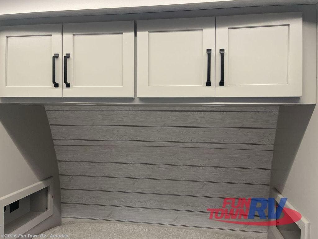 When you enjoy entertaining guests and relaxing both inside and outside at the campgrounds, this trailer has you covered! There is a 20' awning along the exterior, a drop frame pass-through storage to carry larger gear like camping chairs, outdoor tables, fishing poles and such, plus an outside kitchen to make a few meals. The inside is spacious with dual opposing slides in the main living and kitchen area, and the private bunkhouse has a slide out with a sofa sleeper and bunk above. There is a second bunk above an entertainment center that your guests will surely appreciate. You will have a queen bed in the front bedroom, and the full bathroom will keep everyone refreshed. The kitchen has full amenities, plus a kitchen island with a skylight for more natural lighting, a sofa sleeper and booth dinette.