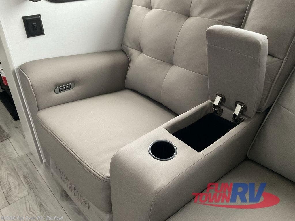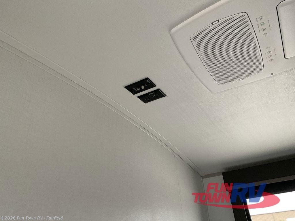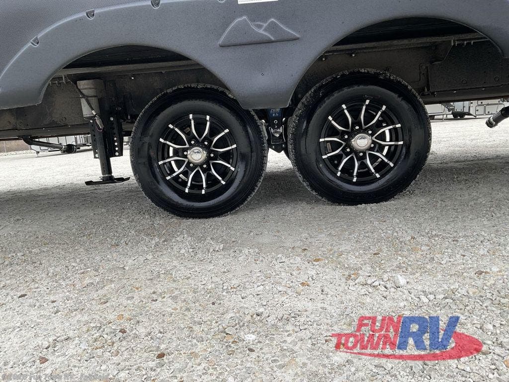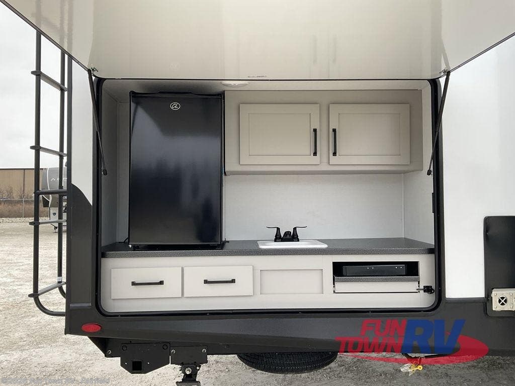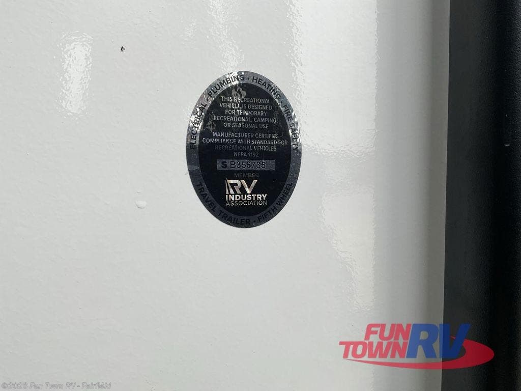 When you enjoy entertaining guests and relaxing both inside and outside at the campgrounds, this trailer has you covered! There is a 20' awning along the exterior, a drop frame pass-through storage to carry larger gear like camping chairs, outdoor tables, fishing poles and such, plus an outside kitchen to make a few meals. The inside is spacious with dual opposing slides in the main living and kitchen area, and the private bunkhouse has a slide out with a sofa sleeper and bunk above. There is a second bunk above an entertainment center that your guests will surely appreciate. You will have a queen bed in the front bedroom, and the full bathroom will keep everyone refreshed. The kitchen has full amenities, plus a kitchen island with a skylight for more natural lighting, a sofa sleeper and booth dinette.
