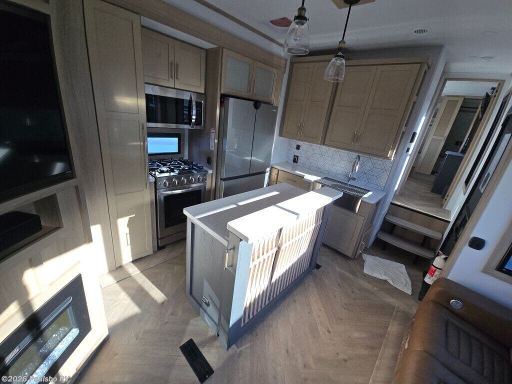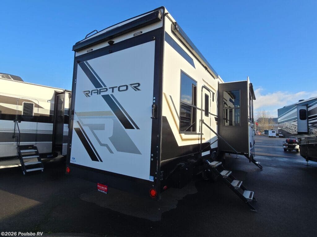 Introducing the 2025 Keystone Raptor 352, an exceptional toy hauler designed for avid RV enthusiasts who appreciate both adventure and comfort. This remarkable RV is perfect for families or groups, comfortably accommodating up to seven people. With an impressive length of 39.04 feet and a robust Gross Vehicle Weight Rating of 17,000 pounds, this vehicle is built to handle your outdoor escapades. The new condition reflects its pristine quality, ensuring that you will experience the joys of RVing without compromise. The living area of the Raptor 352 is designed with flexibility in mind, offering spacious accommodations that make it feel like a home away from home. The RV features three slide-outs, enhancing the interior living space and allowing for a more open ambiance. Additionally, it comes equipped with dual awnings, providing ample shade and an inviting outdoor space for gatherings. The front and rear power leveling jacks add convenience, making setup a breeze, no matter where your adventures take you. This toy hauler combines functionality with comfort, featuring upgraded audio systems for entertainment during downtime and plenty of storage for all your gear. Whether you are heading to the mountains for biking, the beach for surfing, or just exploring the outdoors, the 2025 Keystone Raptor 352 is ready to deliver an unparalleled RV experience. Stock#: M3556, VIN: 4YDFRPT26SF800062