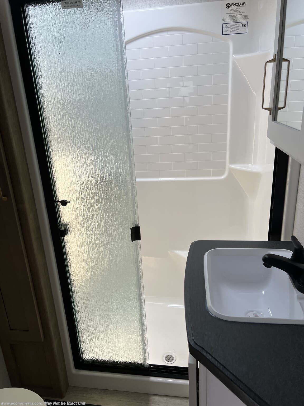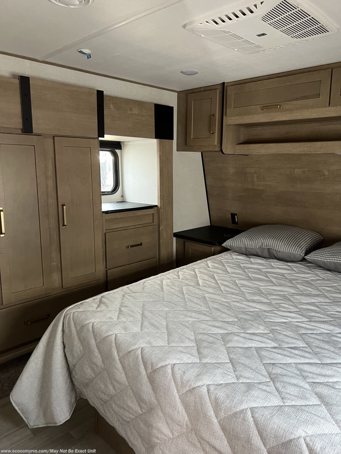- Medicine cabinet; queen bed; roof vents; shower; toilet for home-like comfort