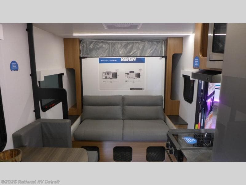 The Reign travel trailers by Keystone are premium single-axle units that are sure to make an impression at the campground. Each one is built with an exclusive automotive-finished aluminum exterior, a walkable roof, and a 100% composite floor for added durability. There are also tinted safety glass windows, quick drop stabilizer jacks, and an exterior shower with hot and cold water. The European inspired interior design is unique and cozy, and the 78" interior height will give you plenty of space to move about. You will also enjoy the ultra bright LED light strip and solid surface countertops in the kitchen, along with blackout night shades, and many more interior comforts.