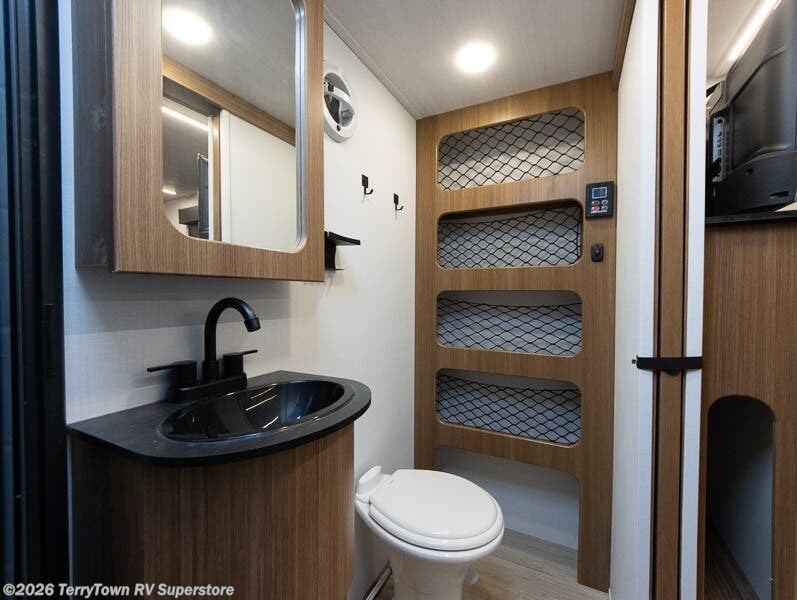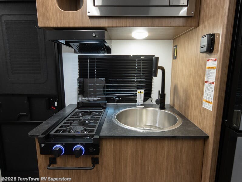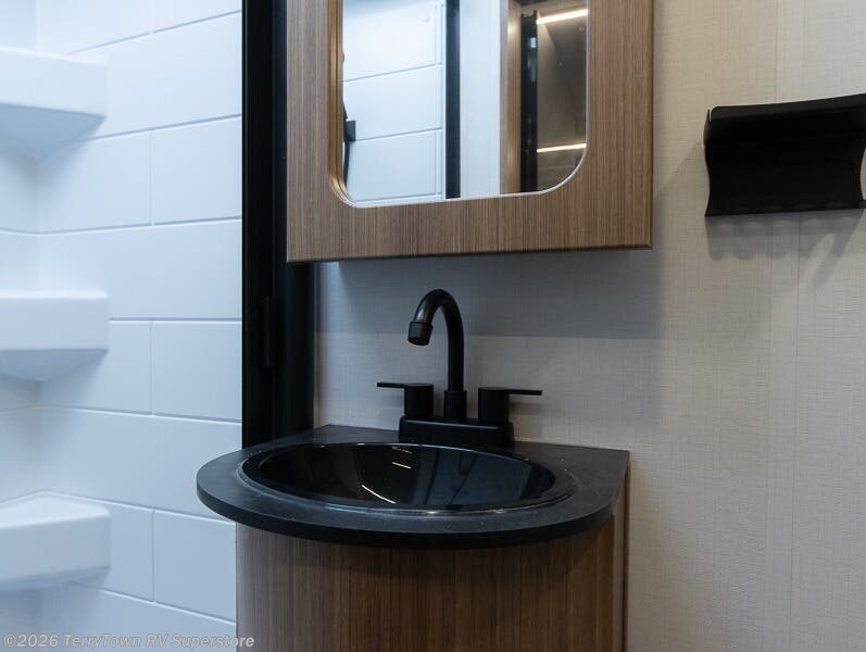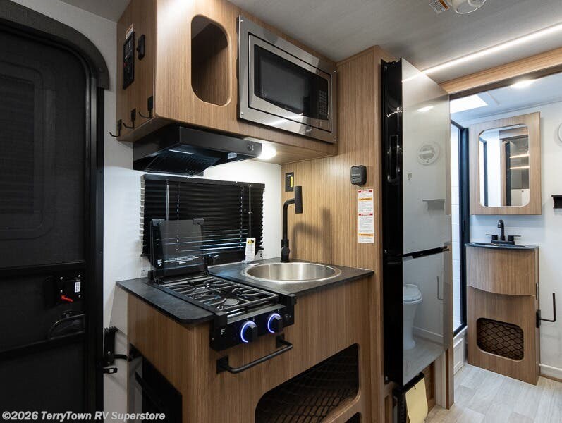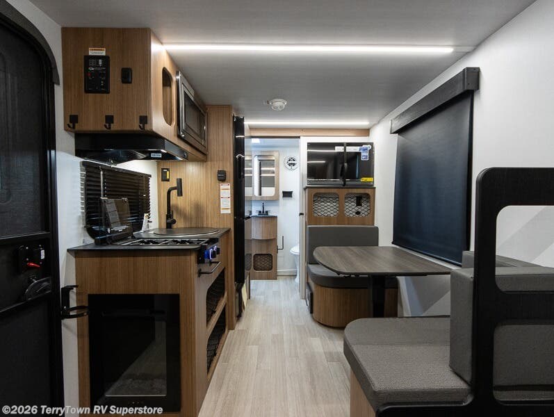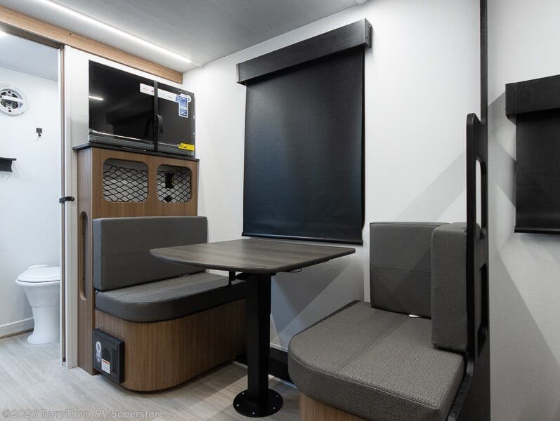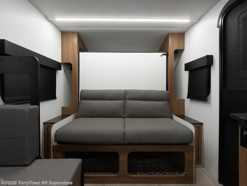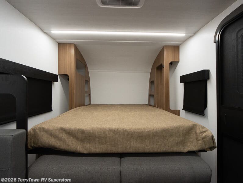 This single axle trailer is both cozy and versatile since there is a fold down sofa/Murphy bed up front! Now you can easily convert seating space into sleeping space, plus there are dual bedside closets to keep your things tidy. A two burner cooktop and air fryer/convection microwave will let you cook meals each day, and a booth dinette provides a place to dine together. You can also choose to add the optional flip-up bunk above the dinette if you need more sleeping space. And don't overlook the full rear bath that will allow you to freshen up without having to leave your camper!