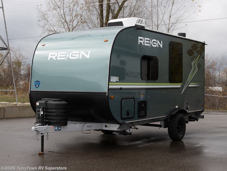 The Reign travel trailers by Keystone are premium single-axle units that are sure to make an impression at the campground. Each one is built with an exclusive automotive-finished aluminum exterior, a walkable roof, and a 100% composite floor for added durability. There are also tinted safety glass windows, quick drop stabilizer jacks, and an exterior shower with hot and cold water. The European inspired interior design is unique and cozy, and the 78" interior height will give you plenty of space to move about. You will also enjoy the ultra bright LED light strip and solid surface countertops in the kitchen, along with blackout night shades, and many more interior comforts.
