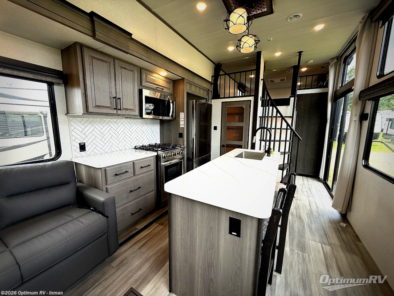 This destination trailer is so accommodating, you may just want to camp all year long! The owners will have the front bedroom all to themselves with a king bed slide out, dresser, and master closet so everything has a place. Above this room is the front loft with stairs that includes three 39" x 74" beds/sleeping spaces and storage shelves, making it perfect for little ones! The spacious full rear bath includes dual bath sinks, a large shower with a seat, and a closet with washer/dryer prep if you want to add these appliances. And just outside the bath, you'll find the second set of stairs that leads to the rear loft with a 54" x 81" bed, an entertainment center, and storage shelves for your guests. During the day, everyone can meet in the combined living area and kitchen that features a large slide for more space, a sectional sofa, a kitchen island with four barstools, plus an entertainment center with a fireplace!