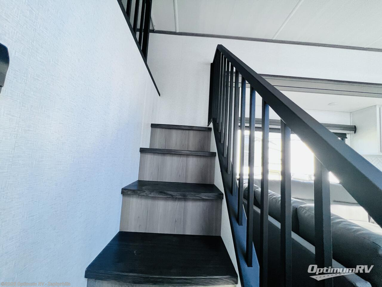This destination trailer is so accommodating, you may just want to camp all year long! The owners will have the front bedroom all to themselves with a king bed slide out, dresser, and master closet so everything has a place. Above this room is the front loft with stairs that includes three 39" x 74" beds/sleeping spaces and storage shelves, making it perfect for little ones! The spacious full rear bath includes dual bath sinks, a large 48" x 30" shower with a seat, and a closet with washer/dryer prep if you want to add these appliances. And just outside the bath, you'll find the second set of stairs that leads to the rear loft with a 54" x 81" bed, an entertainment center, and storage shelves for your guests. During the day, everyone can meet in the combined living area and kitchen that features a large slide for more space, a sectional sofa, a kitchen island with four barstools, plus an entertainment center with a fireplace!