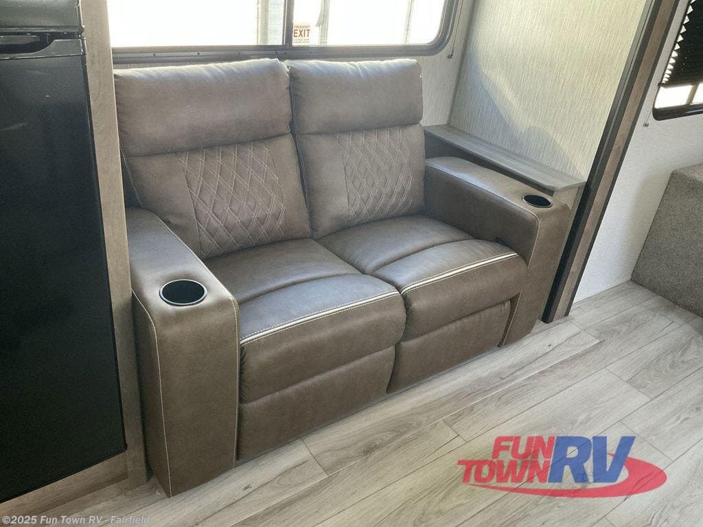 Trips to your favorite camping spot just got better in this open concept travel trailer. The large slide out houses the sofa with an end table, three burner cooktop, refrigerator, and overhead cabinet for storage. You can clean up each day in the rear corner full bath with a sliding door to save on space, and the other rear corner includes the spacious sink and counter space to prep meals. A booth dinette provides a place to dine, play games, and even let a guest sleep over. When you're ready to sleep, the queen bed up front is sure to bring a great night's rest, and there is a privacy curtain here for added convenience. You are sure to appreciate the laundry chute that allows you to throw clothes directly into the pass-through storage!