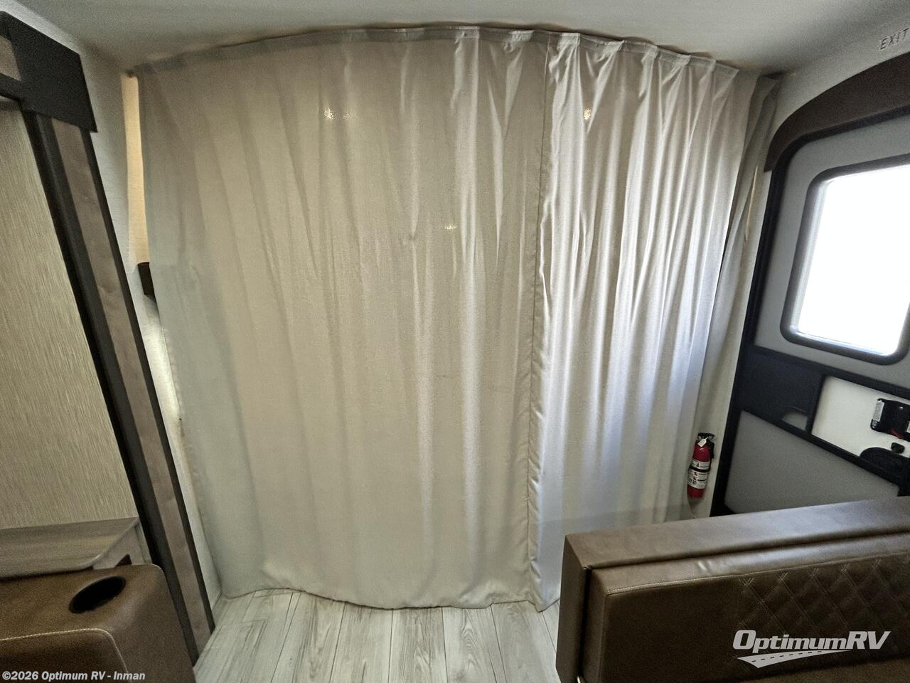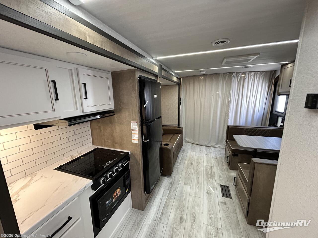 Trips to your favorite camping spot just got better in this open concept travel trailer. The large slide out houses the tri-fold sofa with an end table, three burner cooktop, refrigerator, and overhead cabinet for storage. You can clean up each day in the rear corner full bath with a sliding door to save on space, and the other rear corner includes the spacious sink and counter space to prep meals. A booth dinette provides a place to dine, play games, and even let a guest sleep over. When you're ready to sleep, the queen bed up front is sure to bring a great night's rest, and there is a privacy curtain here for added convenience. You are sure to appreciate the laundry chute that allows you to throw clothes directly into the pass-through storage!