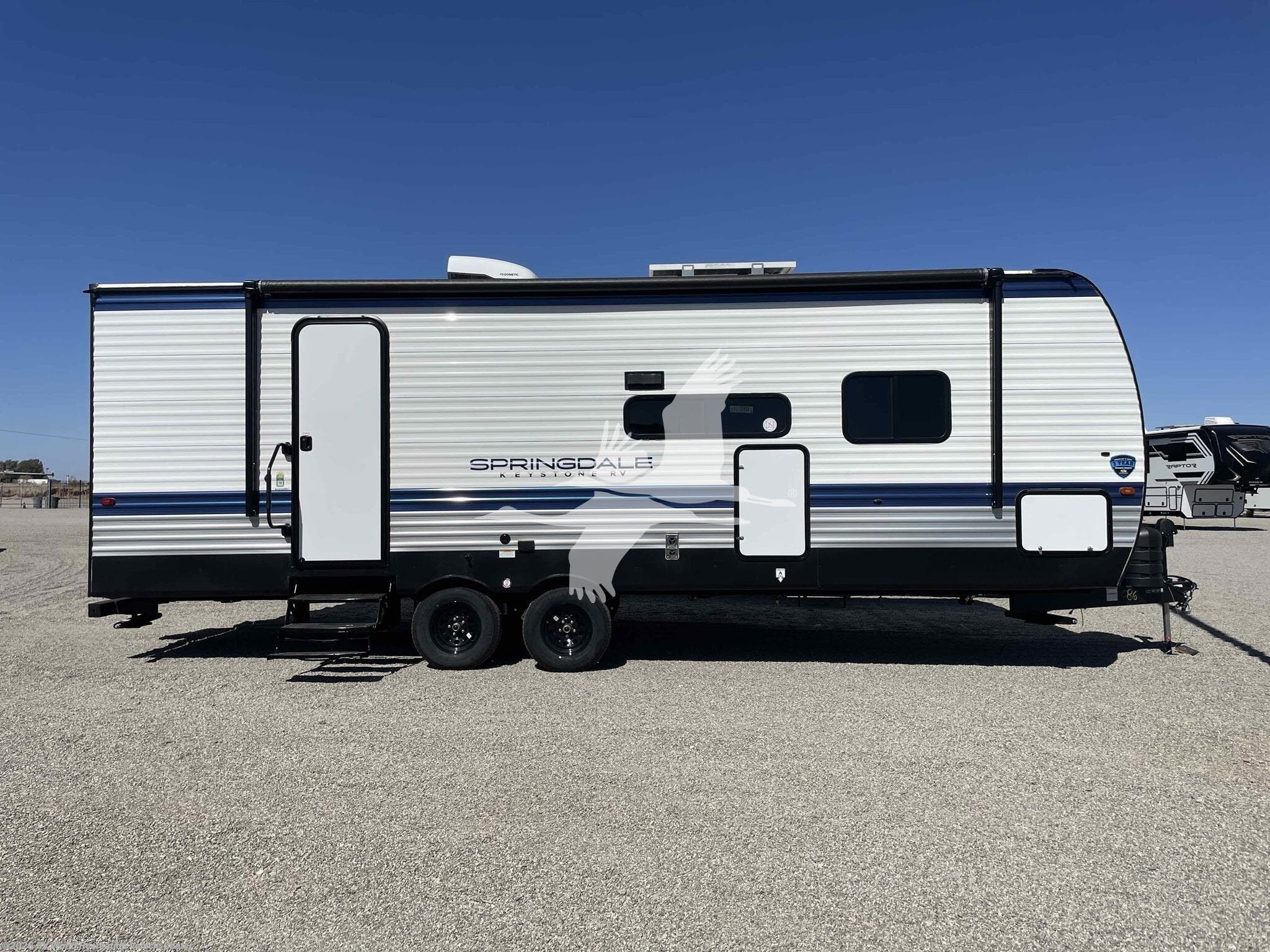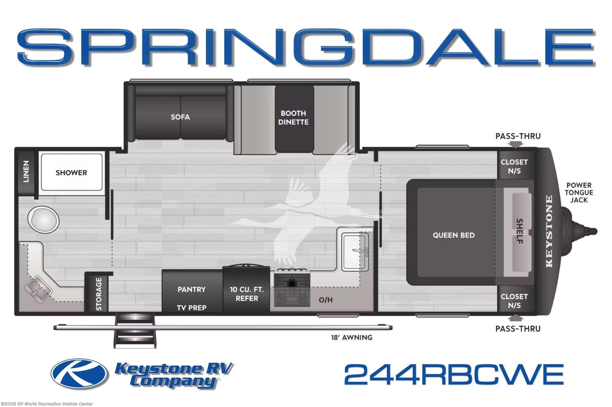 ****Stk#: KE18834.**** ON SPECIAL NOW! Springdale Classics was designed with one main goal, incredible value for your dollar. With Springdale Classic, you will find that you don't have to spend a fortune to have all the conveniences and features that you want. Keystone uses only high-grade building materials and features top brand-name appliances in creating the Springdale. That's why Springdale is one of the most respected names in the RV industry. The 244RBCWE is a 28' 11", rear bathroom model travel trailer, that features a large rear bathroom, a living area with a hide-a-bed sofa and dinette booth that makes into a bed, and a front queen "walk-around" bed, giving this trailer a sleeping capacity of up to 6 people. The 244RBCWE is light weight at under 6,500lbs dry, so it can be pulled by most half ton pickup trucks and SUVs. Check your vehicle owners manual. Other features on this trailer include an 15.5k btu roof A/C, AM-FM-CD-DVD player, microwave/air fryer oven, double door 10cu.ft. refrigerator, electric patio awning, exterior shower, and more.