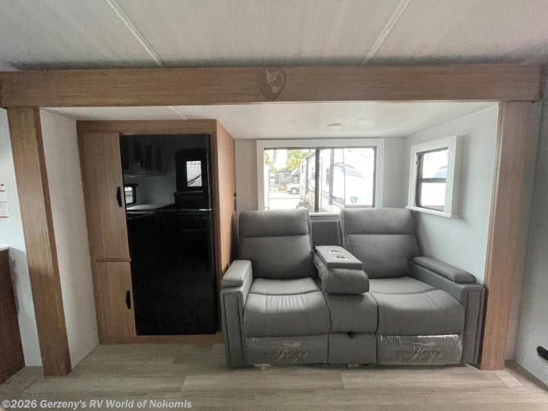 You'll have additional space to stretch out in this travel trailer for eight to ten! Within the super slide you'll find the booth dinette and sofa that will be perfect for meal times, relaxing, and sleeping more guests, and there is an entertainment with TV prep for movie nights. The little ones will love the double-size bunks, and the full bath is close by for easy nighttime use. You'll have the front private bedroom with a queen bed all to yourselves, plus there are dual closets and nightstands for your things. This model also includes an exterior pass-through storage outside and a 16' power awning for protection against the sun!